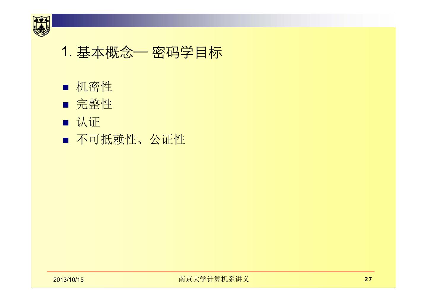 27 . 1. 基本概念— 密码学目标 机密性 完整性 认证 不可抵赖性、公证性 2013/10/15 南京大学计算机系讲义 27