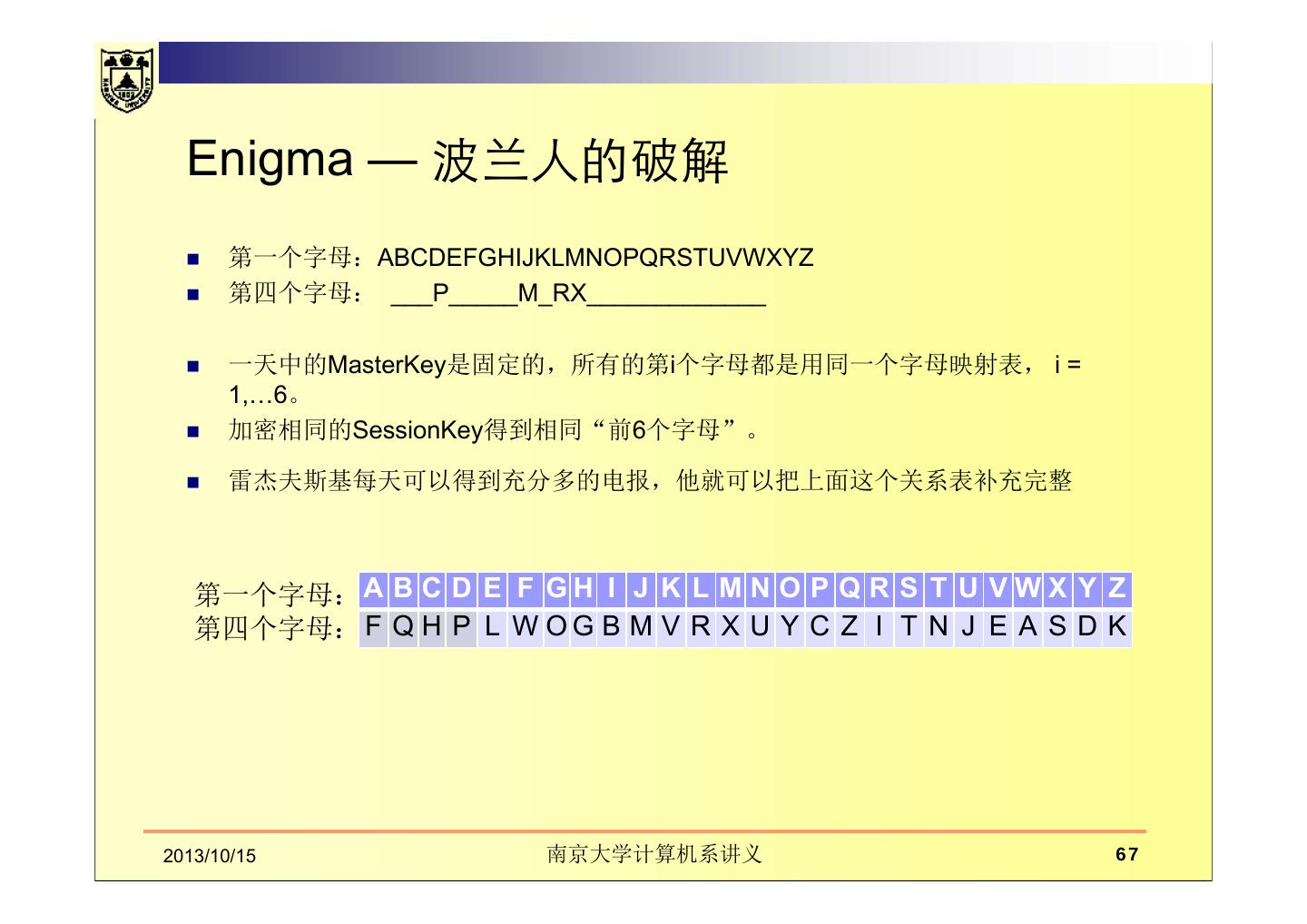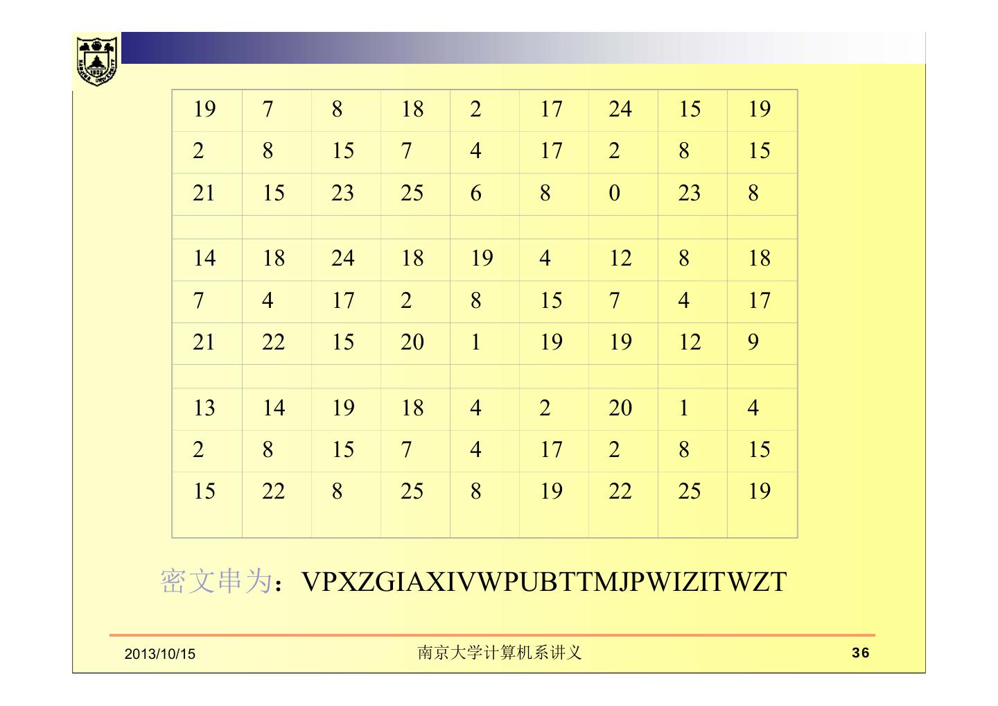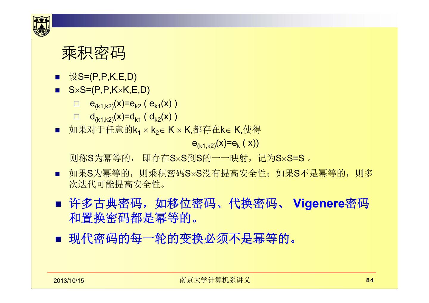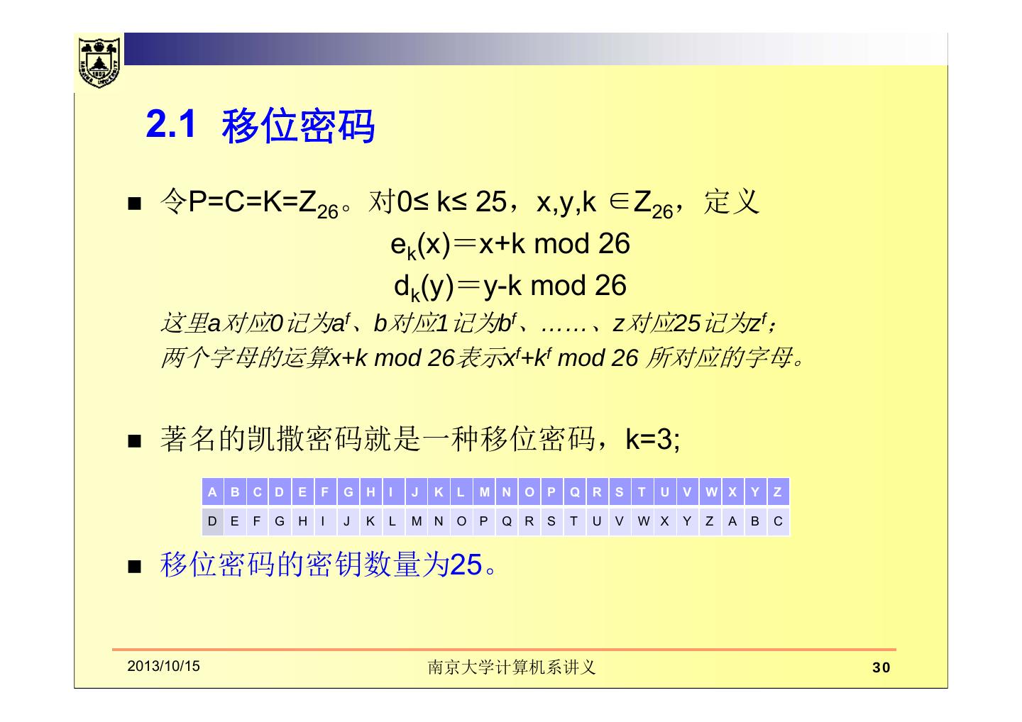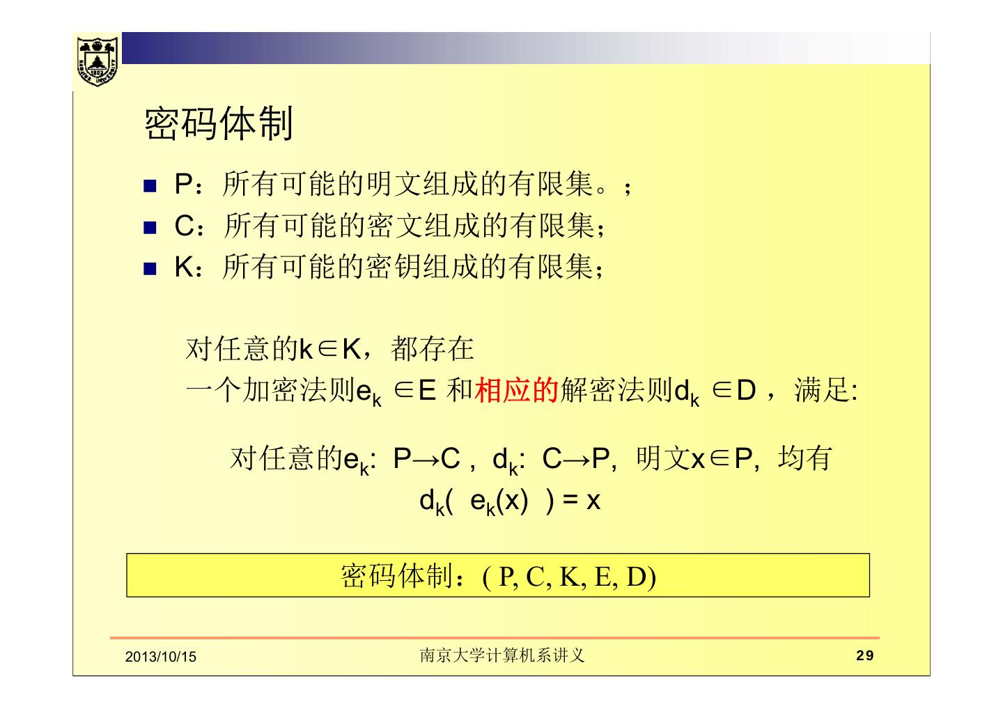 29 . 密码体制 P:所有可能的明文组成的有限集。; C:所有可能的密文组成的有限集; K:所有可能的密钥组成的有限集; 对任意的k∈K,都存在 一个加密法则ek ∈E 和相应的解密法则dk ∈D ,满足: 对任意的ek: P→C , dk: C→P, 明文x∈P, 均有 dk( ek(x) ) = x 密码体制:( P, C, K, E, D) 2013/10/15 南京大学计算机系讲义 29