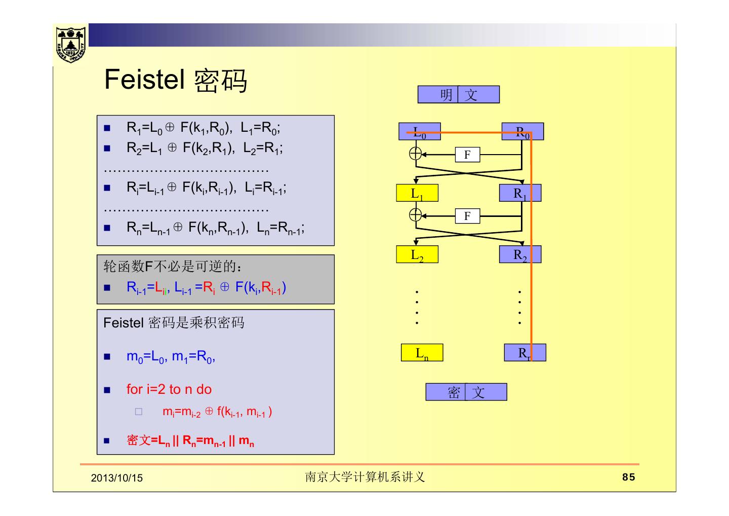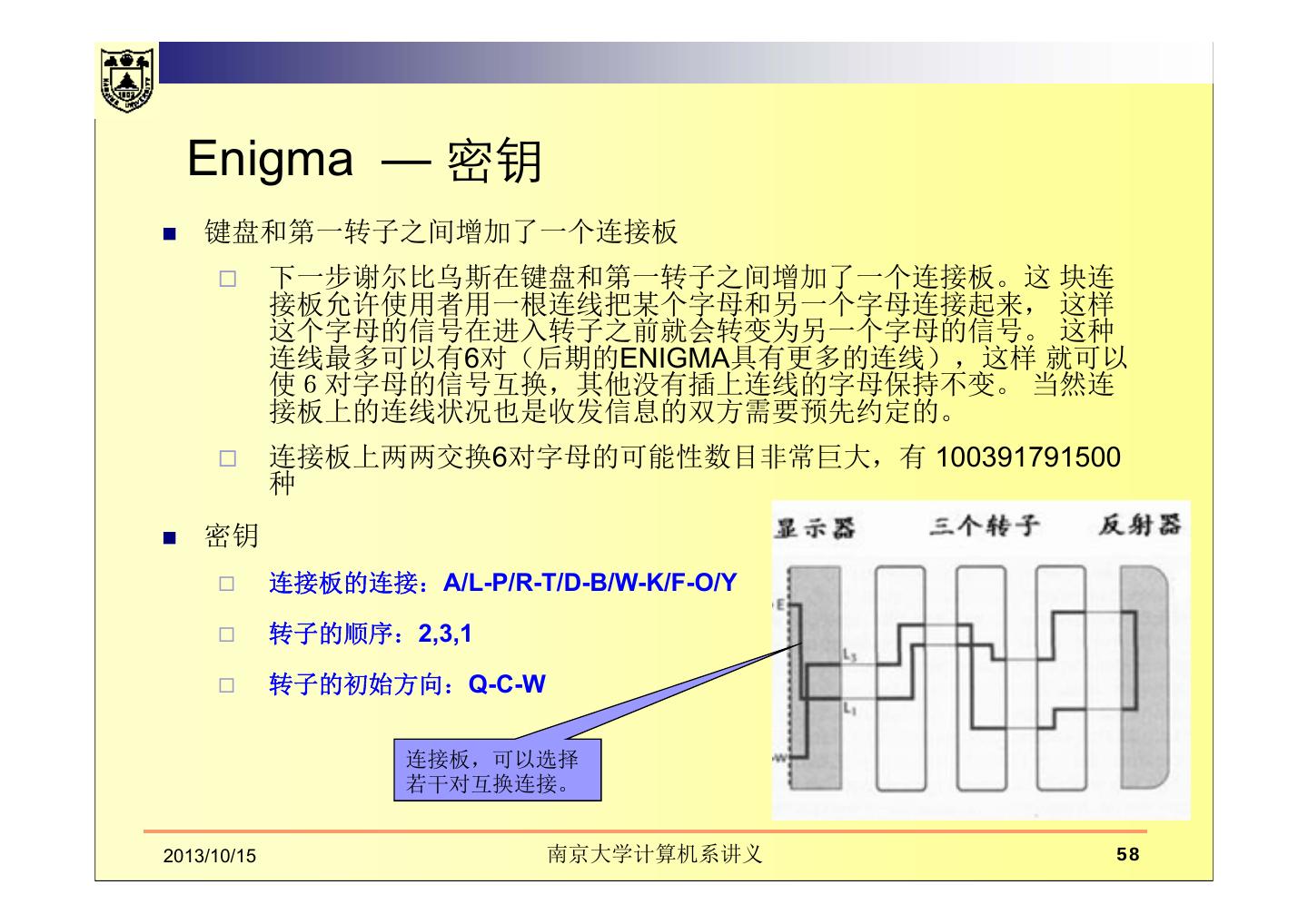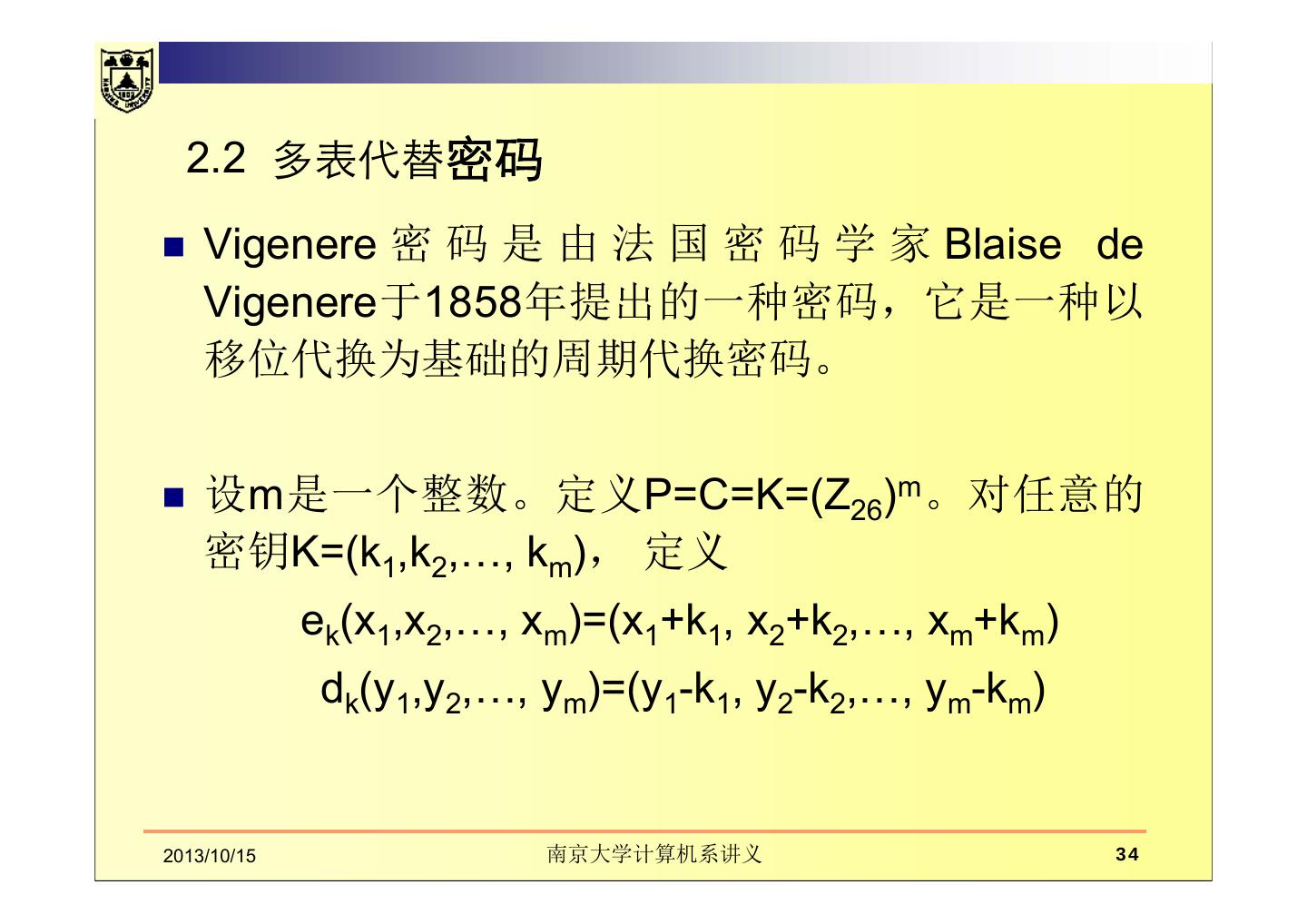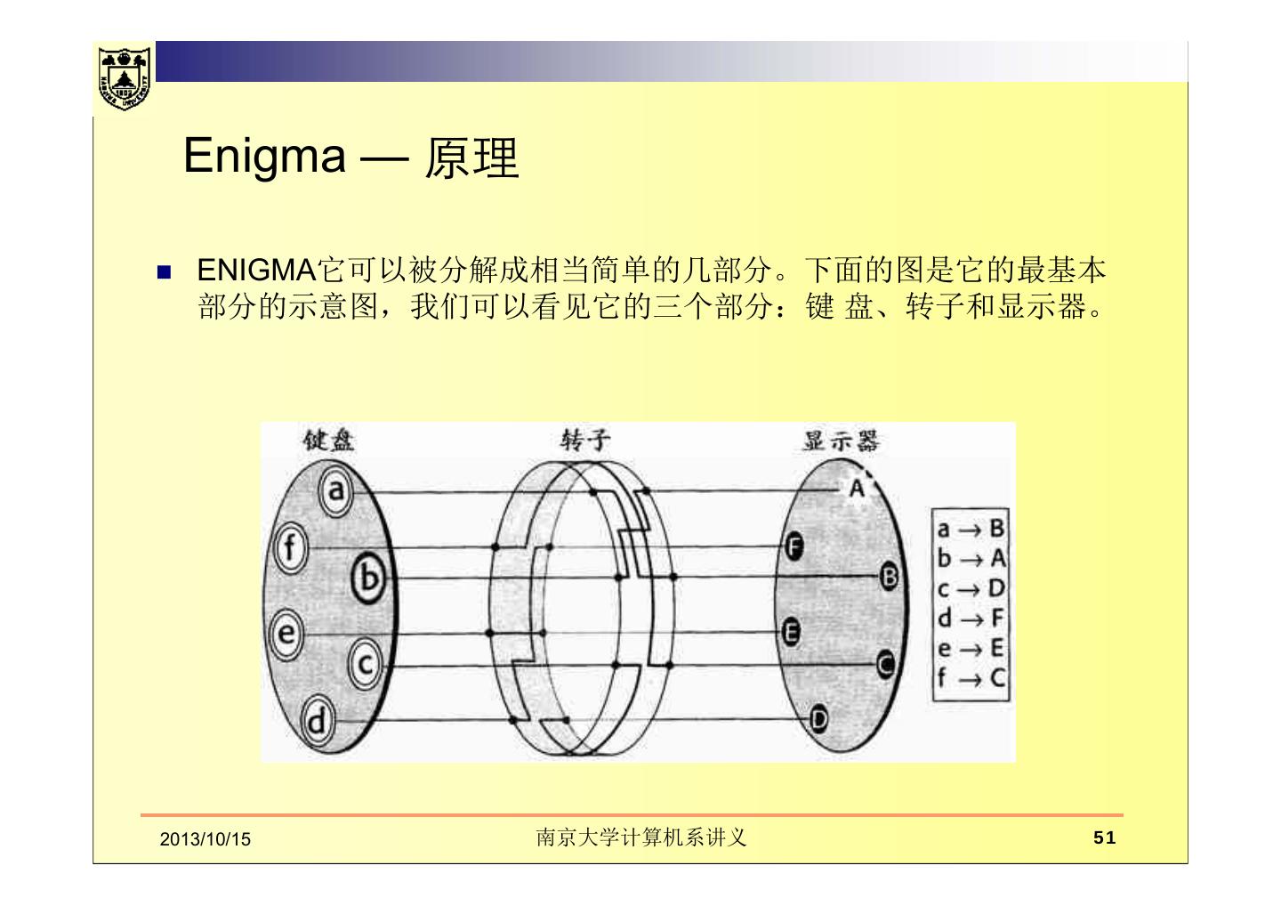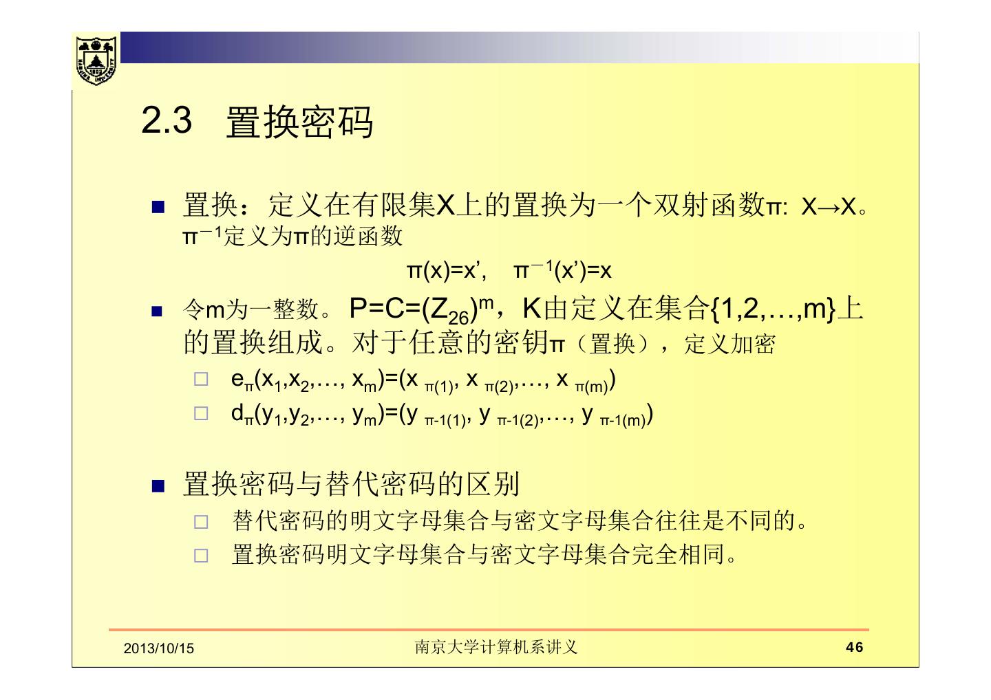 29 . 密码体制 P:所有可能的明文组成的有限集。; C:所有可能的密文组成的有限集; K:所有可能的密钥组成的有限集; 对任意的k∈K,都存在 一个加密法则ek ∈E 和相应的解密法则dk ∈D ,满足: 对任意的ek: P→C , dk: C→P, 明文x∈P, 均有 dk( ek(x) ) = x 密码体制:( P, C, K, E, D) 2013/10/15 南京大学计算机系讲义 29