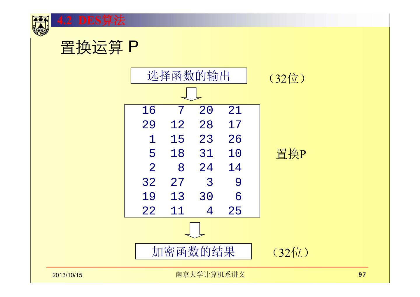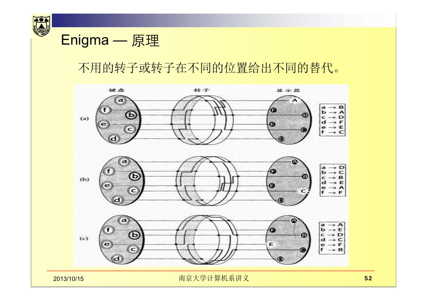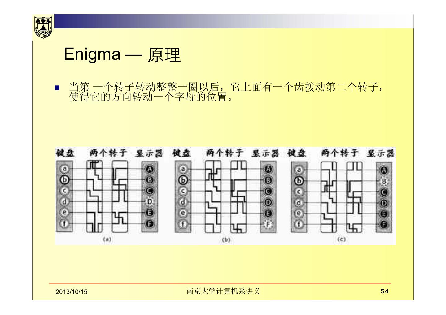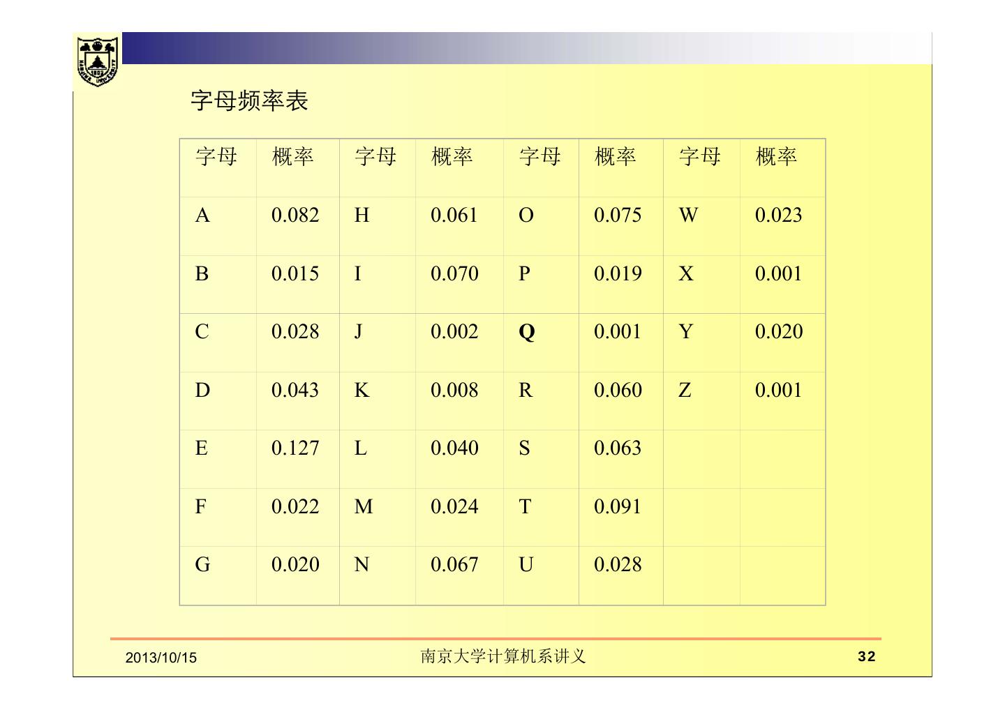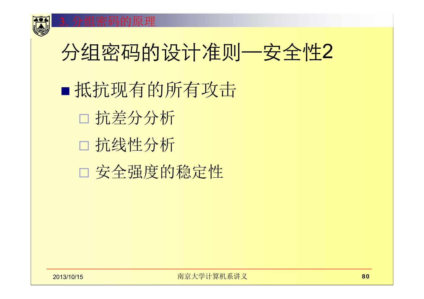 29 . 密码体制 P:所有可能的明文组成的有限集。; C:所有可能的密文组成的有限集; K:所有可能的密钥组成的有限集; 对任意的k∈K,都存在 一个加密法则ek ∈E 和相应的解密法则dk ∈D ,满足: 对任意的ek: P→C , dk: C→P, 明文x∈P, 均有 dk( ek(x) ) = x 密码体制:( P, C, K, E, D) 2013/10/15 南京大学计算机系讲义 29