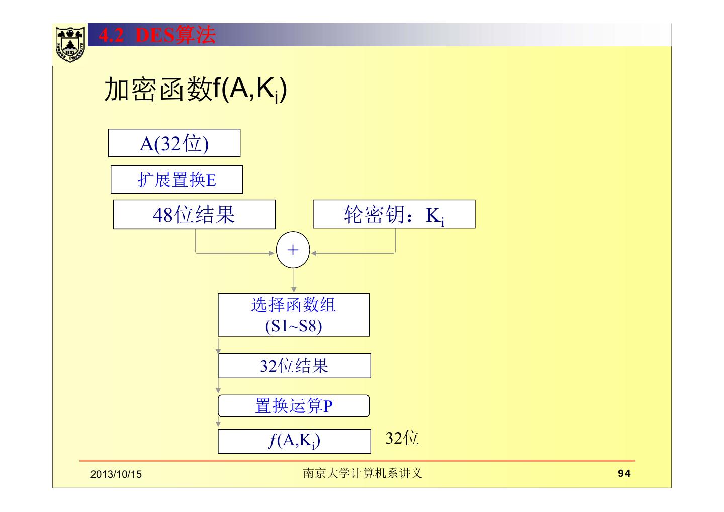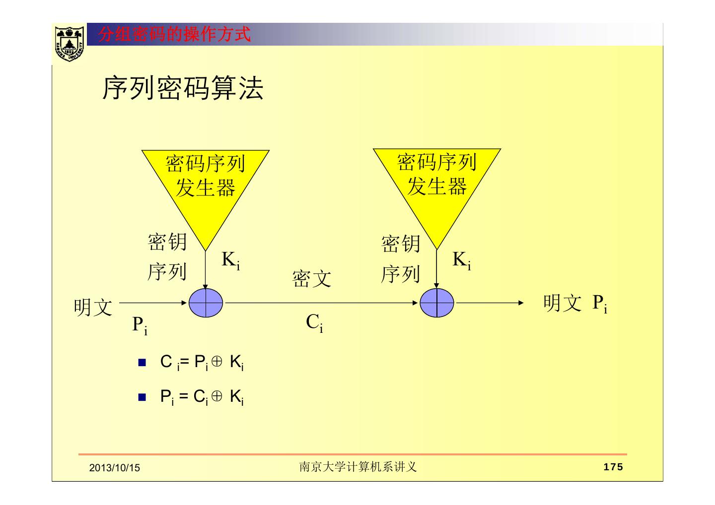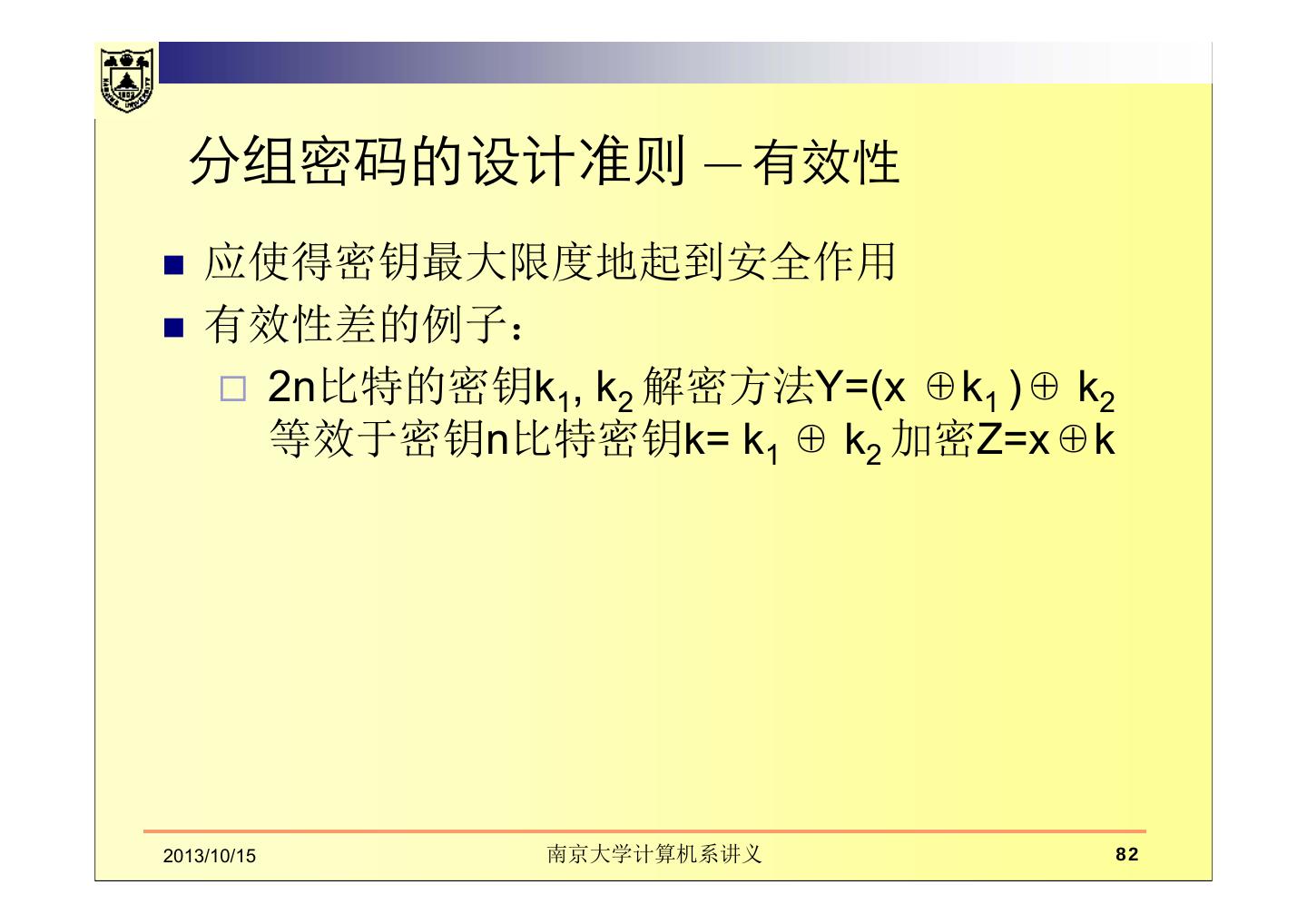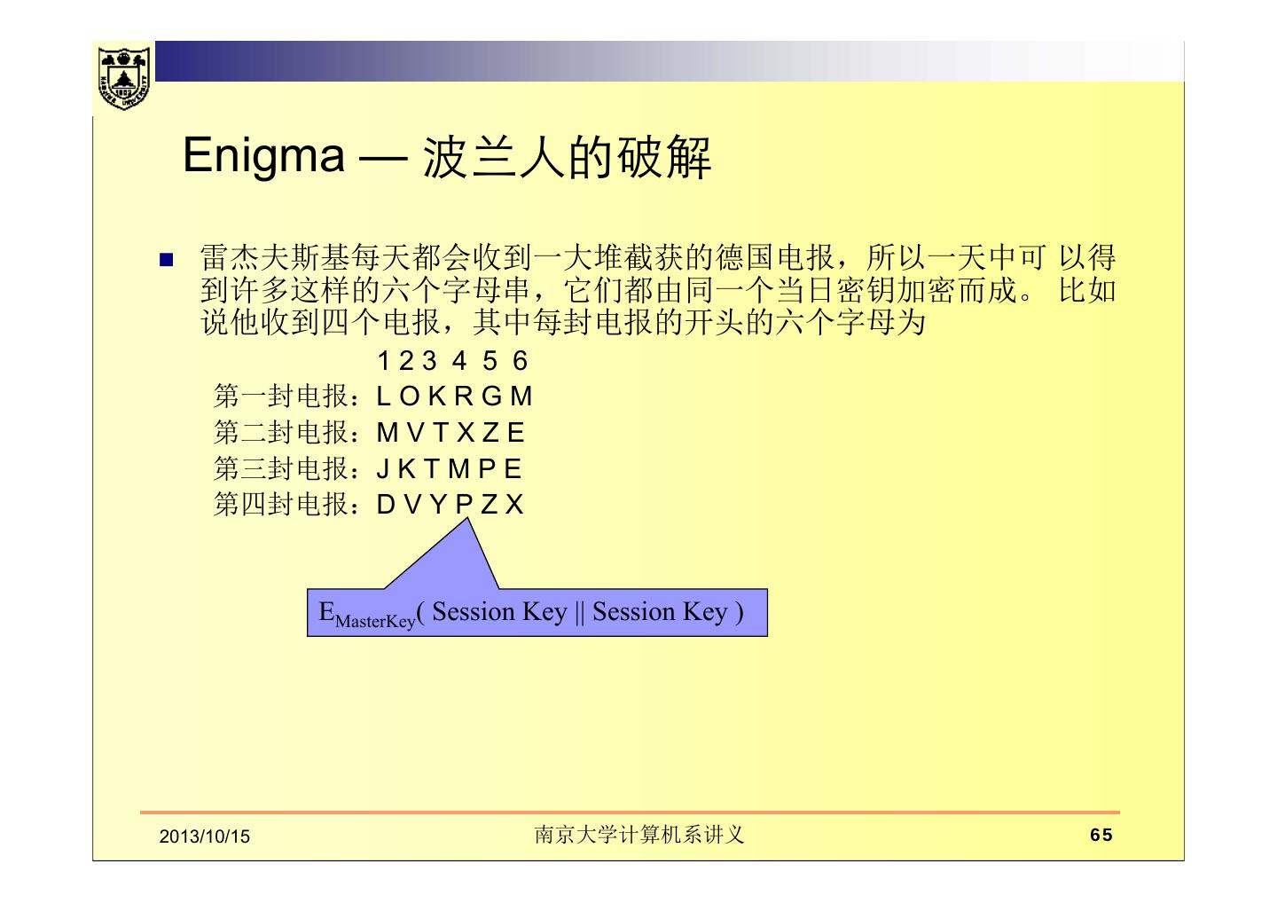 29 . 密码体制 P:所有可能的明文组成的有限集。; C:所有可能的密文组成的有限集; K:所有可能的密钥组成的有限集; 对任意的k∈K,都存在 一个加密法则ek ∈E 和相应的解密法则dk ∈D ,满足: 对任意的ek: P→C , dk: C→P, 明文x∈P, 均有 dk( ek(x) ) = x 密码体制:( P, C, K, E, D) 2013/10/15 南京大学计算机系讲义 29