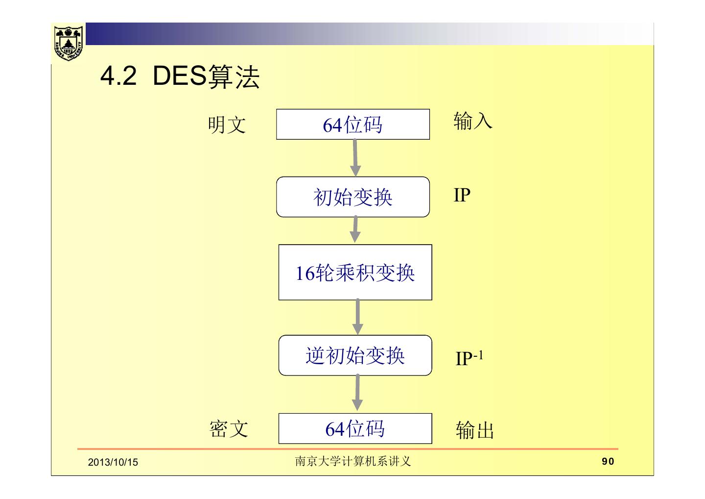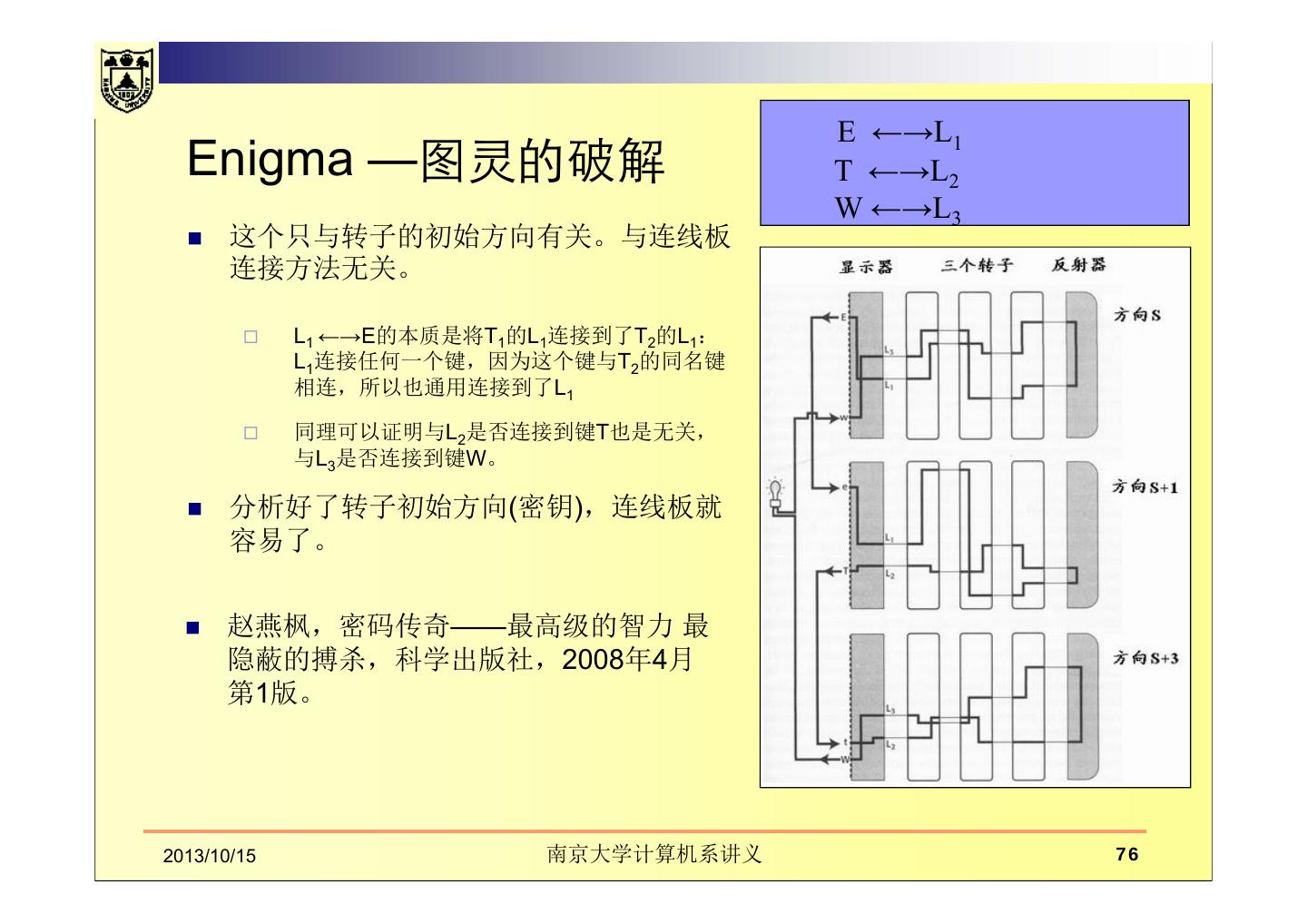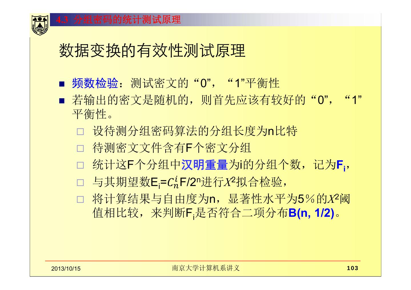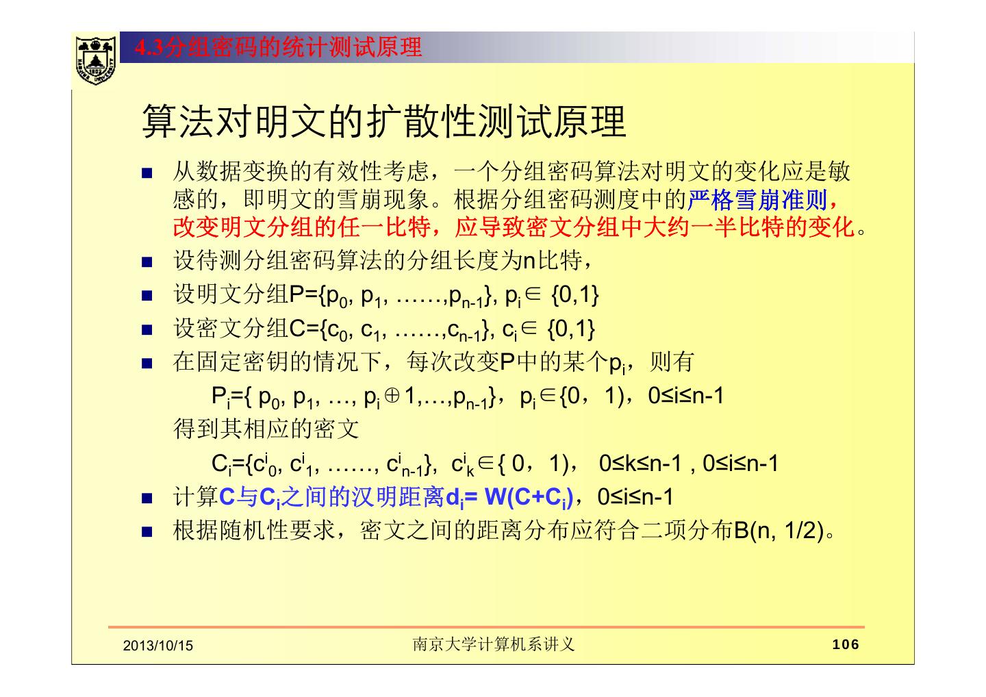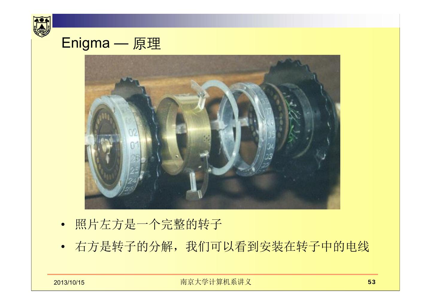 29 . 密码体制 P:所有可能的明文组成的有限集。; C:所有可能的密文组成的有限集; K:所有可能的密钥组成的有限集; 对任意的k∈K,都存在 一个加密法则ek ∈E 和相应的解密法则dk ∈D ,满足: 对任意的ek: P→C , dk: C→P, 明文x∈P, 均有 dk( ek(x) ) = x 密码体制:( P, C, K, E, D) 2013/10/15 南京大学计算机系讲义 29
