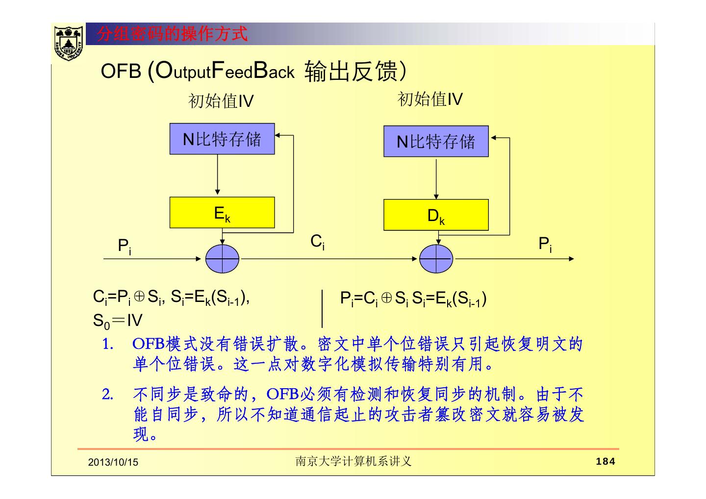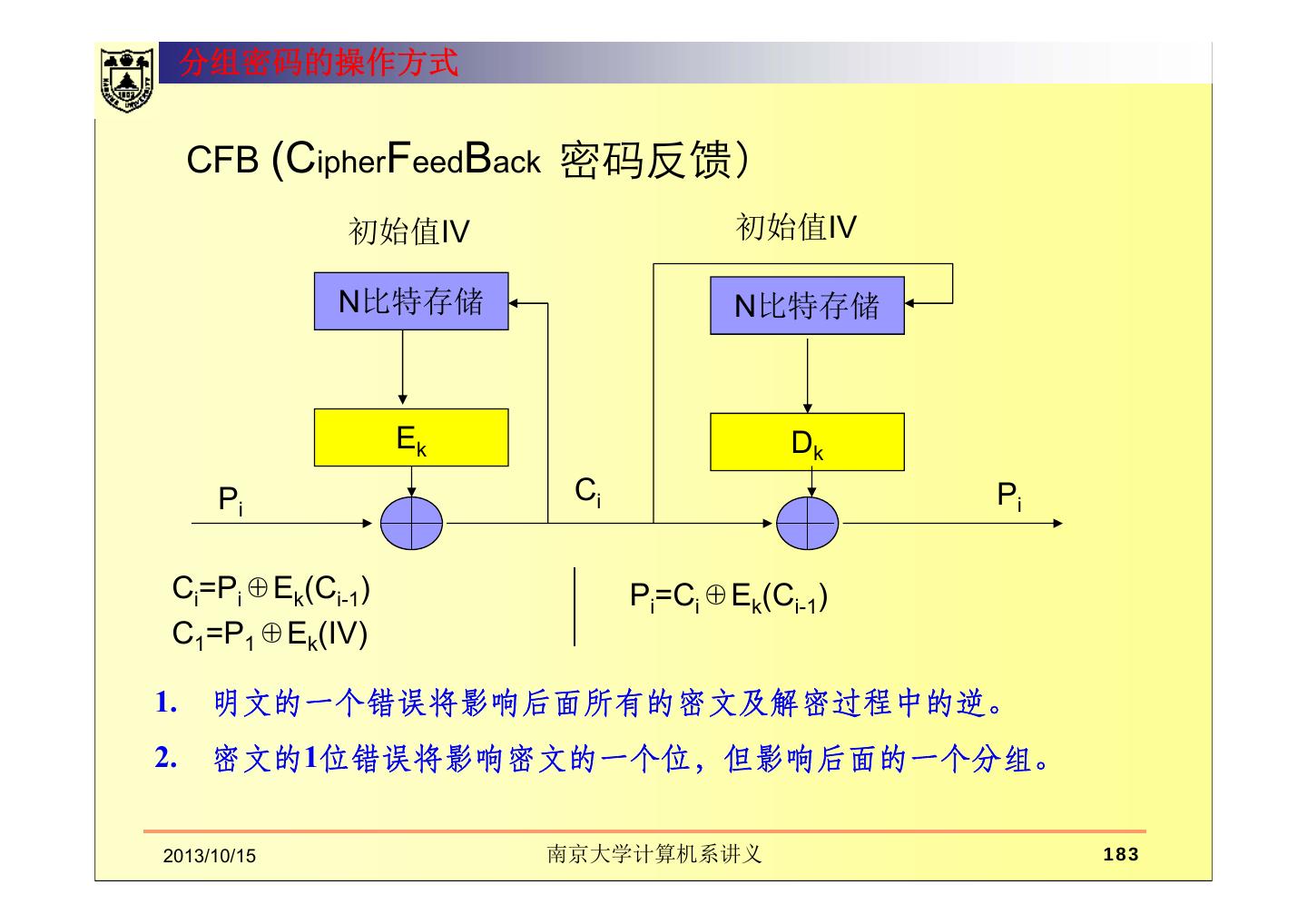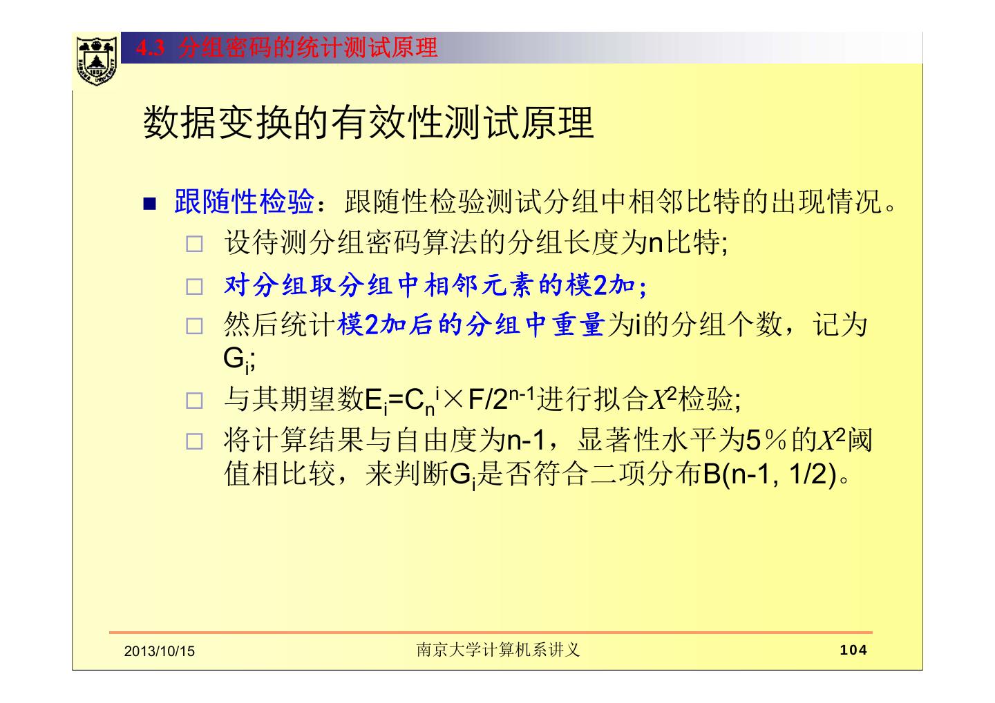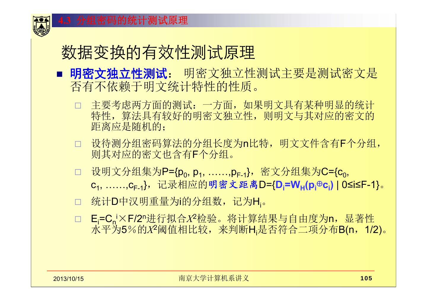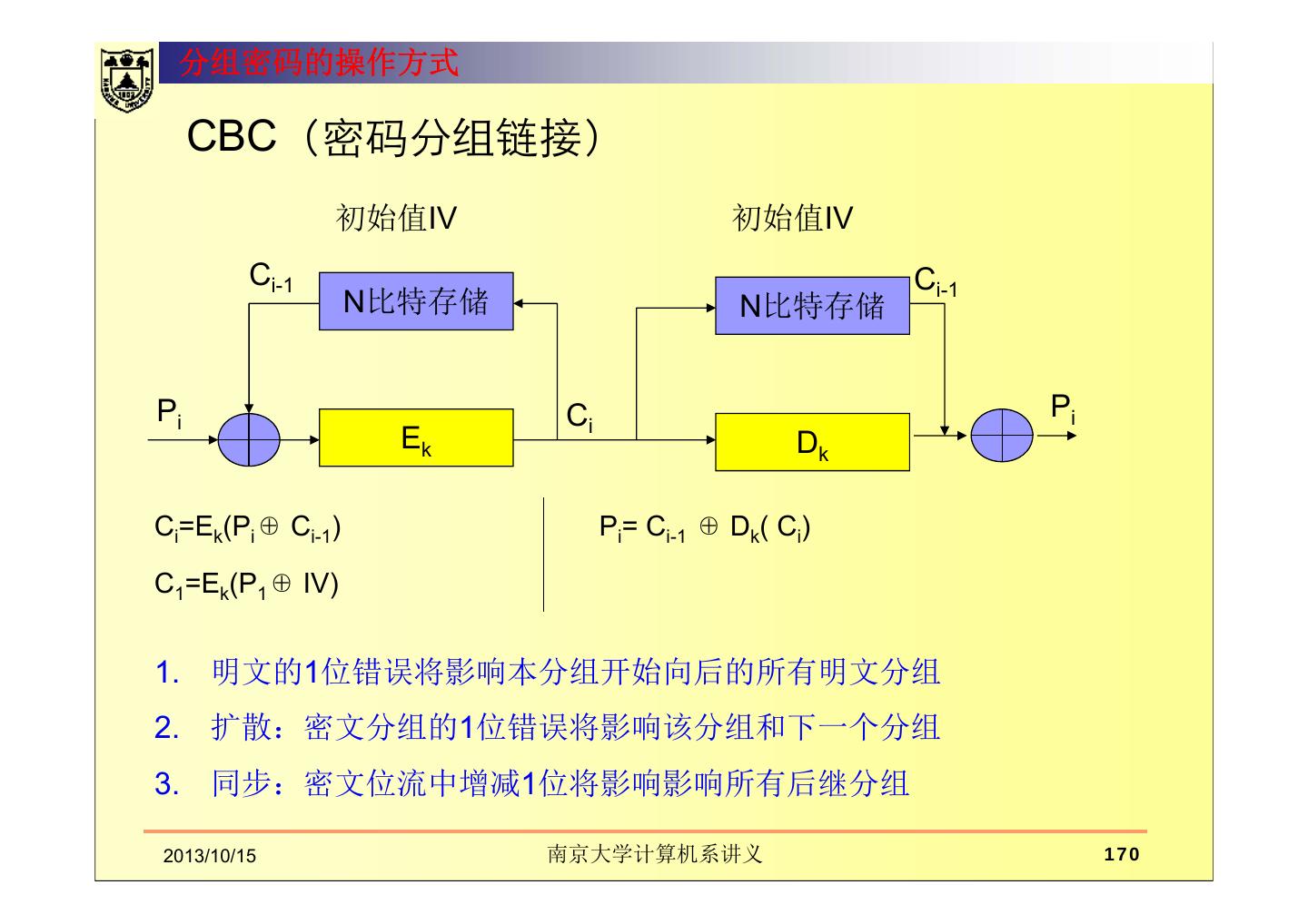 29 . 密码体制 P:所有可能的明文组成的有限集。; C:所有可能的密文组成的有限集; K:所有可能的密钥组成的有限集; 对任意的k∈K,都存在 一个加密法则ek ∈E 和相应的解密法则dk ∈D ,满足: 对任意的ek: P→C , dk: C→P, 明文x∈P, 均有 dk( ek(x) ) = x 密码体制:( P, C, K, E, D) 2013/10/15 南京大学计算机系讲义 29