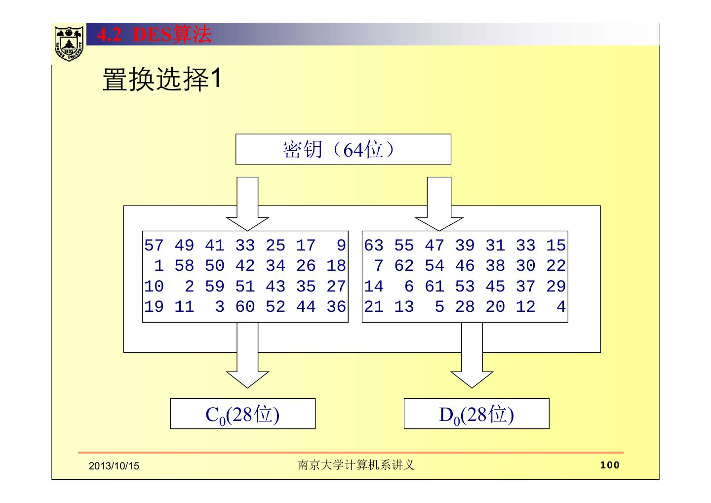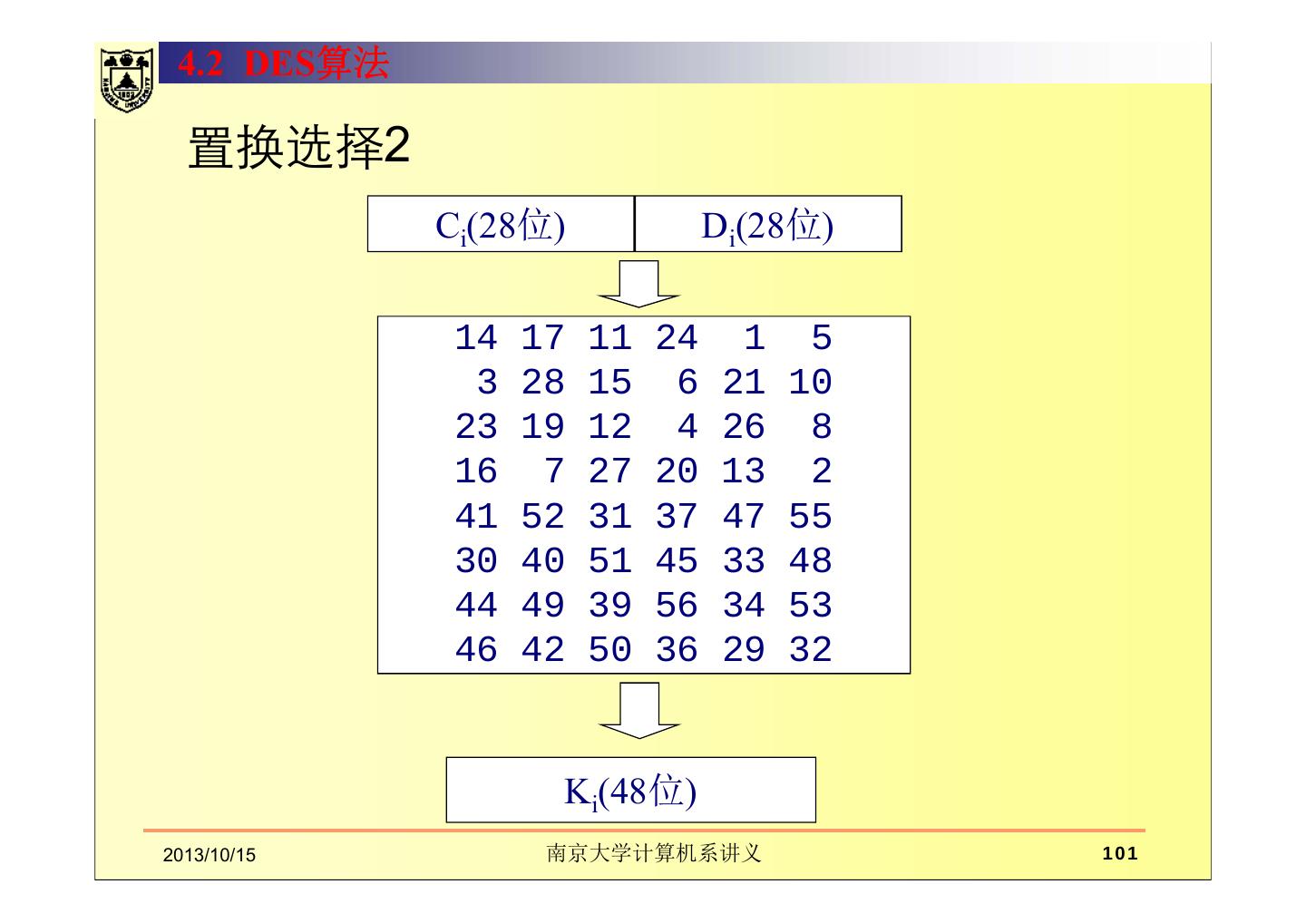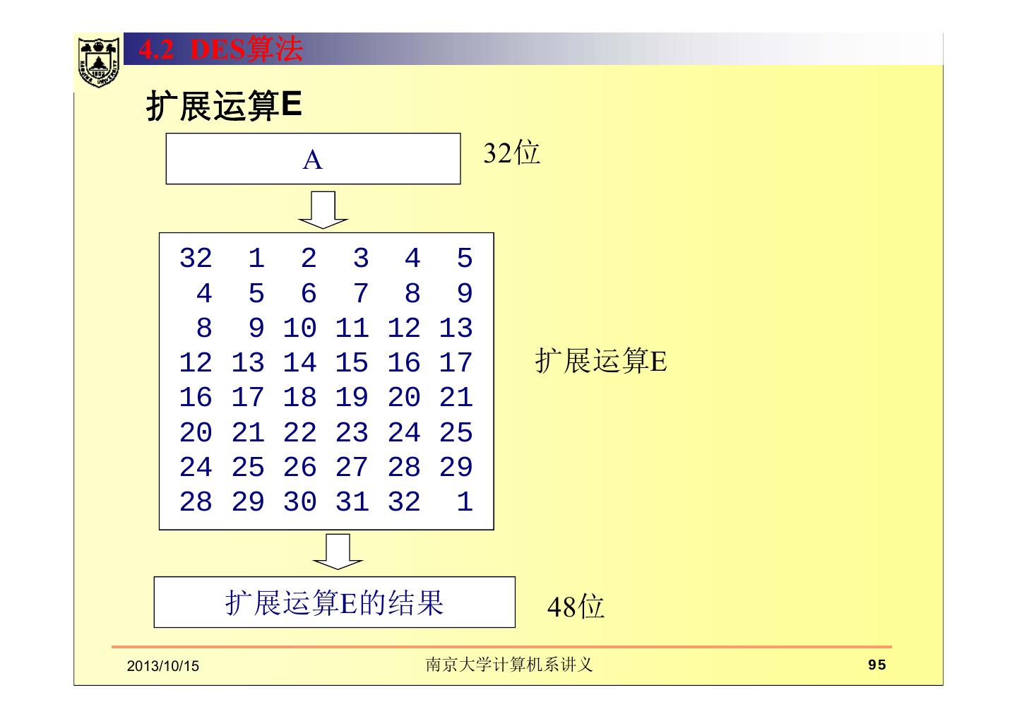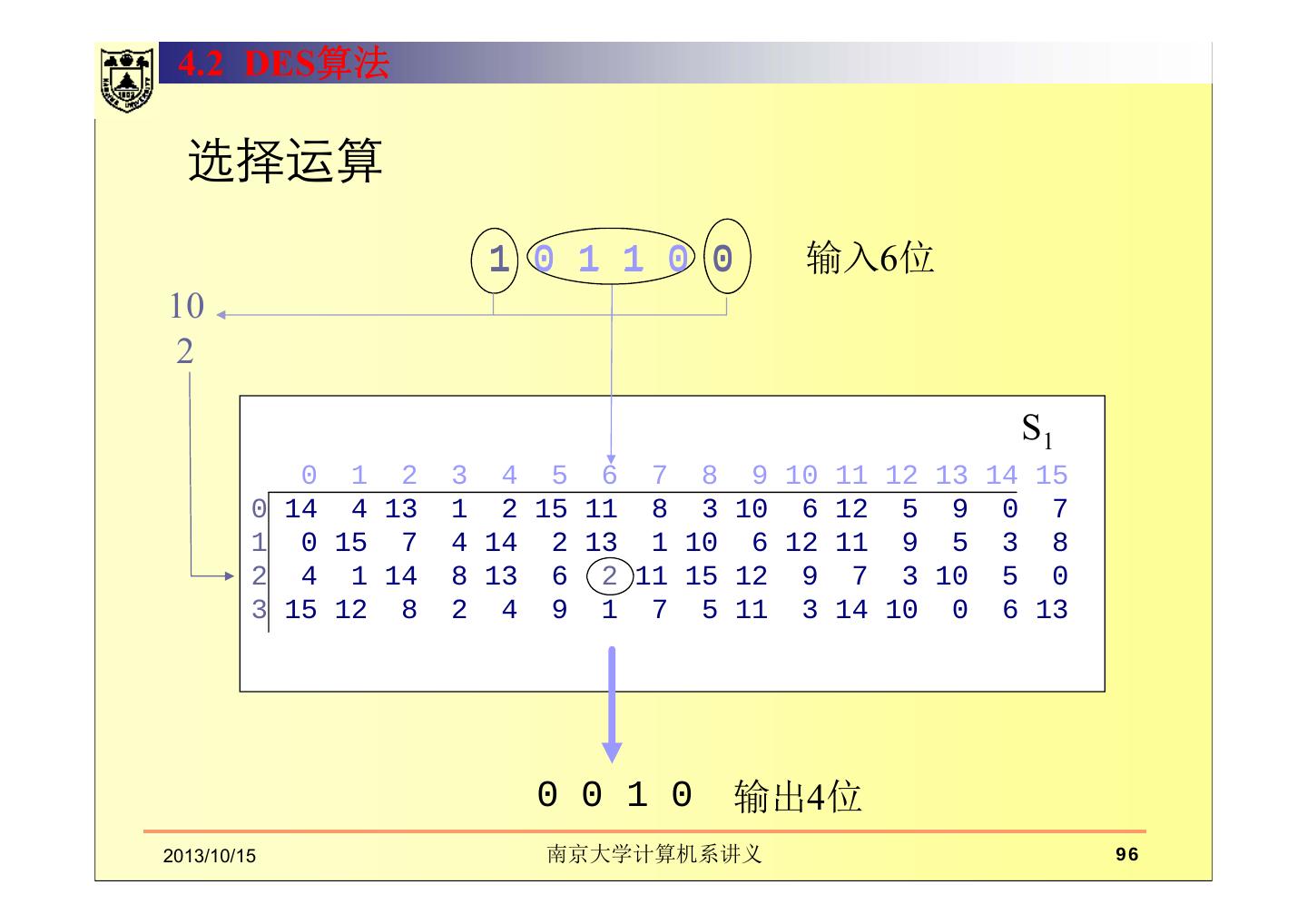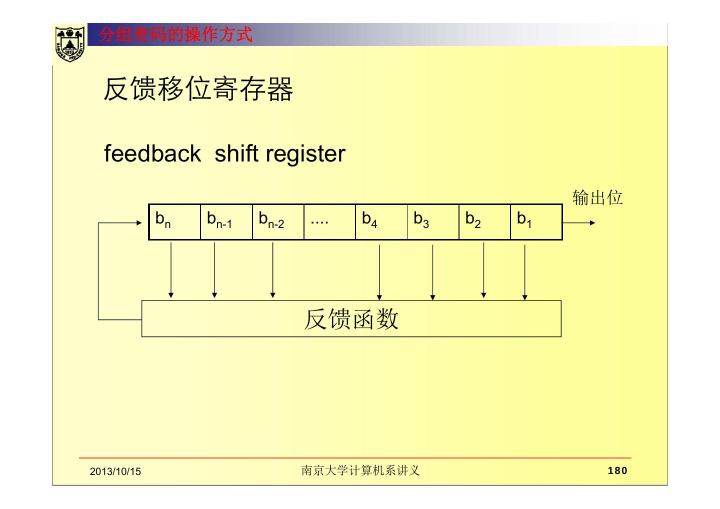 29 . 密码体制 P:所有可能的明文组成的有限集。; C:所有可能的密文组成的有限集; K:所有可能的密钥组成的有限集; 对任意的k∈K,都存在 一个加密法则ek ∈E 和相应的解密法则dk ∈D ,满足: 对任意的ek: P→C , dk: C→P, 明文x∈P, 均有 dk( ek(x) ) = x 密码体制:( P, C, K, E, D) 2013/10/15 南京大学计算机系讲义 29