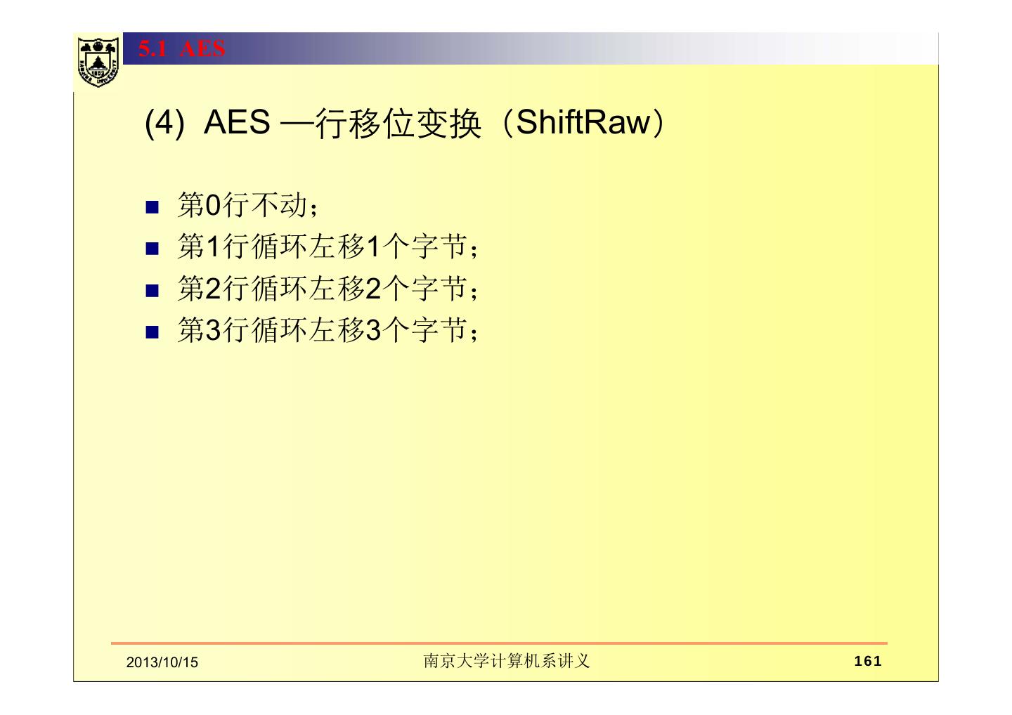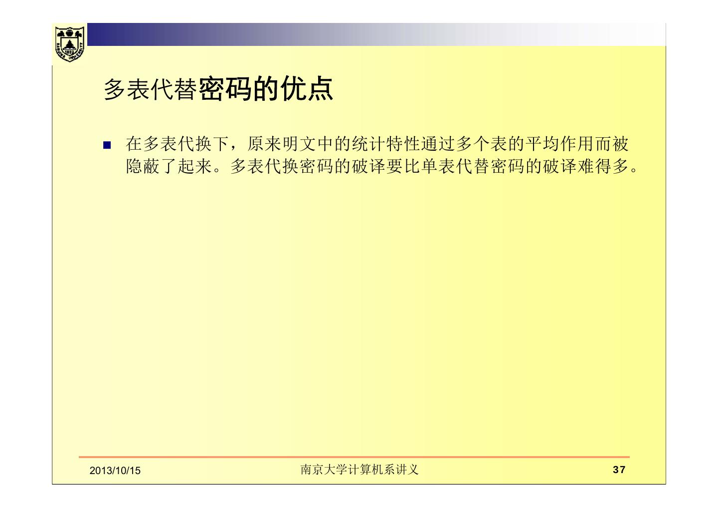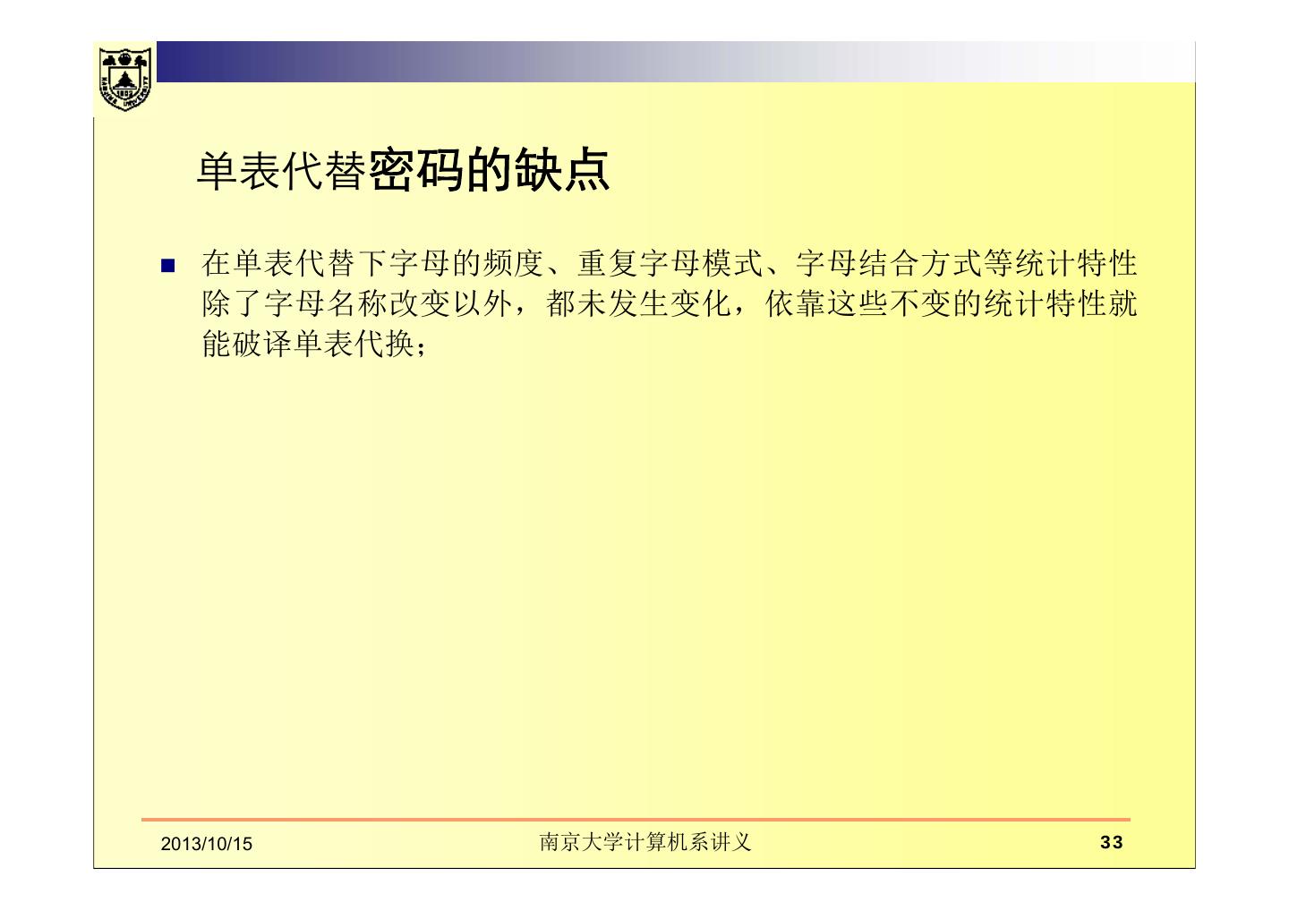 28 . 2. 古典密码算法 在计算机出现前,密码学由基于字符的密码算法构成。不同的 密码算法是字符之间互相代换或者是互相之间换位,好的密码 算法是结合这两种方法,每次进行多次运算。 现在事情变得复杂多了,但原理还是没变。重要的变化是算法 对比特而不是对字母进行变换,实际上这只是字母表长度上的 改变,从26个元素变为2个元素。大多数好的密码算法仍然是代 替和换位的元素组合。 2013/10/15 南京大学计算机系讲义 28