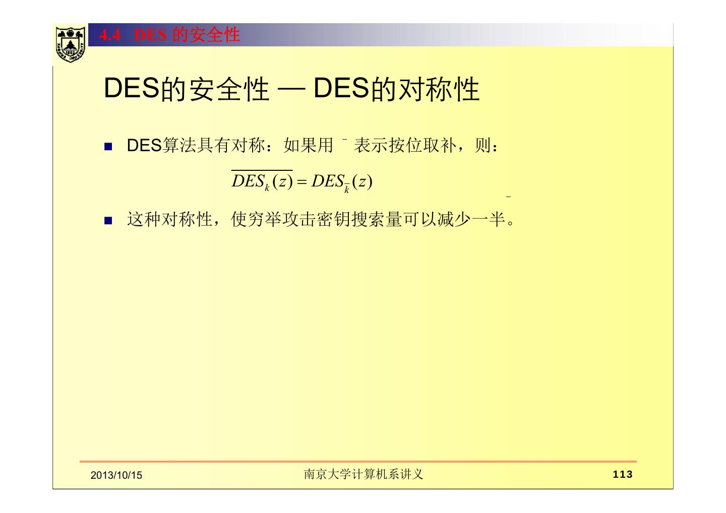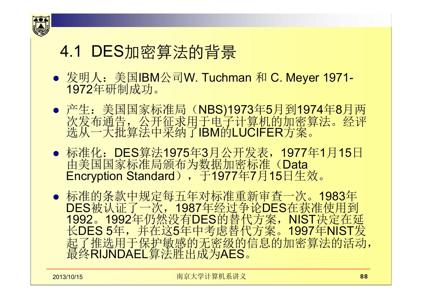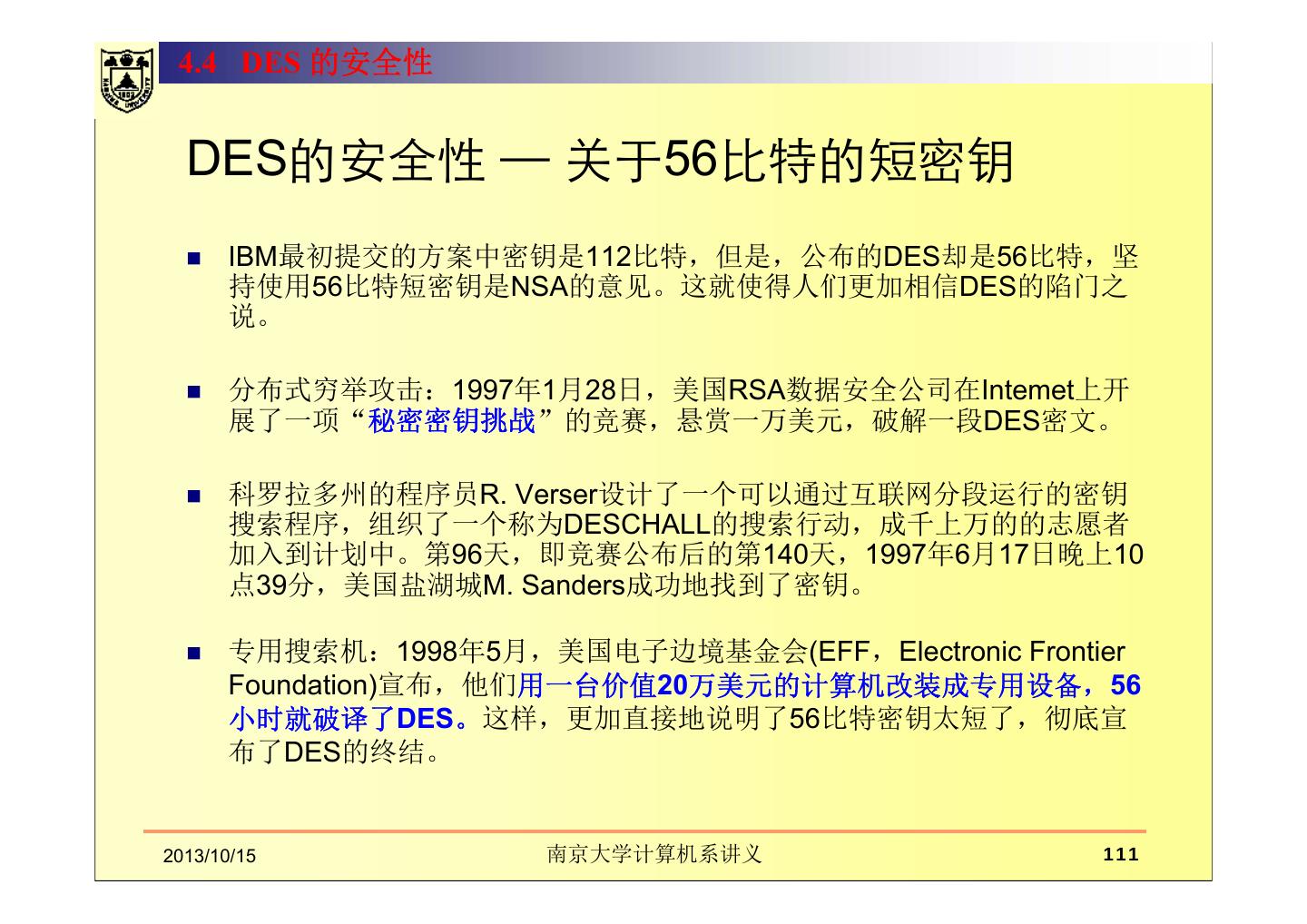 26 . 最好的算法是那些已经公开的,并经过世界上最好的 密码分析家们多年的攻击,但还是不能破译的算法。 美国国家安全局对外保持他们的算法的秘密,但他们 有很好的密码分析家在内部工作,他们互相讨论他们 的算法,通过执著的审查发现他们工作中的弱点。 2013/10/15 南京大学计算机系讲义 26