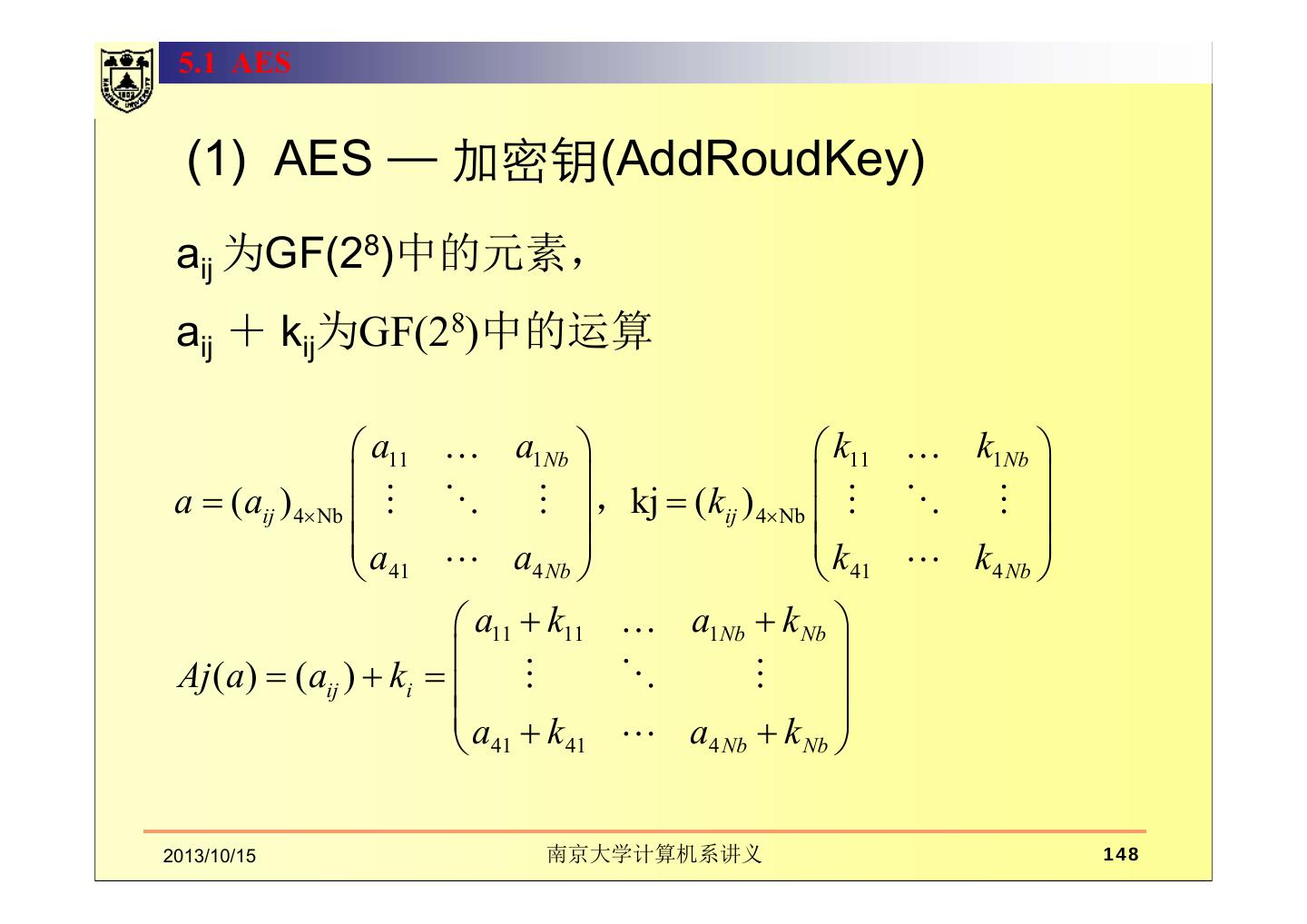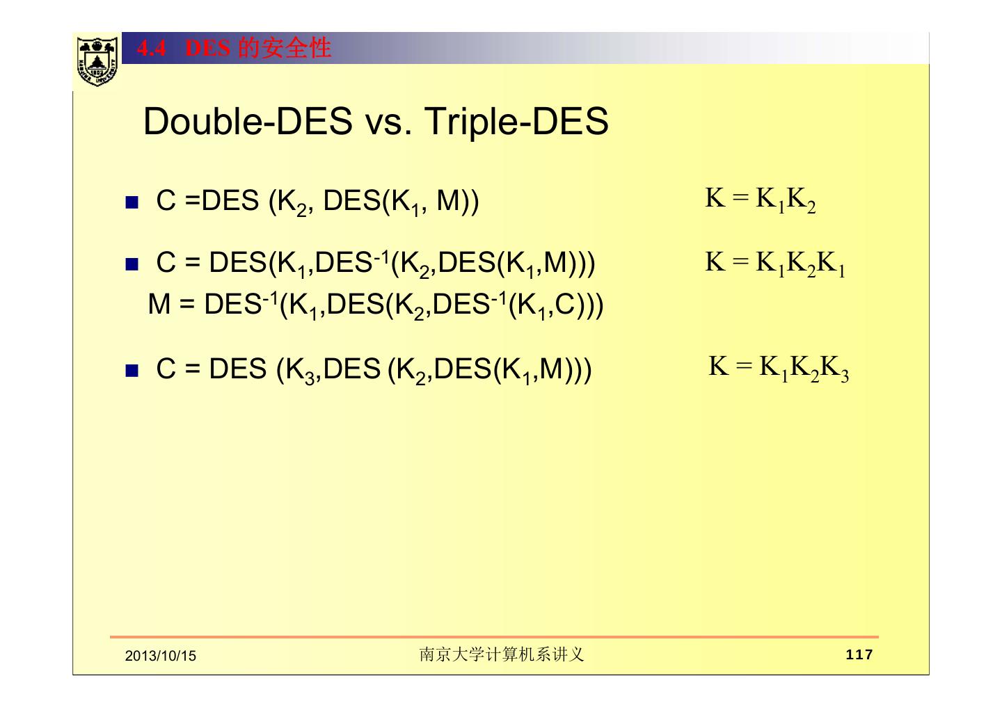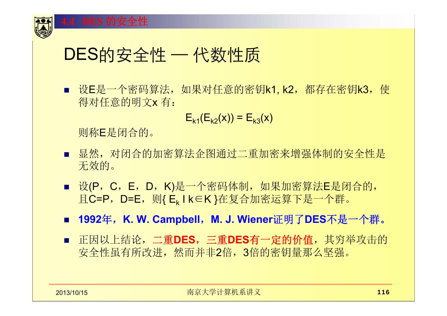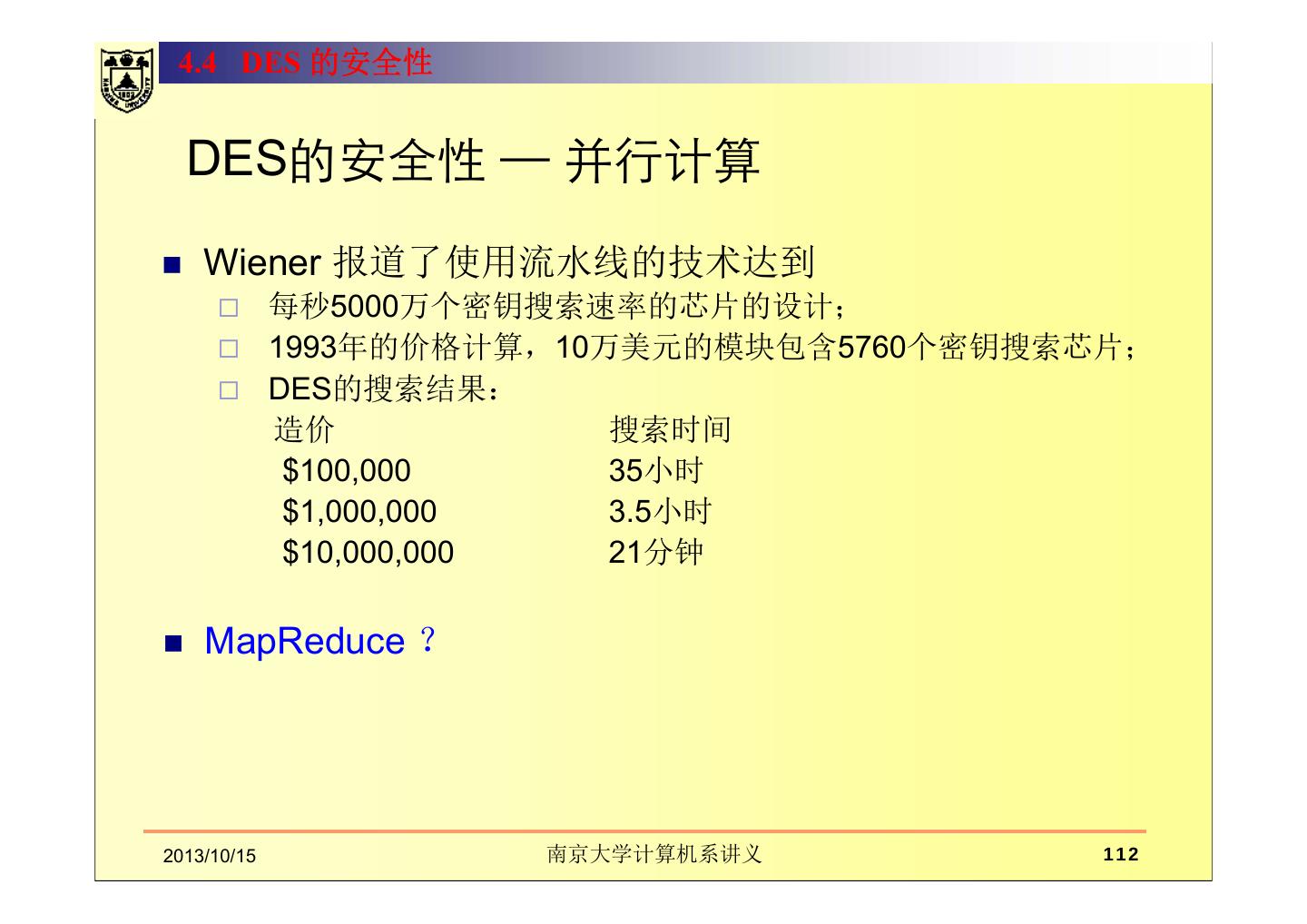 26 . 最好的算法是那些已经公开的,并经过世界上最好的 密码分析家们多年的攻击,但还是不能破译的算法。 美国国家安全局对外保持他们的算法的秘密,但他们 有很好的密码分析家在内部工作,他们互相讨论他们 的算法,通过执著的审查发现他们工作中的弱点。 2013/10/15 南京大学计算机系讲义 26