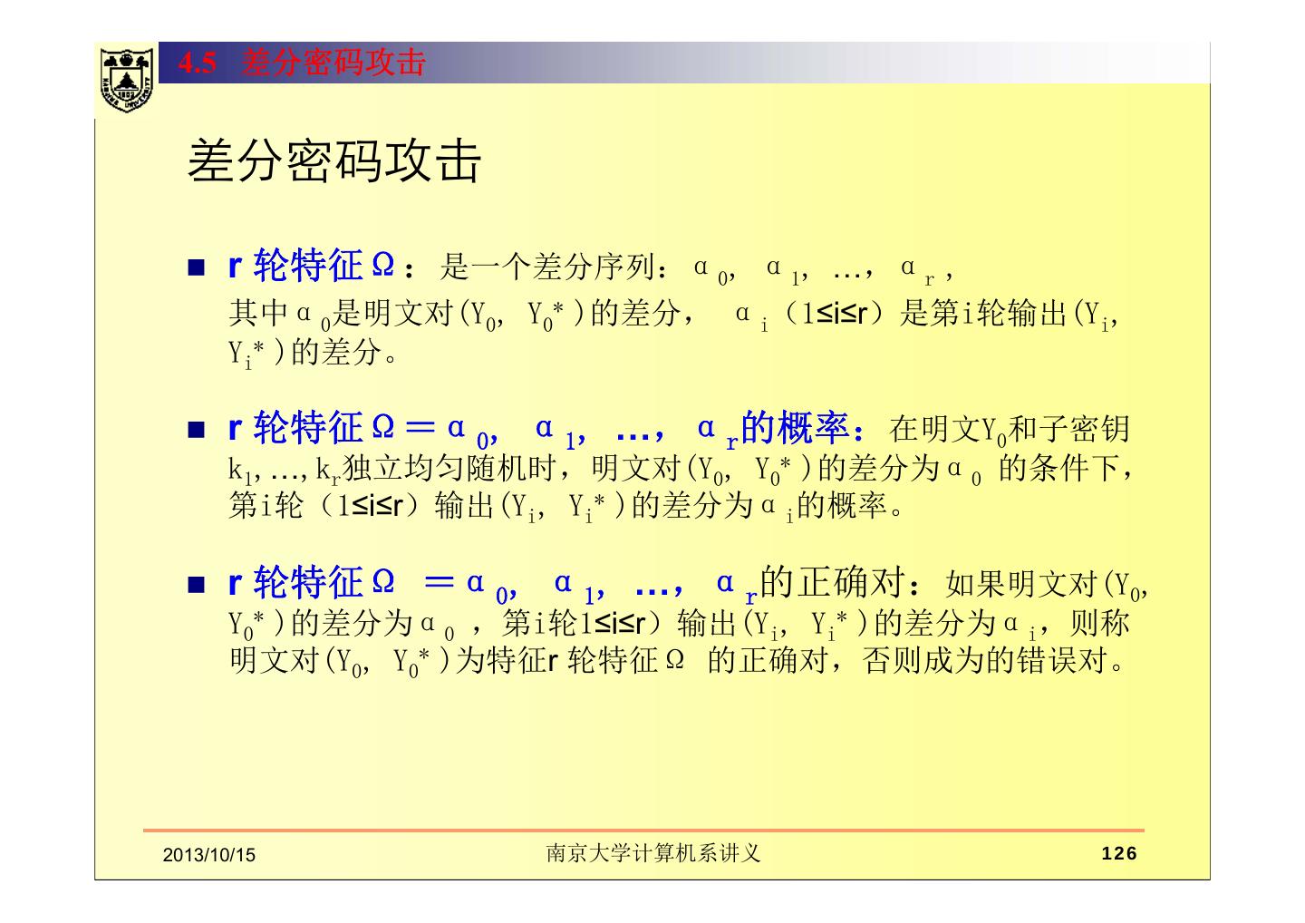 25 . (4)选择密文攻击 密码分析者能选择不同的被加密的密文,并可得到对应的 解密的明文,例如密码分析者存取一个防窜改的自动解密 盒,密码分析者的任务是推出密钥。 选择:C1,P1=Dk(C1),C2,P2=Dk(C2),,Ci, Pi=Dk(Ci), 推导出: k。 2013/10/15 南京大学计算机系讲义 25