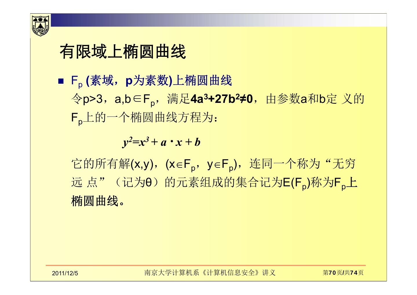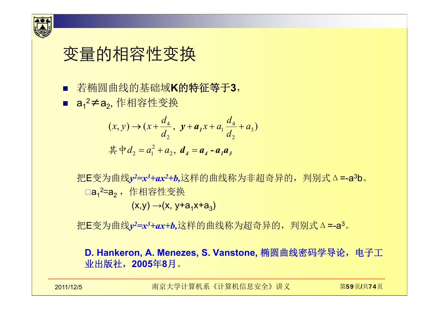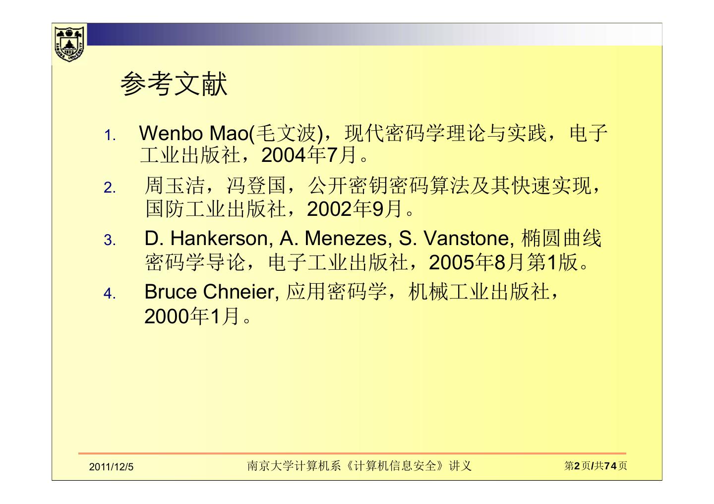 2 . 参考文献 1. Wenbo Mao(毛文波),现代密码学理论与实践,电子 工业出版社,2004年7月。 2. 周玉洁,冯登国,公开密钥密码算法及其快速实现, 国防工业出版社,2002年9月。 3. D. Hankerson, A. Menezes, S. Vanstone, 椭圆曲线 密码学导论,电子工业出版社,2005年8月第1版。 4. Bruce Chneier, 应用密码学,机械工业出版社, 2000年1月。 2011/12/5 南京大学计算机系《计算机信息安全》讲义 第2页/共74页