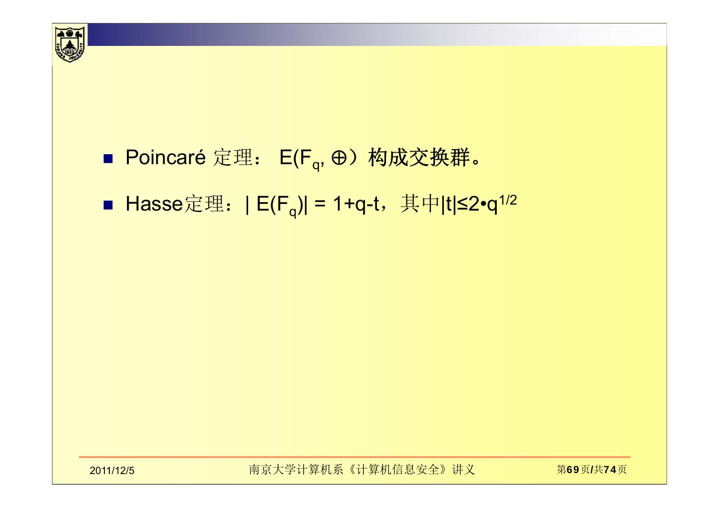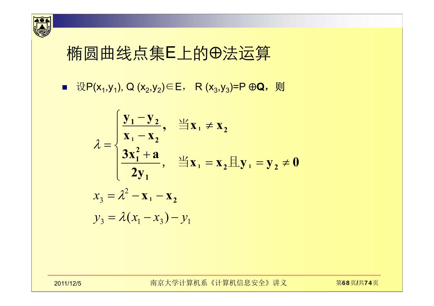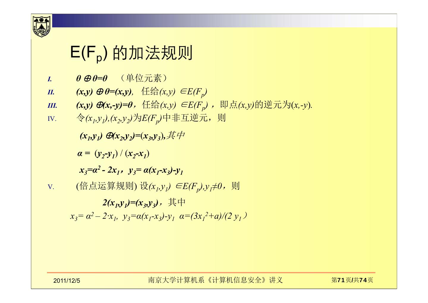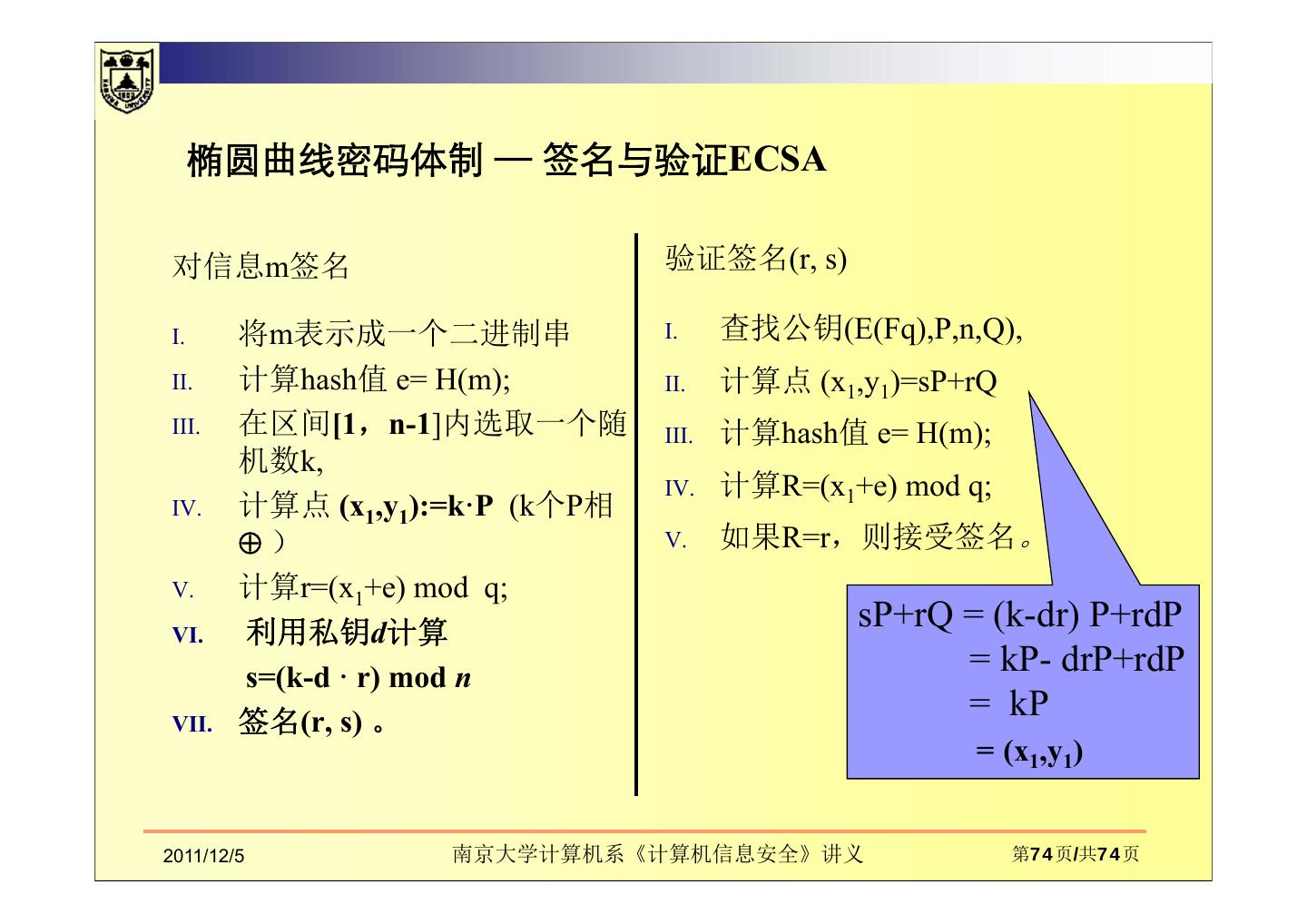2 . 参考文献 1. Wenbo Mao(毛文波),现代密码学理论与实践,电子 工业出版社,2004年7月。 2. 周玉洁,冯登国,公开密钥密码算法及其快速实现, 国防工业出版社,2002年9月。 3. D. Hankerson, A. Menezes, S. Vanstone, 椭圆曲线 密码学导论,电子工业出版社,2005年8月第1版。 4. Bruce Chneier, 应用密码学,机械工业出版社, 2000年1月。 2011/12/5 南京大学计算机系《计算机信息安全》讲义 第2页/共74页