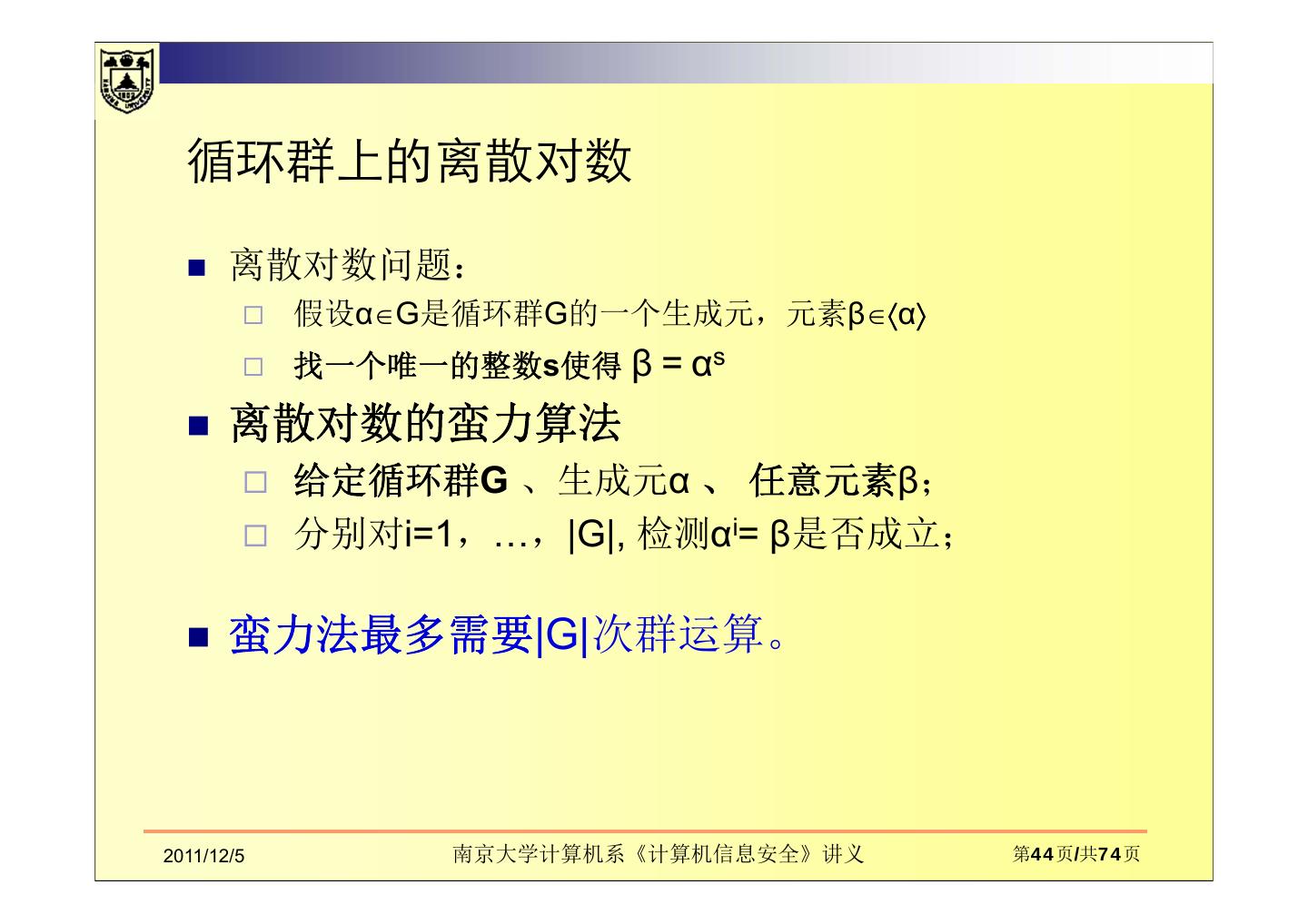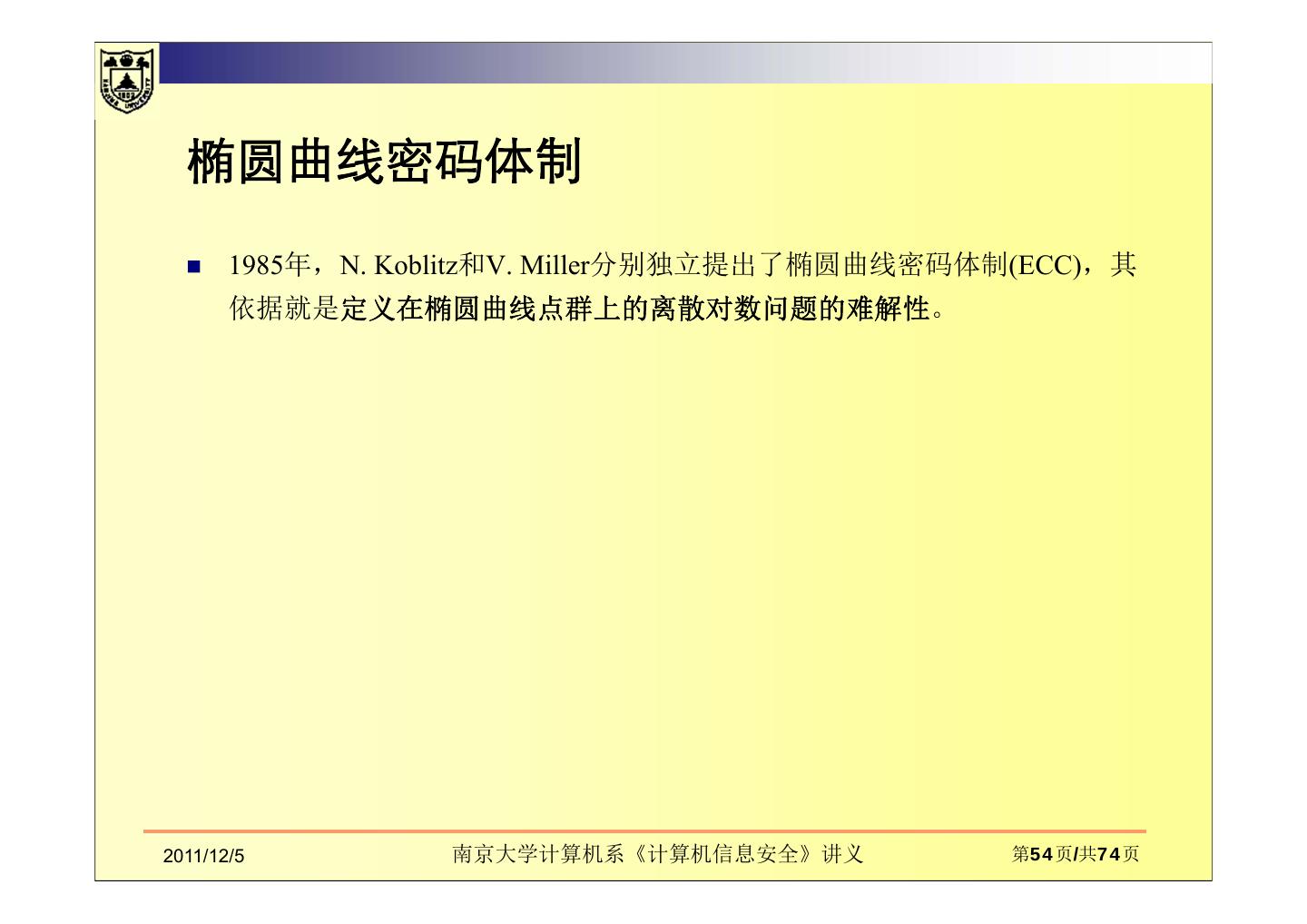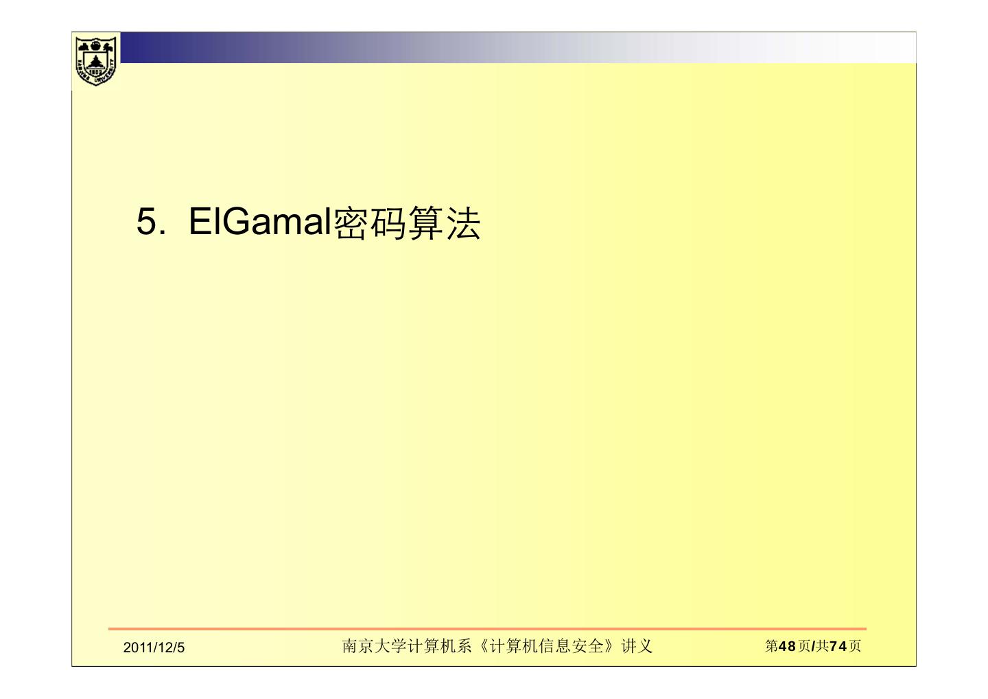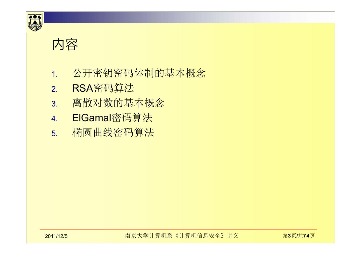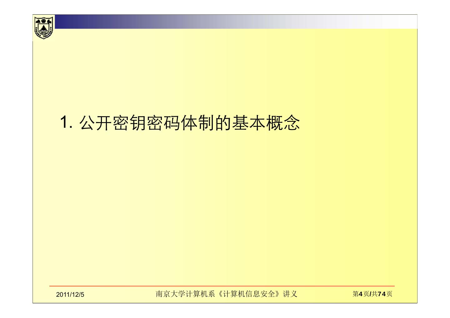 3 . 内容 1. 公开密钥密码体制的基本概念 2. RSA密码算法 3. 离散对数的基本概念 4. ElGamal密码算法 5. 椭圆曲线密码算法 2011/12/5 南京大学计算机系《计算机信息安全》讲义 第3页/共74页