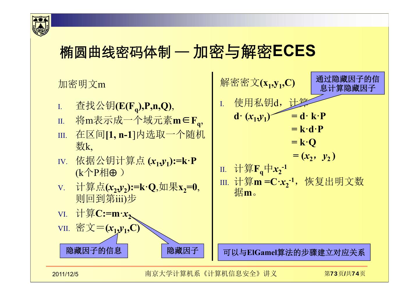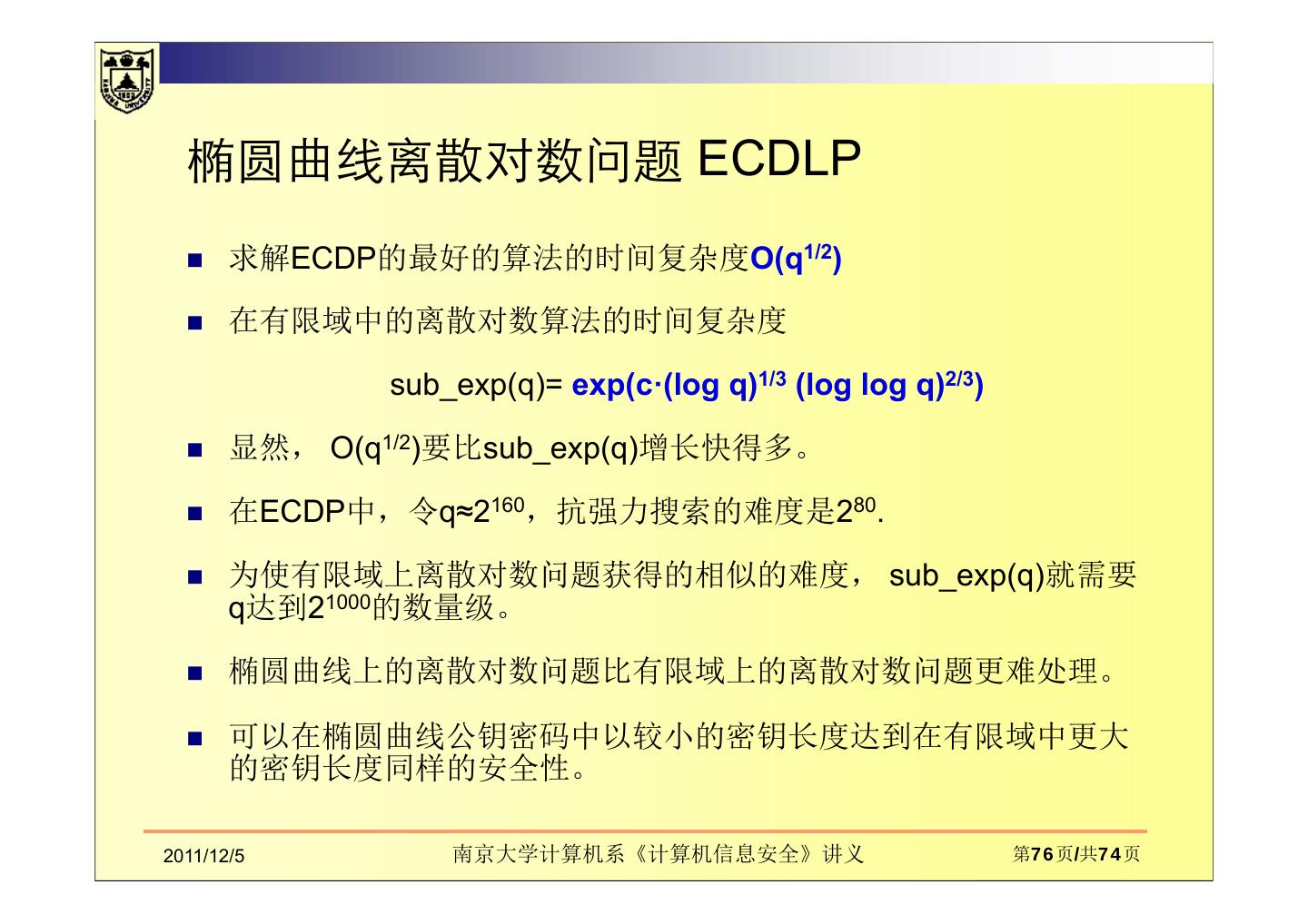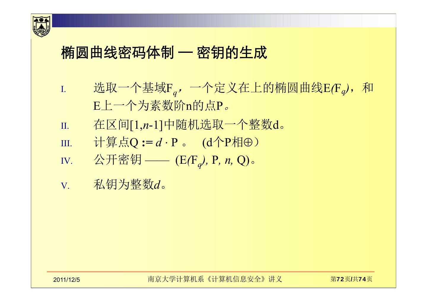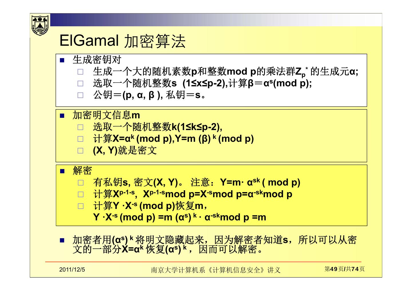 3 . 内容 1. 公开密钥密码体制的基本概念 2. RSA密码算法 3. 离散对数的基本概念 4. ElGamal密码算法 5. 椭圆曲线密码算法 2011/12/5 南京大学计算机系《计算机信息安全》讲义 第3页/共74页