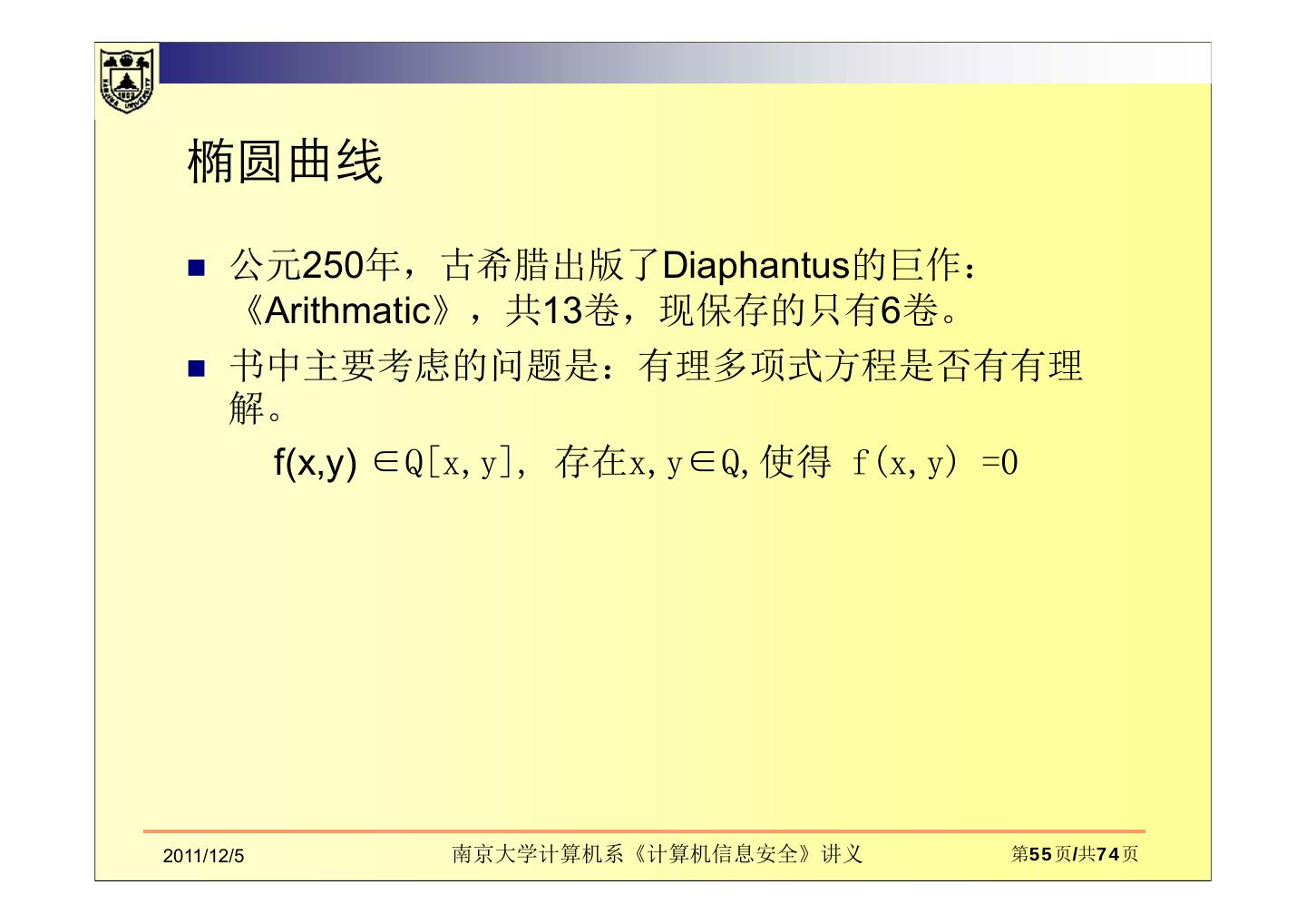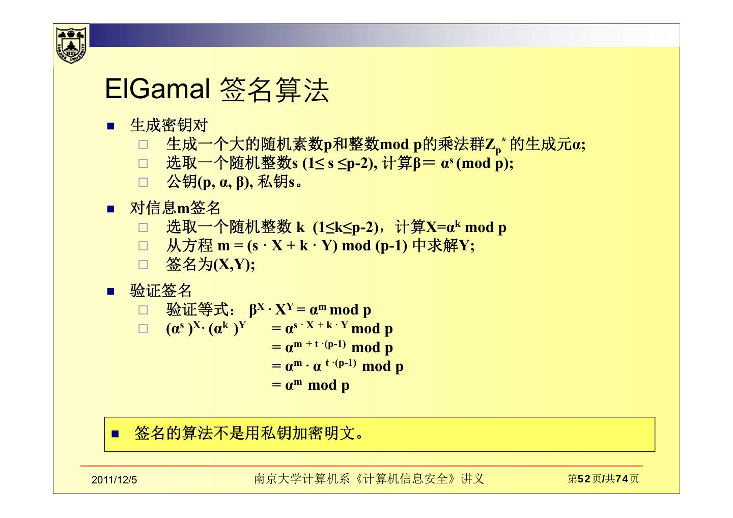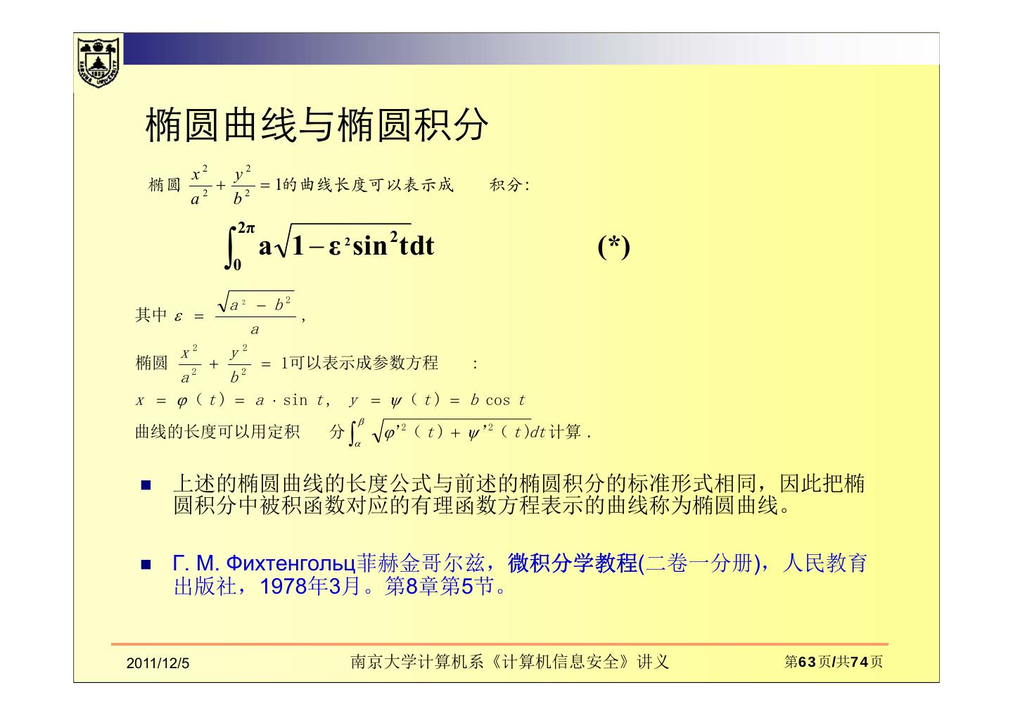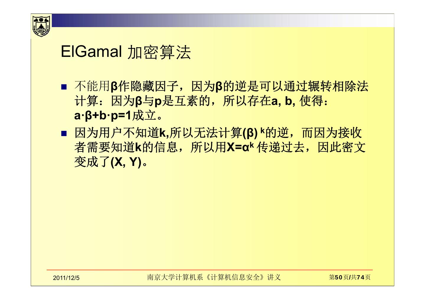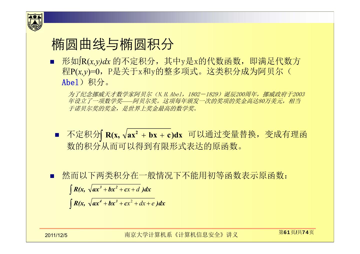 3 . 内容 1. 公开密钥密码体制的基本概念 2. RSA密码算法 3. 离散对数的基本概念 4. ElGamal密码算法 5. 椭圆曲线密码算法 2011/12/5 南京大学计算机系《计算机信息安全》讲义 第3页/共74页