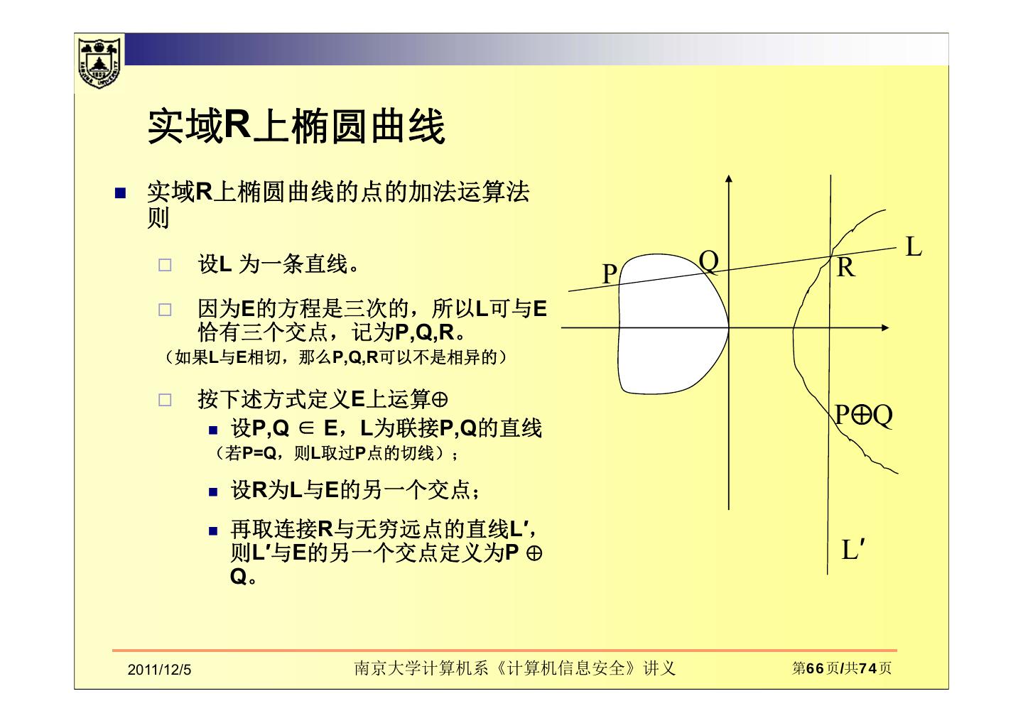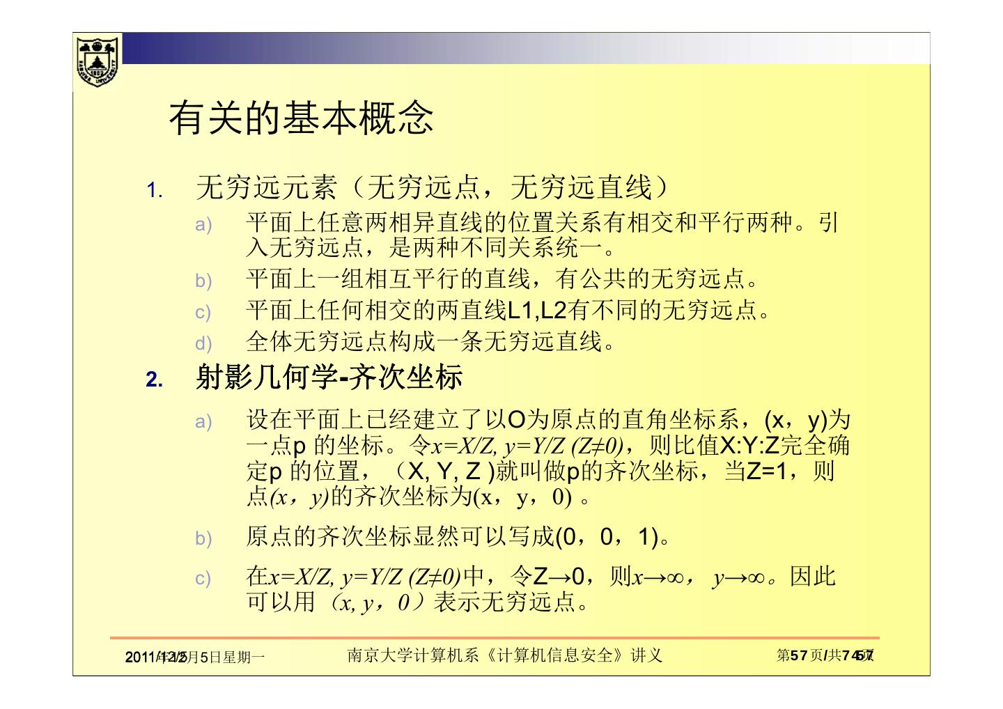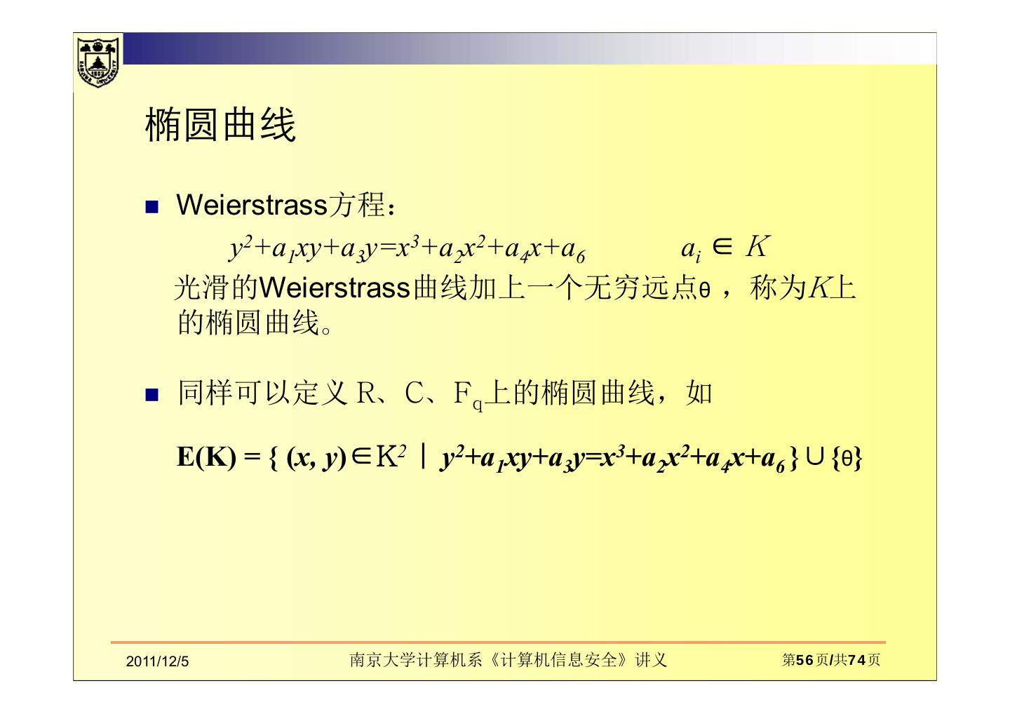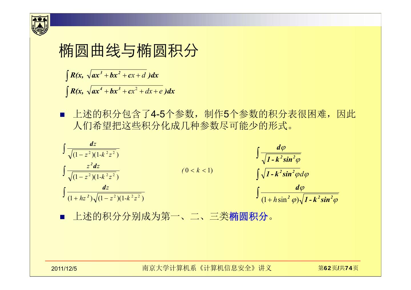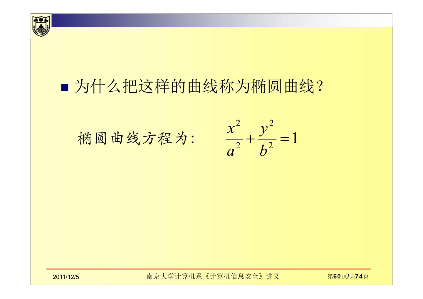 3 . 内容 1. 公开密钥密码体制的基本概念 2. RSA密码算法 3. 离散对数的基本概念 4. ElGamal密码算法 5. 椭圆曲线密码算法 2011/12/5 南京大学计算机系《计算机信息安全》讲义 第3页/共74页