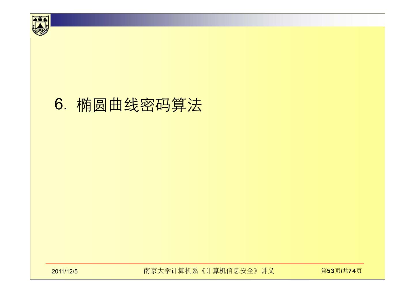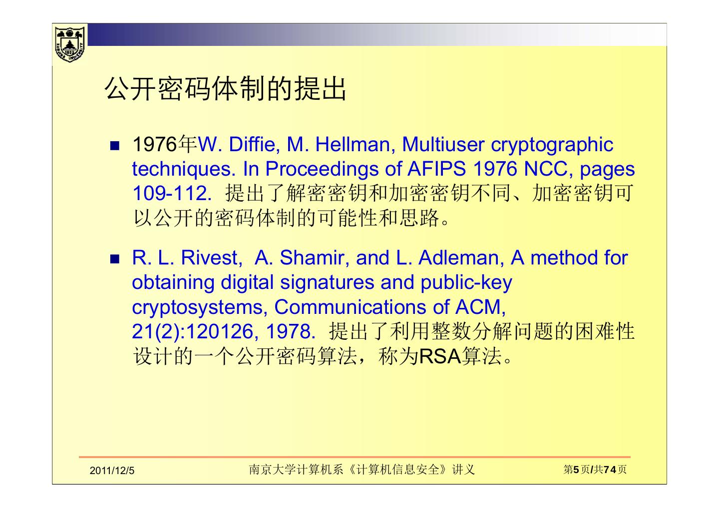 5 . 公开密码体制的提出 1976年W. Diffie, M. Hellman, Multiuser cryptographic techniques. In Proceedings of AFIPS 1976 NCC, pages 109-112. 提出了解密密钥和加密密钥不同、加密密钥可 以公开的密码体制的可能性和思路。 R. L. Rivest, A. Shamir, and L. Adleman, A method for obtaining digital signatures and public-key cryptosystems, Communications of ACM, 21(2):120126, 1978. 提出了利用整数分解问题的困难性 设计的一个公开密码算法,称为RSA算法。 2011/12/5 南京大学计算机系《计算机信息安全》讲义 第5页/共74页
