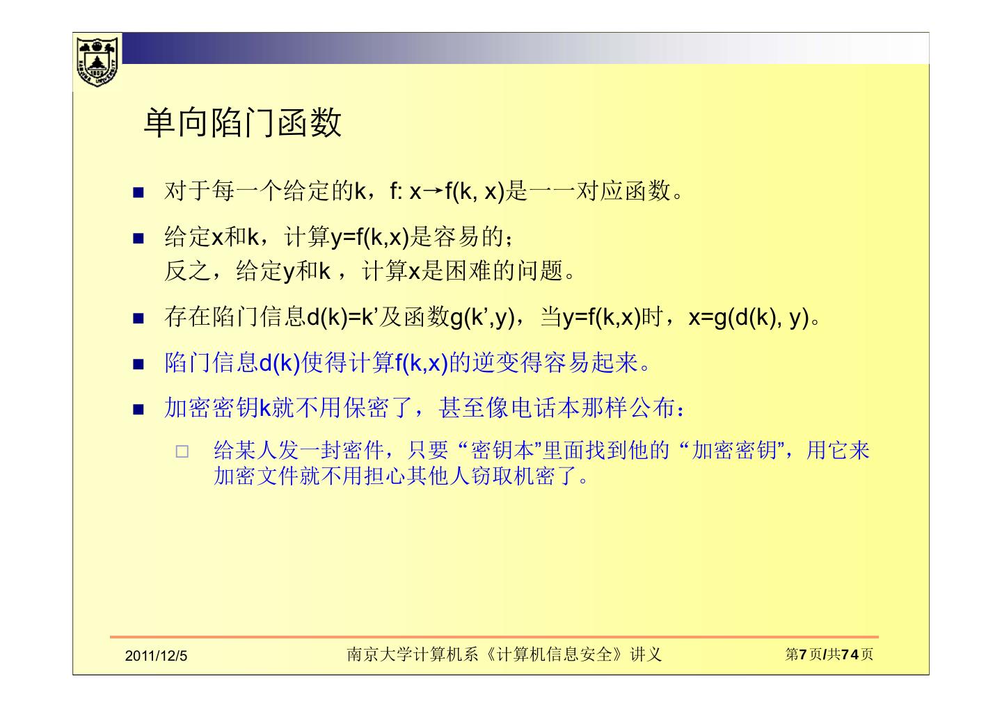 7 . 单向陷门函数 对于每一个给定的k,f: x→f(k, x)是一一对应函数。 给定x和k,计算y=f(k,x)是容易的; 反之,给定y和k ,计算x是困难的问题。 存在陷门信息d(k)=k’及函数g(k’,y),当y=f(k,x)时,x=g(d(k), y)。 陷门信息d(k)使得计算f(k,x)的逆变得容易起来。 加密密钥k就不用保密了,甚至像电话本那样公布: 给某人发一封密件,只要“密钥本”里面找到他的“加密密钥”,用它来 加密文件就不用担心其他人窃取机密了。 2011/12/5 南京大学计算机系《计算机信息安全》讲义 第7页/共74页