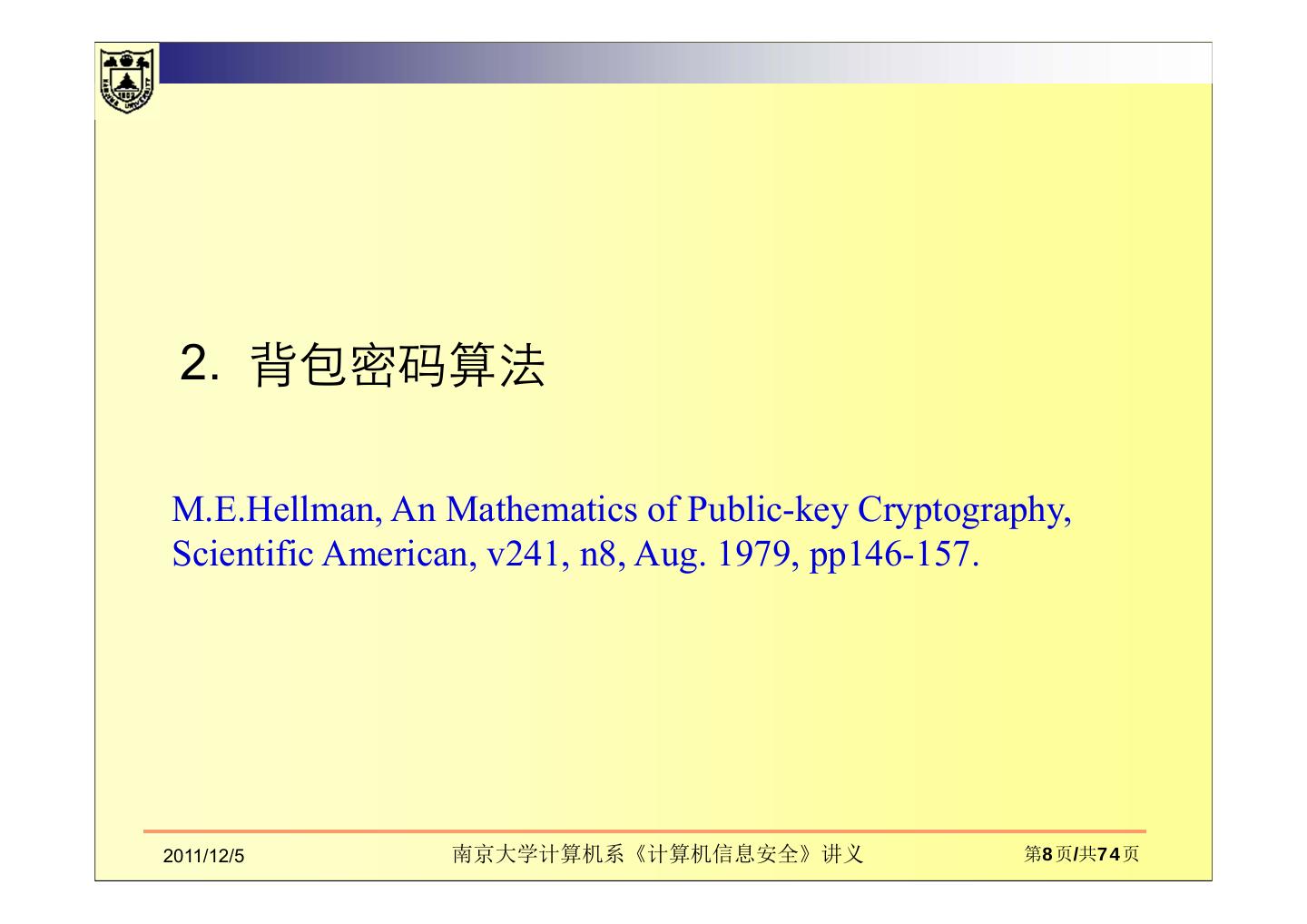 8 . 2. 背包密码算法 M.E.Hellman, An Mathematics of Public-key Cryptography, Scientific American, v241, n8, Aug. 1979, pp146-157. 2011/12/5 南京大学计算机系《计算机信息安全》讲义 第8页/共74页