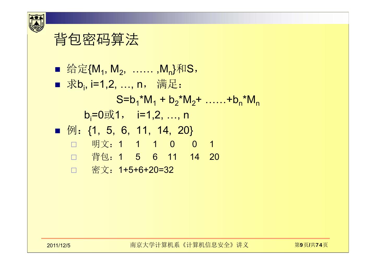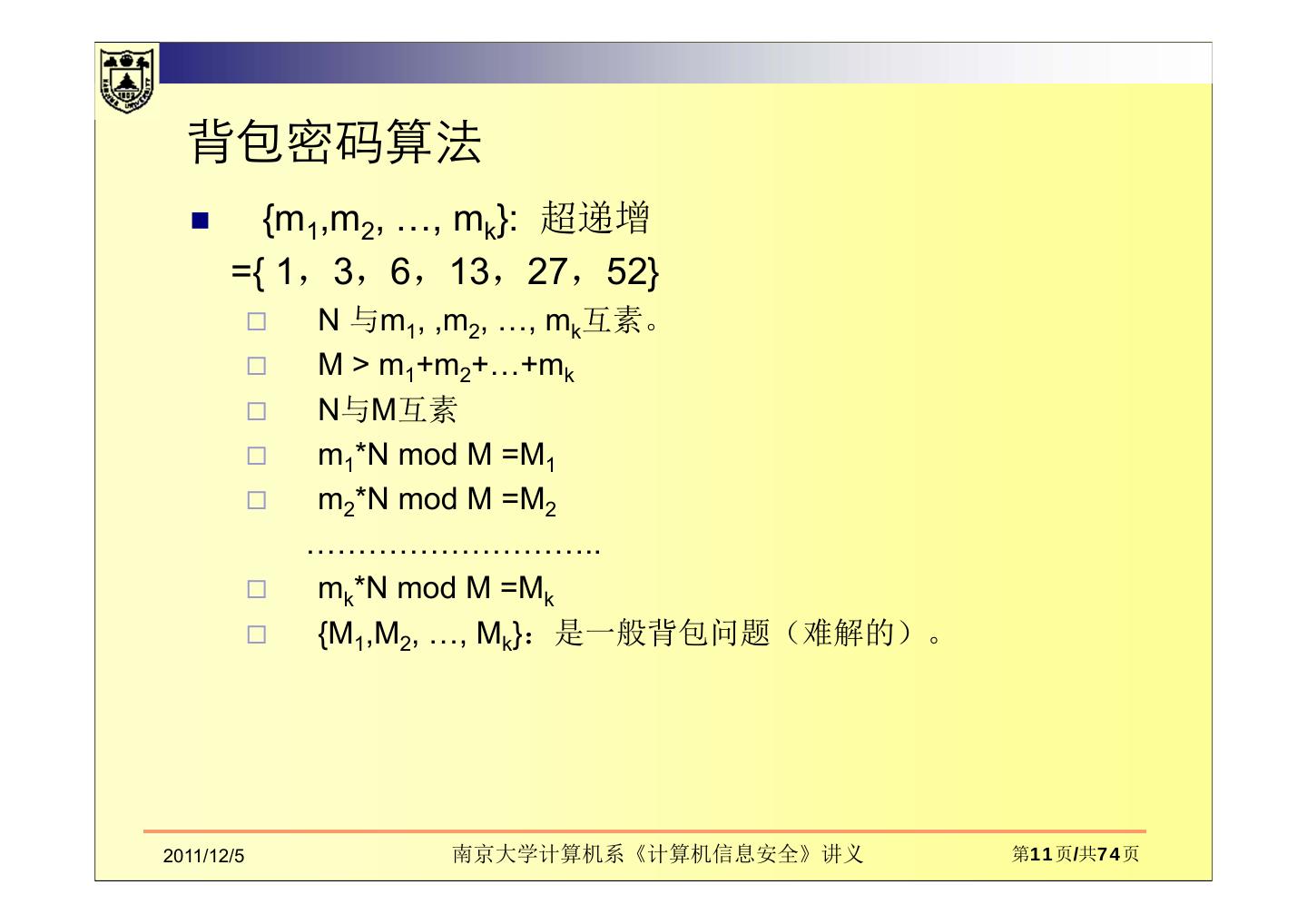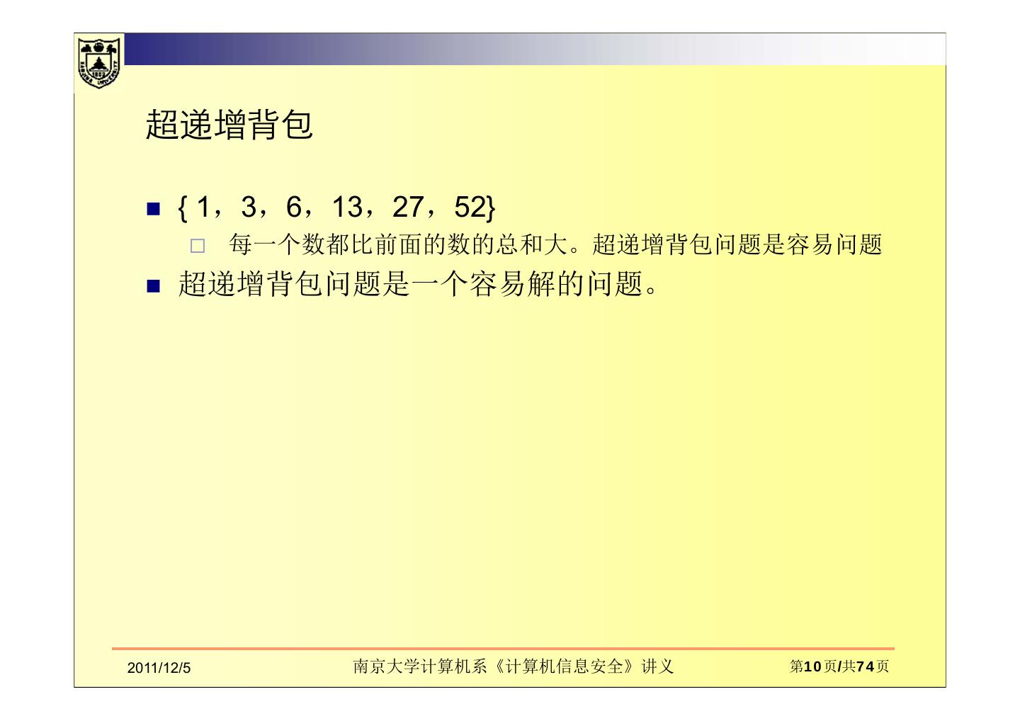 10 . 超递增背包 { 1,3,6,13,27,52} 每一个数都比前面的数的总和大。超递增背包问题是容易问题 超递增背包问题是一个容易解的问题。 2011/12/5 南京大学计算机系《计算机信息安全》讲义 第10页/共74页