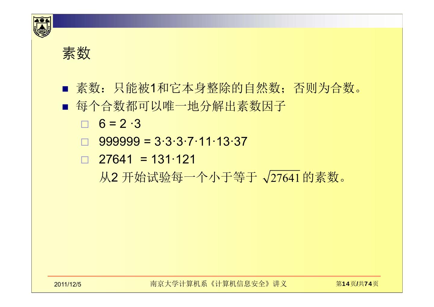 14 . 素数 素数:只能被1和它本身整除的自然数;否则为合数。 每个合数都可以唯一地分解出素数因子 6 = 2 ·3 999999 = 3·3·3·7·11·13·37 27641 = 131·121 从2 开始试验每一个小于等于 27641 的素数。 2011/12/5 南京大学计算机系《计算机信息安全》讲义 第14页/共74页