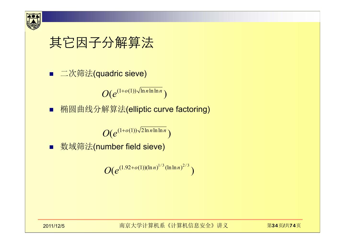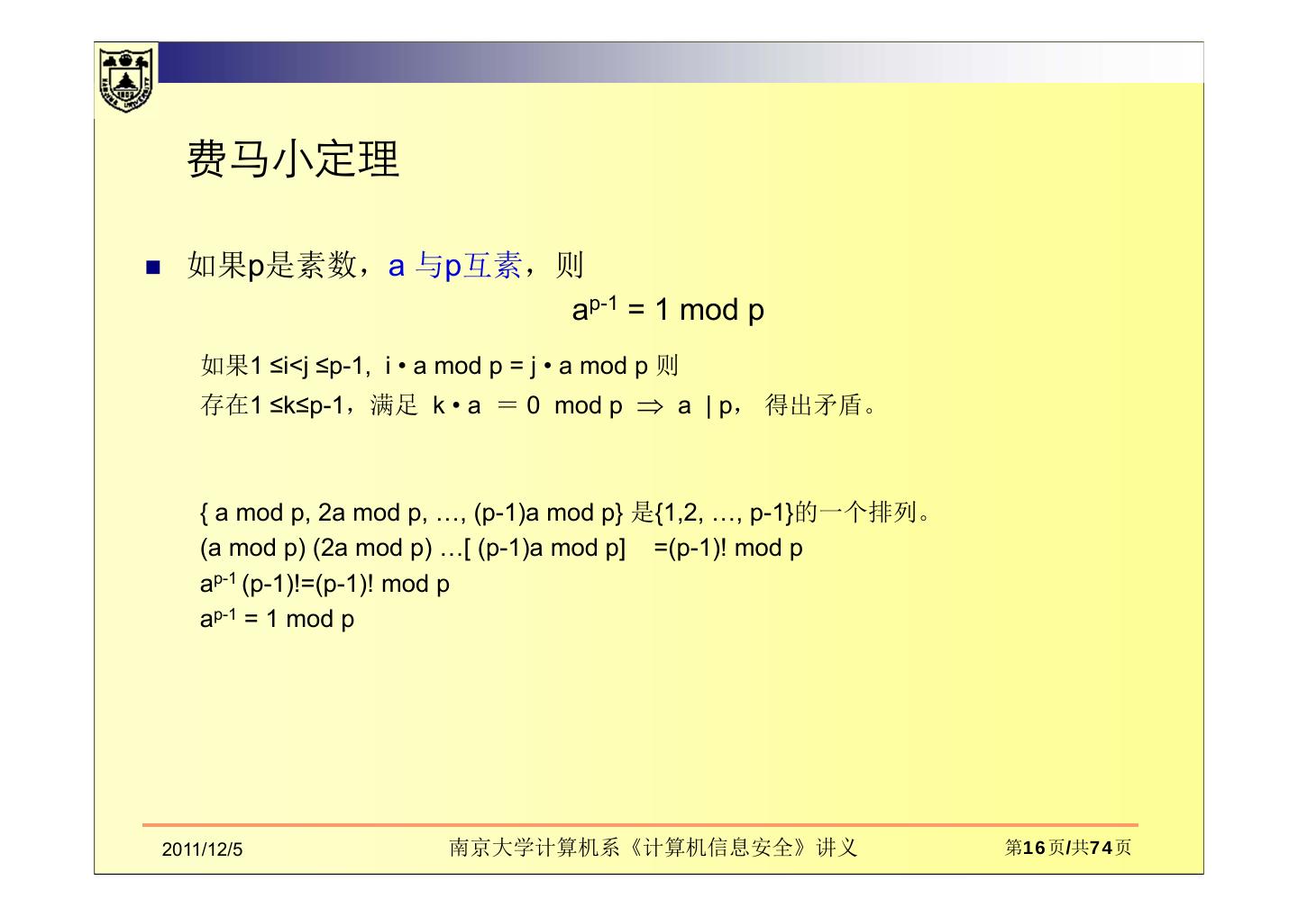 15 . 素因子分解的速度 整数n的十进制位数因子分解的运算次数所需计 算时间(每微秒一次) 50 1.4x1010 3.9小时 75 9.0x1012 104天 100 2.3x1015 74年 200 1.2x1023 3.8x109年 300 1.5x1029 4.0x1015年 500 1.3x1039 4.2x1025年 2011/12/5 南京大学计算机系《计算机信息安全》讲义 第15页/共74页