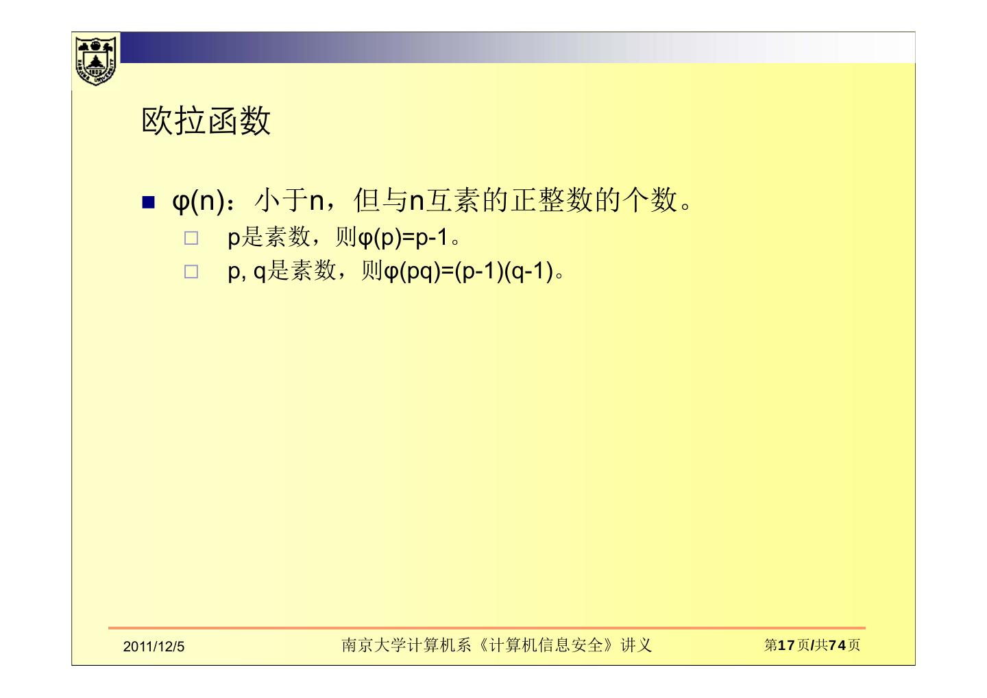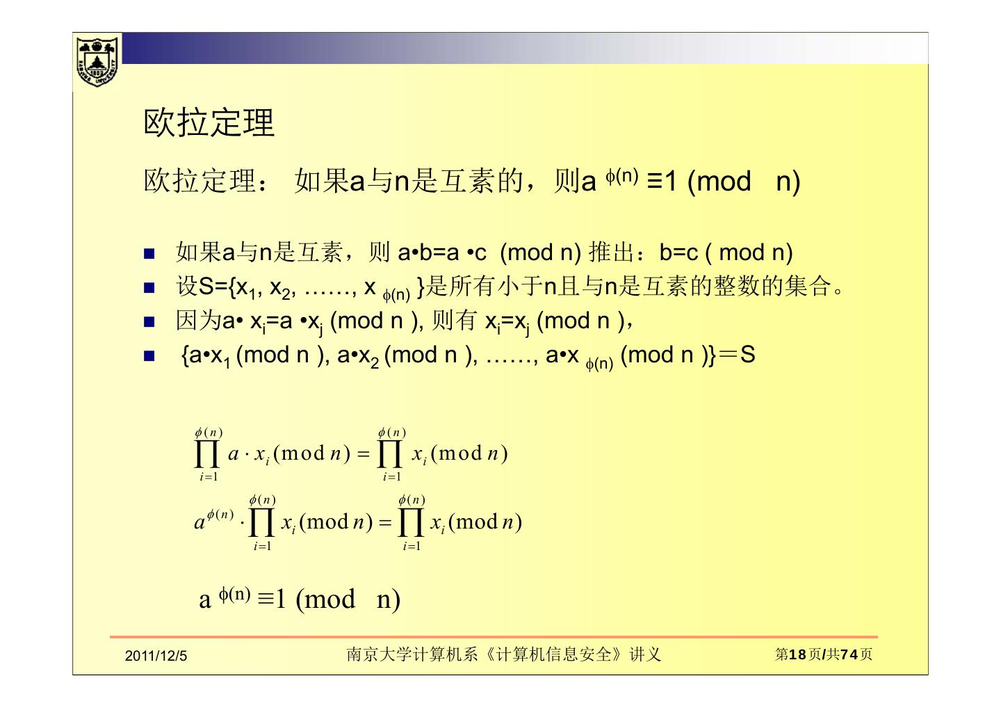17 . 欧拉函数 φ(n):小于n,但与n互素的正整数的个数。 p是素数,则φ(p)=p-1。 p, q是素数,则φ(pq)=(p-1)(q-1)。 2011/12/5 南京大学计算机系《计算机信息安全》讲义 第17页/共74页