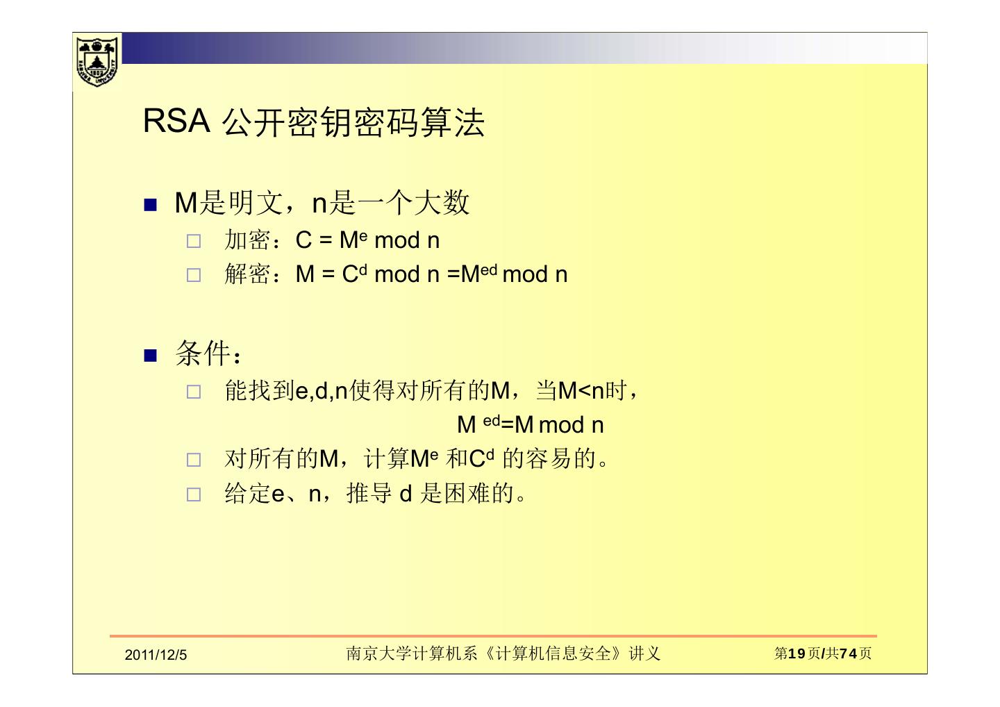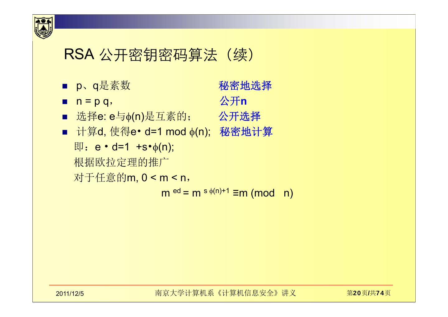 19 . RSA 公开密钥密码算法 M是明文,n是一个大数 加密:C = Me mod n 解密:M = Cd mod n =Med mod n 条件: 能找到e,d,n使得对所有的M,当M<n时, M ed=M mod n 对所有的M,计算Me 和Cd 的容易的。 给定e、n,推导 d 是困难的。 2011/12/5 南京大学计算机系《计算机信息安全》讲义 第19页/共74页
