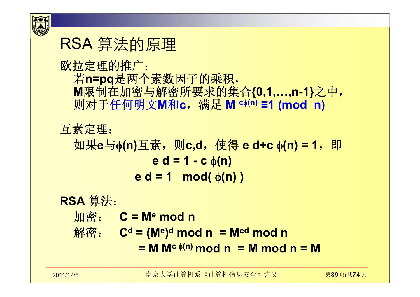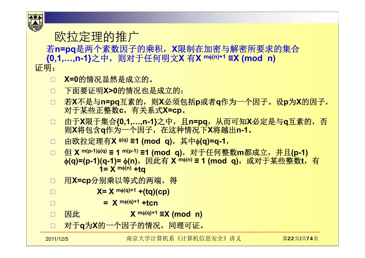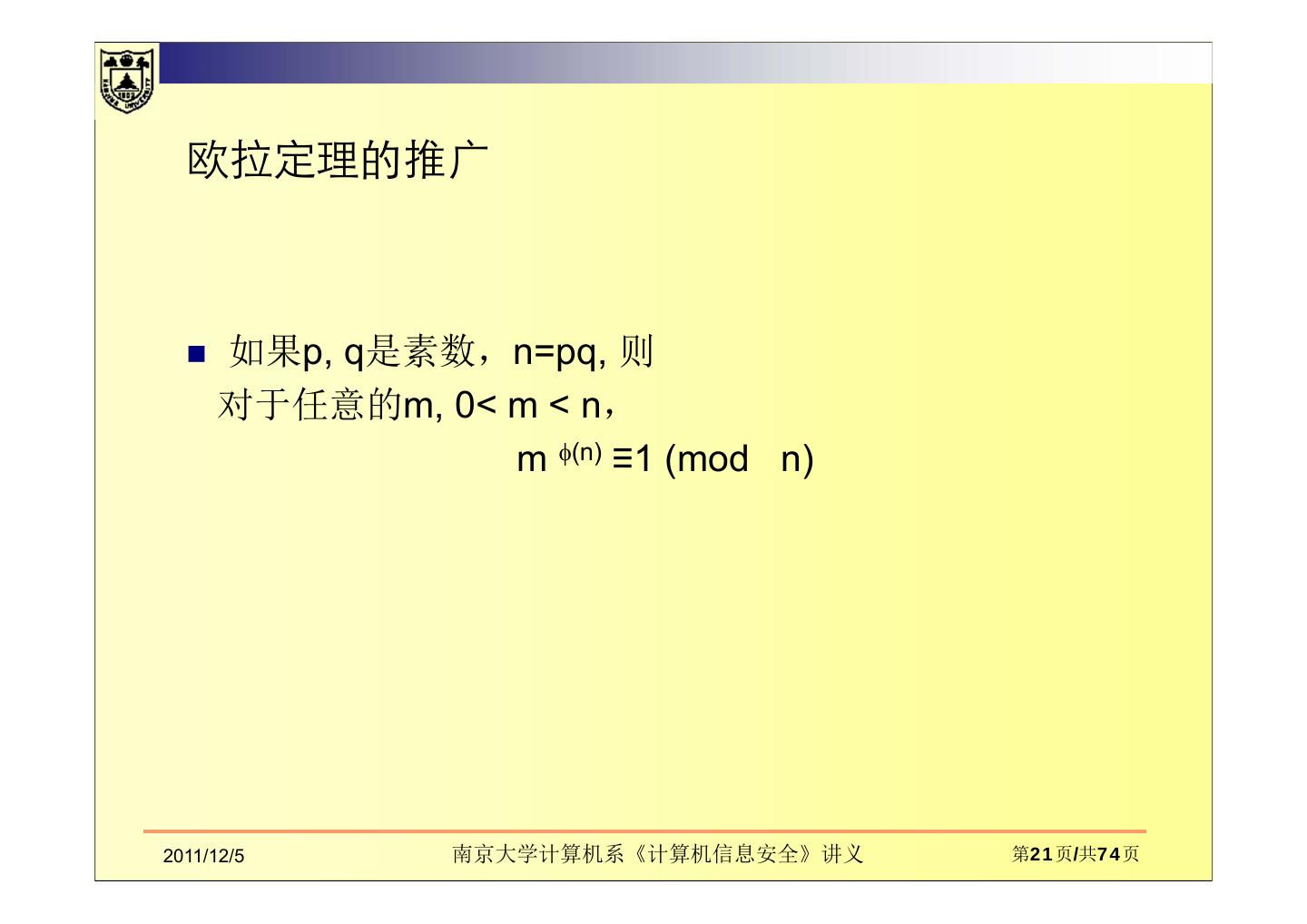21 . 欧拉定理的推广 如果p, q是素数,n=pq, 则 对于任意的m, 0< m < n, m (n) ≡1 (mod n) 2011/12/5 南京大学计算机系《计算机信息安全》讲义 第21页/共74页