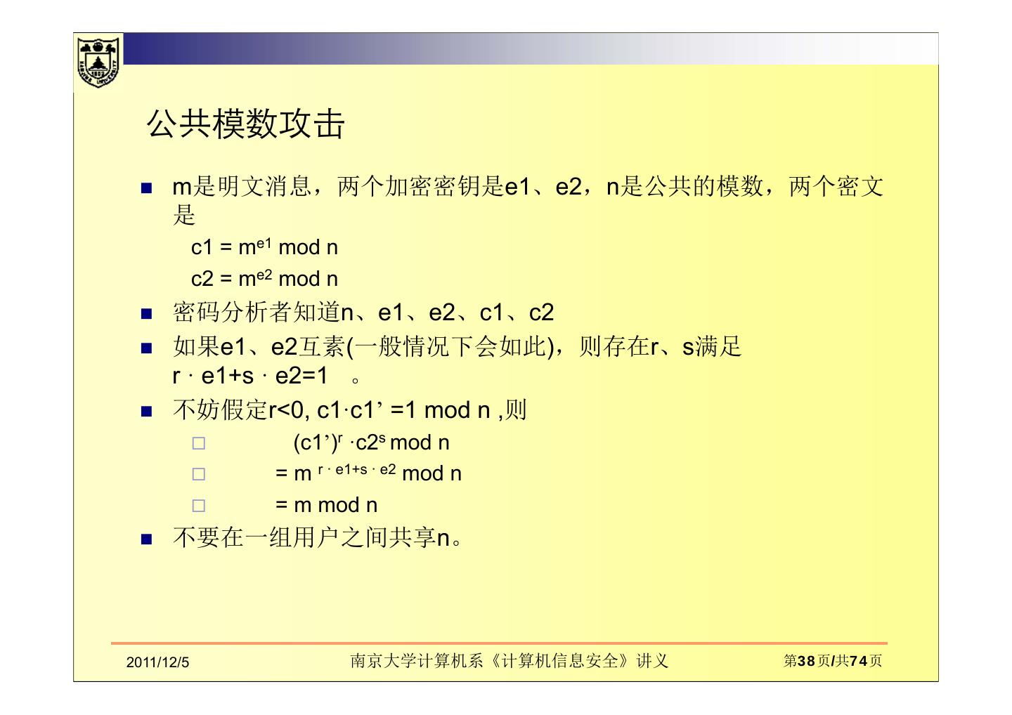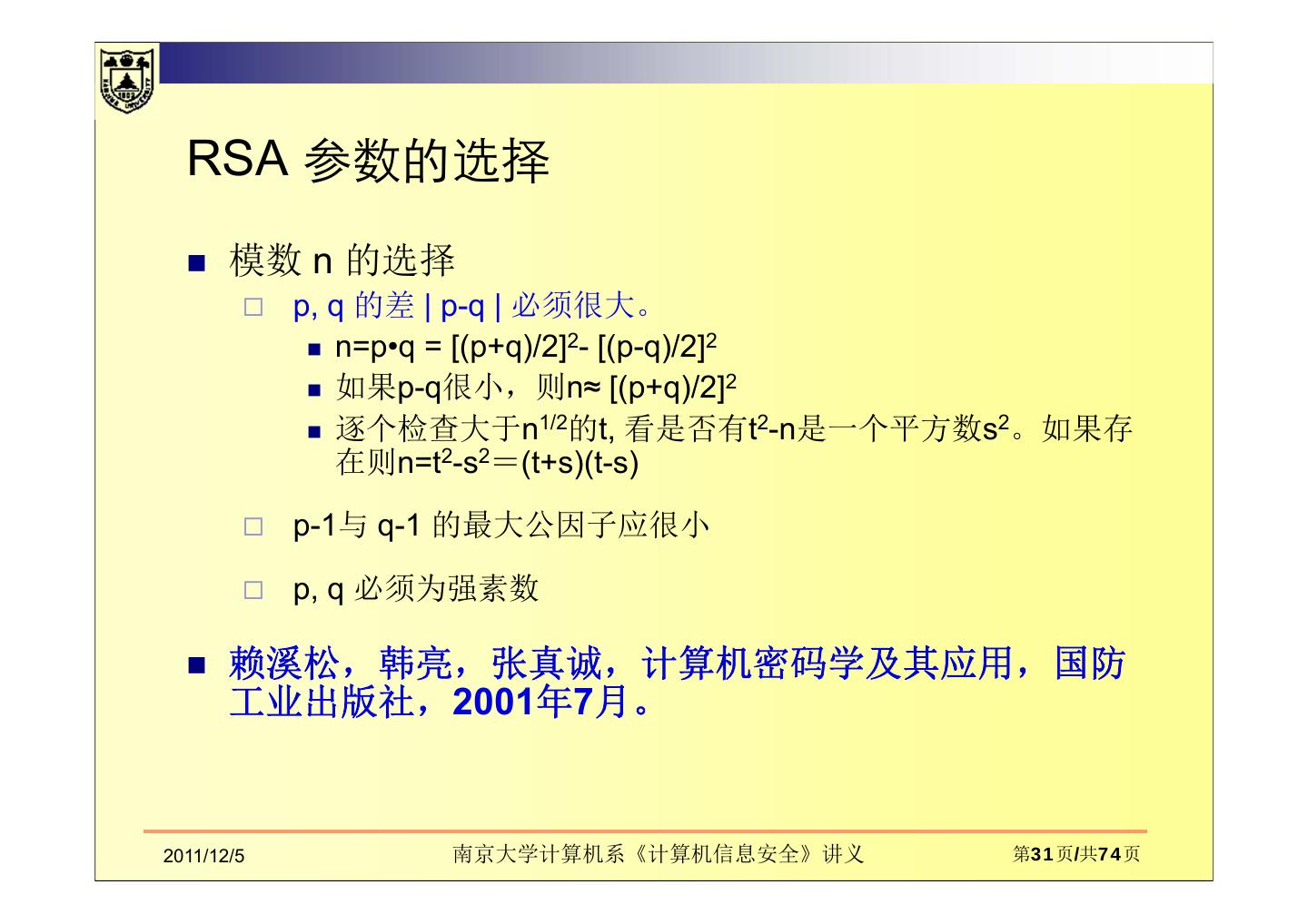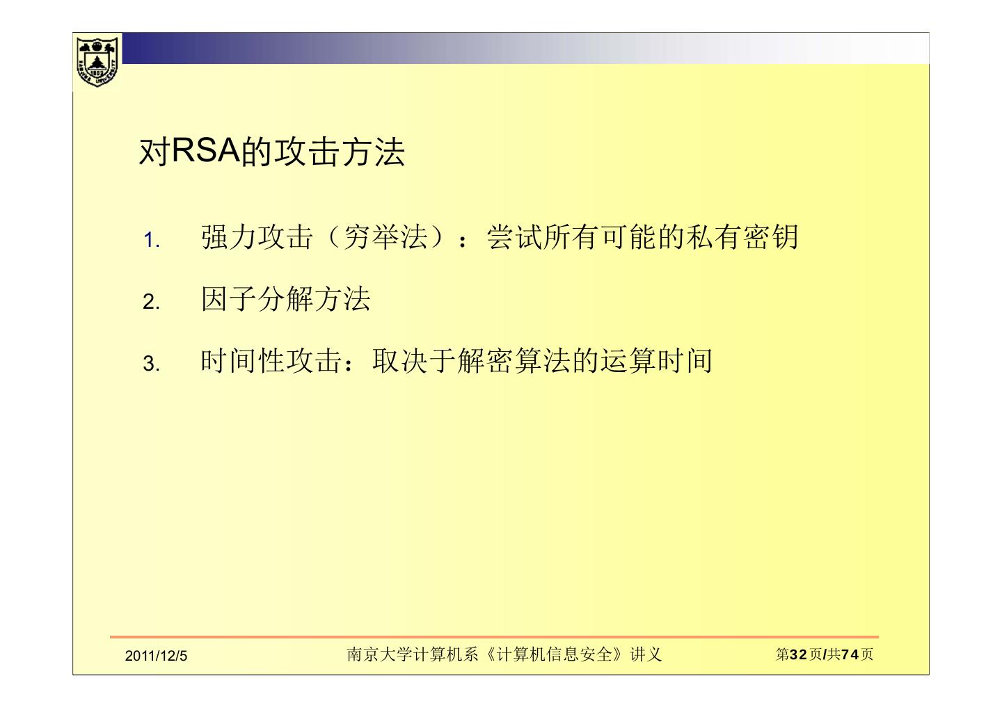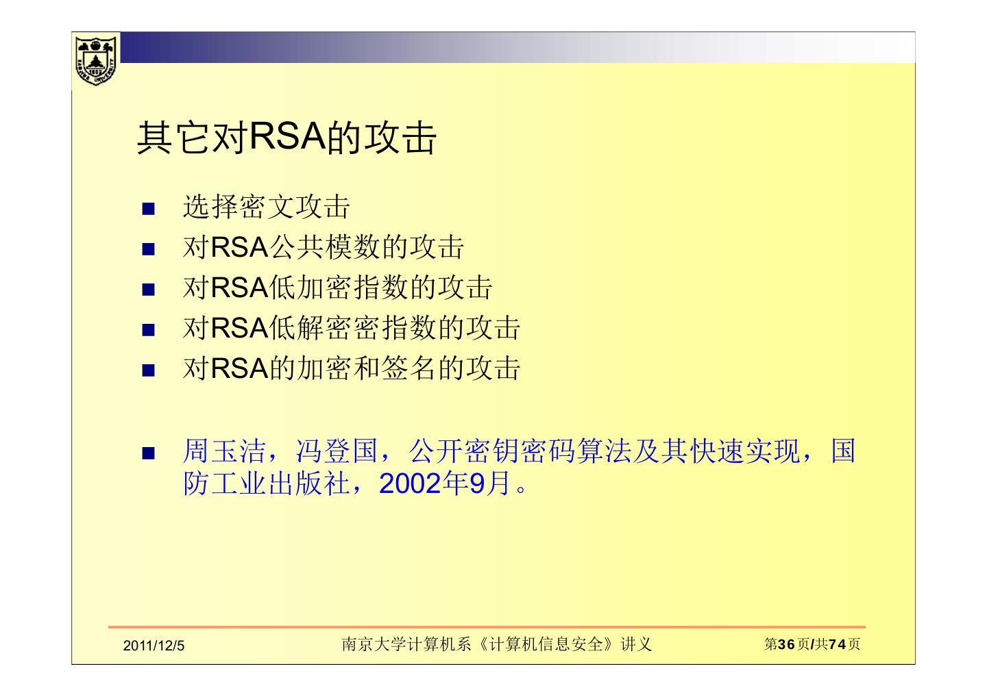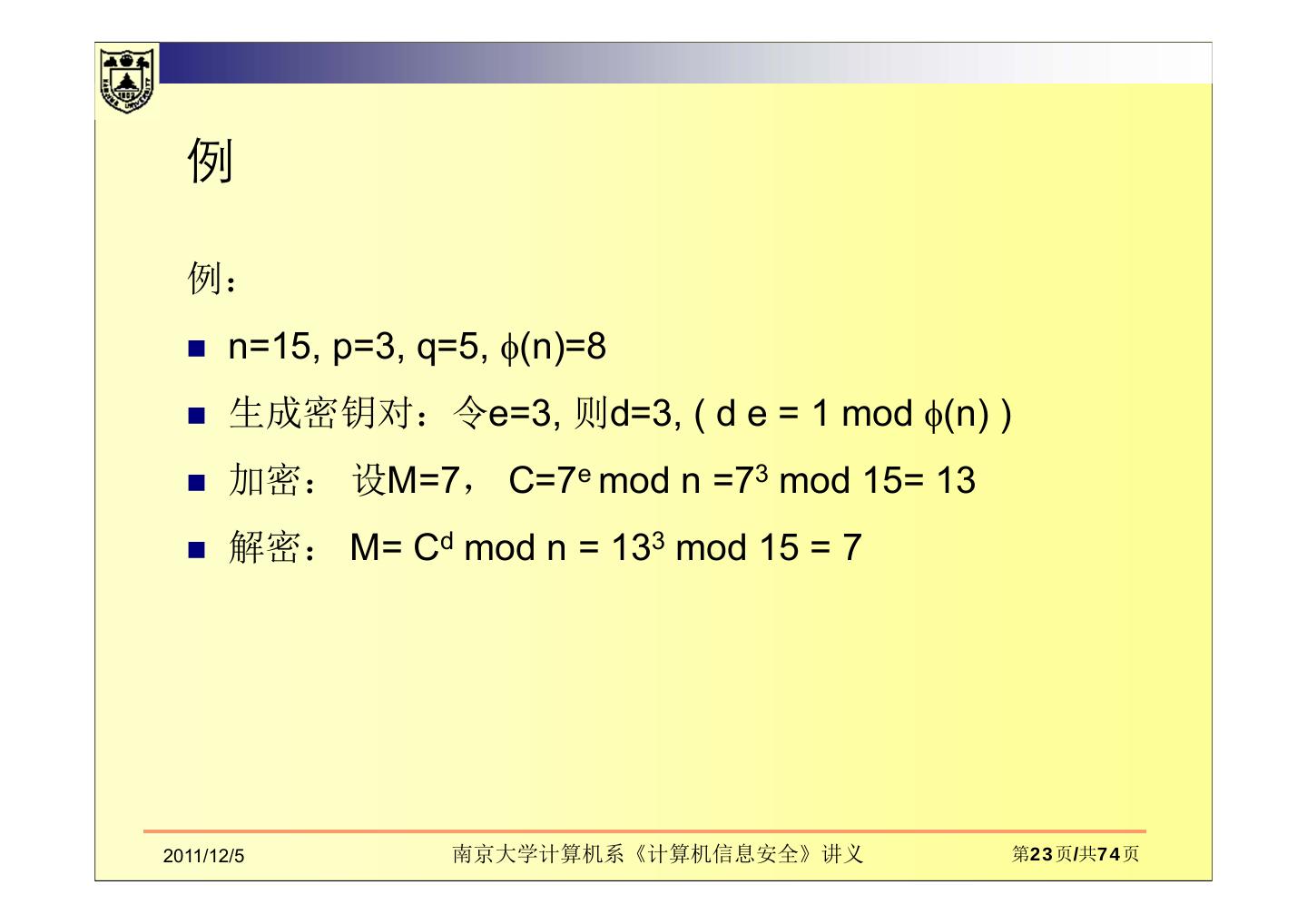 23 . 例 例: n=15, p=3, q=5, (n)=8 生成密钥对:令e=3, 则d=3, ( d e = 1 mod (n) ) 加密: 设M=7, C=7e mod n =73 mod 15= 13 解密: M= Cd mod n = 133 mod 15 = 7 2011/12/5 南京大学计算机系《计算机信息安全》讲义 第23页/共74页