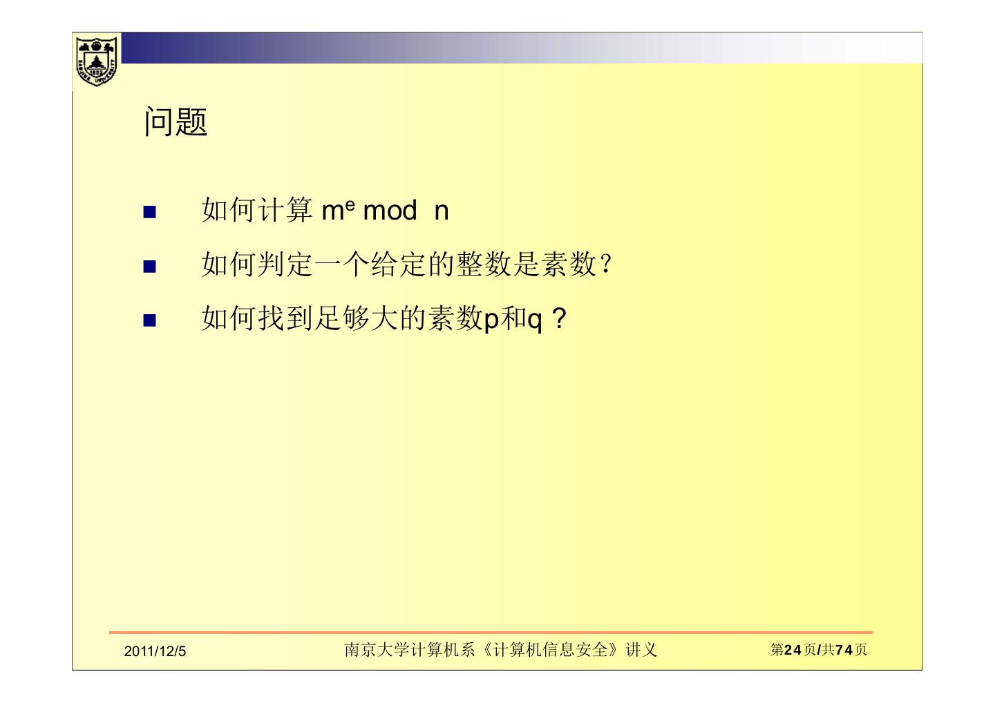 24 . 问题 如何计算 me mod n 如何判定一个给定的整数是素数? 如何找到足够大的素数p和q ? 2011/12/5 南京大学计算机系《计算机信息安全》讲义 第24页/共74页