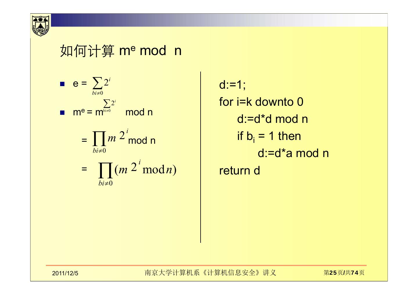 25 . 如何计算 me mod n e= 2 bi 0 i d:=1; 2 i for i=k downto 0 m =m e bi 0 mod n d:=d*d mod n = m 2 mod n i if bi = 1 then bi 0 d:=d*a mod n (m 2 mod n) i = return d bi 0 2011/12/5 南京大学计算机系《计算机信息安全》讲义 第25页/共74页