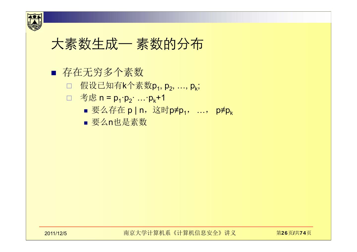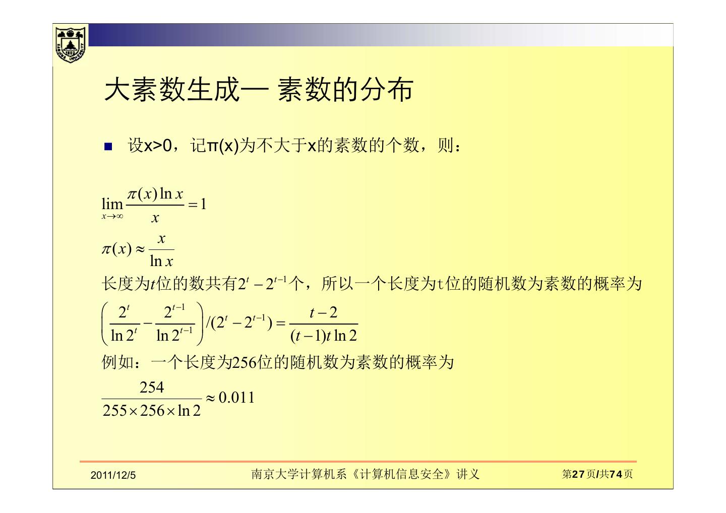 26 . 大素数生成— 素数的分布 存在无穷多个素数 假设已知有k个素数p1, p2, …, pk; 考虑 n = p1·p2· …·pk+1 要么存在 p | n,这时p≠p1, …, p≠pk 要么n也是素数 2011/12/5 南京大学计算机系《计算机信息安全》讲义 第26页/共74页