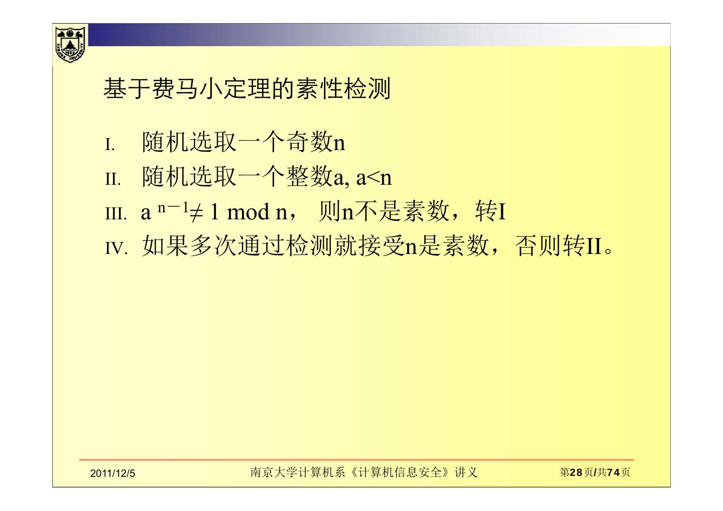 28 . 基于费马小定理的素性检测 I. 随机选取一个奇数n II. 随机选取一个整数a, a<n III. a n-1≠ 1 mod n, 则n不是素数,转I IV. 如果多次通过检测就接受n是素数,否则转II。 2011/12/5 南京大学计算机系《计算机信息安全》讲义 第28页/共74页