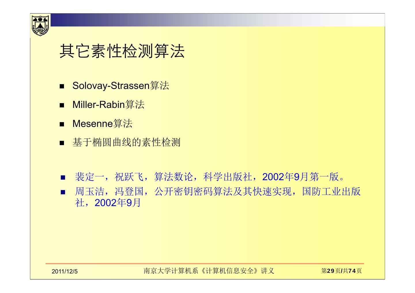 29 . 其它素性检测算法 Solovay-Strassen算法 Miller-Rabin算法 Mesenne算法 基于椭圆曲线的素性检测 裴定一,祝跃飞,算法数论,科学出版社,2002年9月第一版。 周玉洁,冯登国,公开密钥密码算法及其快速实现,国防工业出版 社,2002年9月 2011/12/5 南京大学计算机系《计算机信息安全》讲义 第29页/共74页