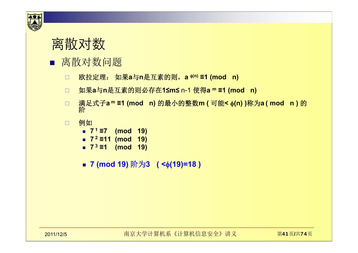 18 . 欧拉定理 欧拉定理: 如果a与n是互素的,则a (n) ≡1 (mod n) 如果a与n是互素,则 a•b=a •c (mod n) 推出:b=c ( mod n) 设S={x1, x2, ……, x (n) }是所有小于n且与n是互素的整数的集合。 因为a• xi=a •xj (mod n ), 则有 xi=xj (mod n ), {a•x1 (mod n ), a•x2 (mod n ), ……, a•x (n) (mod n )}=S (n) (n) a x (m od n ) x (m od n ) i 1 i i 1 i (n) (n) a (n) xi (mod n ) xi (mod n ) i 1 i 1 a (n) ≡1 (mod n) 2011/12/5 南京大学计算机系《计算机信息安全》讲义 第18页/共74页
