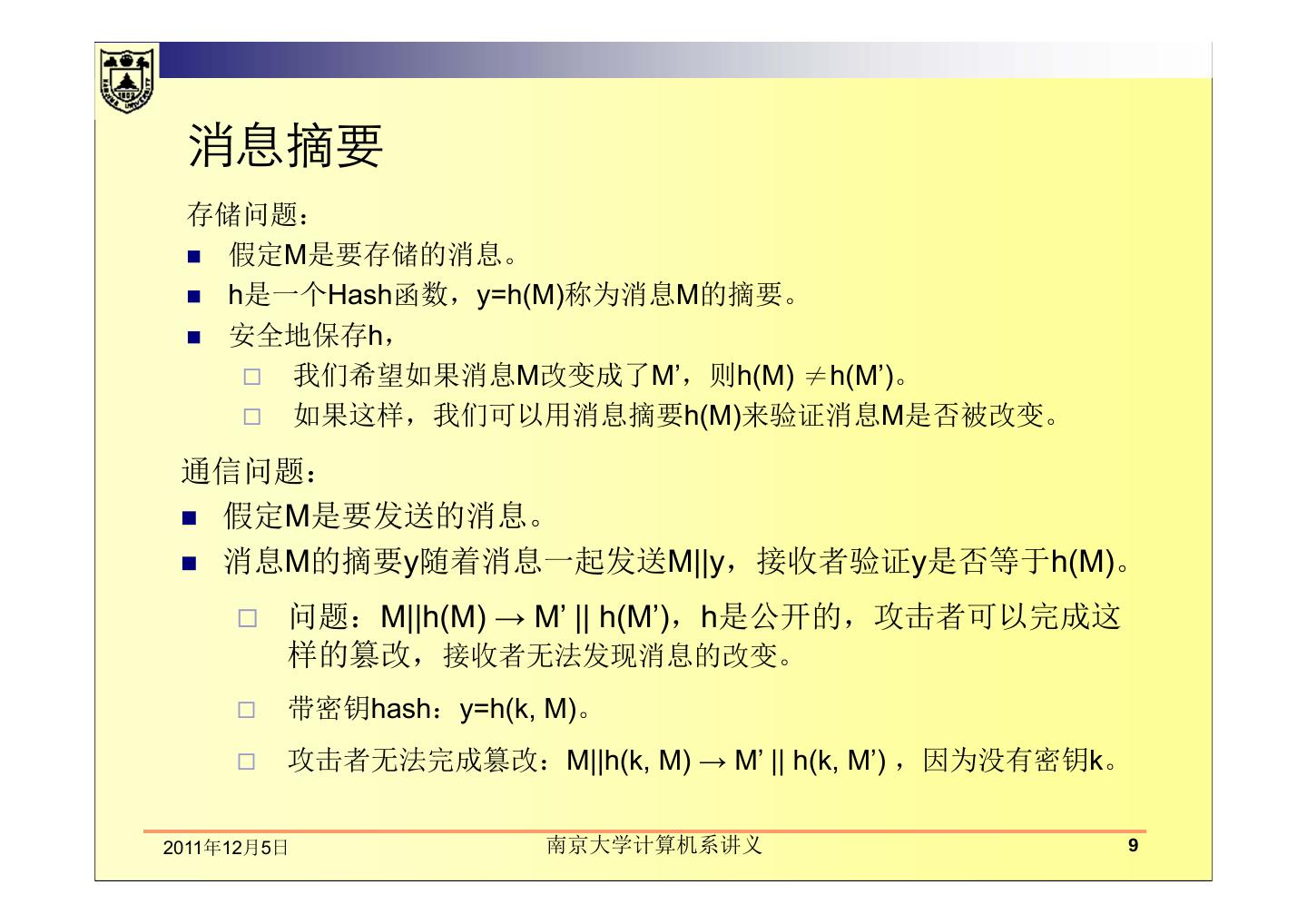 9 . 消息摘要 存储问题: 假定M是要存储的消息。 h是一个Hash函数,y=h(M)称为消息M的摘要。 安全地保存h, 我们希望如果消息M改变成了M’,则h(M) ≠h(M’)。 如果这样,我们可以用消息摘要h(M)来验证消息M是否被改变。 通信问题: 假定M是要发送的消息。 消息M的摘要y随着消息一起发送M||y,接收者验证y是否等于h(M)。 问题:M||h(M) → M’ || h(M’),h是公开的,攻击者可以完成这 样的篡改,接收者无法发现消息的改变。 带密钥hash:y=h(k, M)。 攻击者无法完成篡改:M||h(k, M) → M’ || h(k, M’) ,因为没有密钥k。 2011年12月5日 南京大学计算机系讲义 9