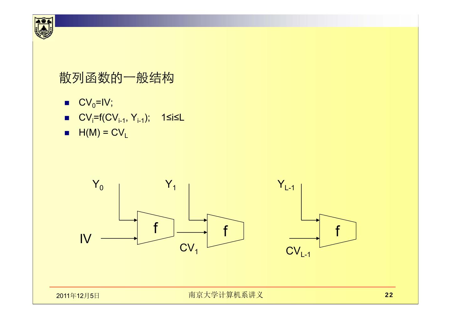 22 .散列函数的一般结构 CV0=IV; CVi=f(CVi-1, Yi-1); 1≤i≤L H(M) = CVL Y0 Y1 YL-1 f f f IV CV1 CVL-1 2011年12月5日 南京大学计算机系讲义 22