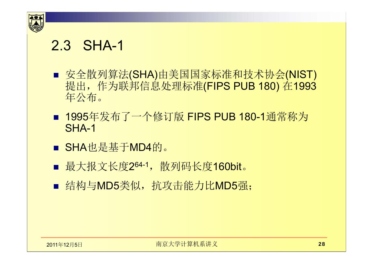 28 . 2.3 SHA-1 安全散列算法(SHA)由美国国家标准和技术协会(NIST) 提出,作为联邦信息处理标准(FIPS PUB 180) 在1993 年公布。 1995年发布了一个修订版 FIPS PUB 180-1通常称为 SHA-1 SHA也是基于MD4的。 最大报文长度264-1,散列码长度160bit。 结构与MD5类似,抗攻击能力比MD5强; 2011年12月5日 南京大学计算机系讲义 28