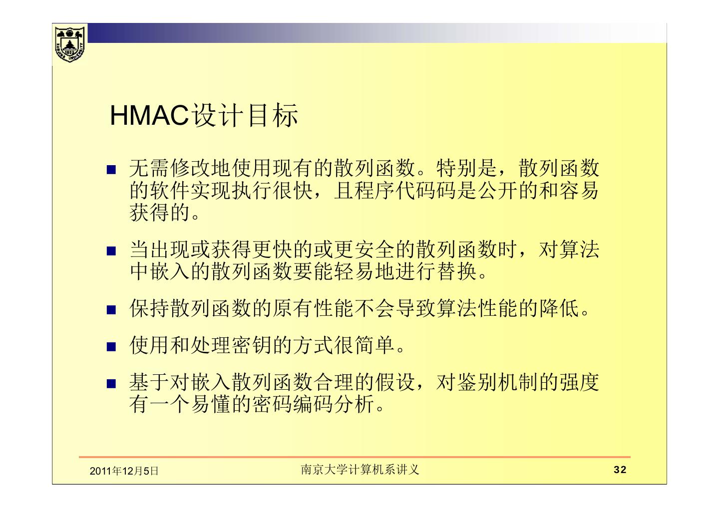 21 . 散列函数的密码分析 着重分析压缩函数f的内部结构,寻找对单次运行后就能 产生冲突的高效技术; 2011年12月5日 南京大学计算机系讲义 21