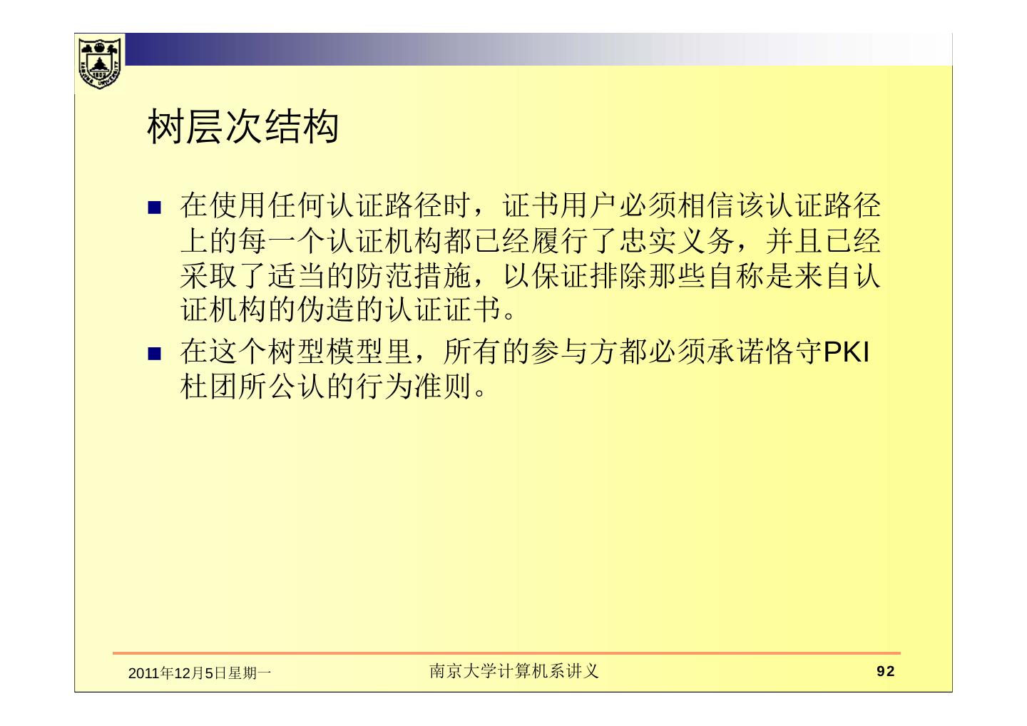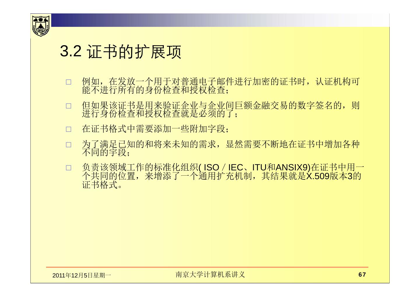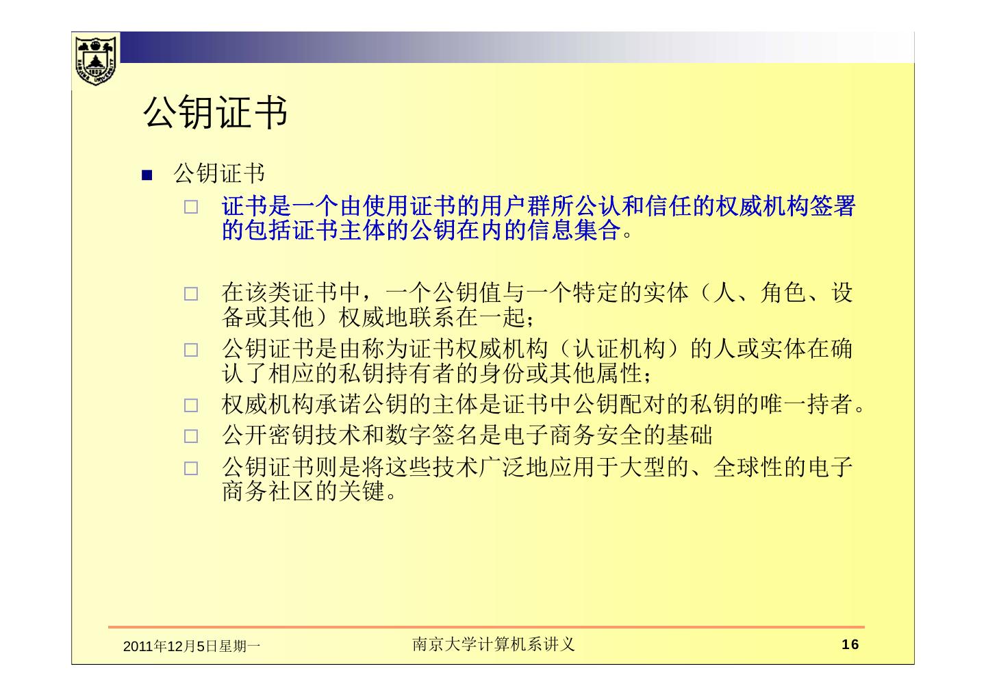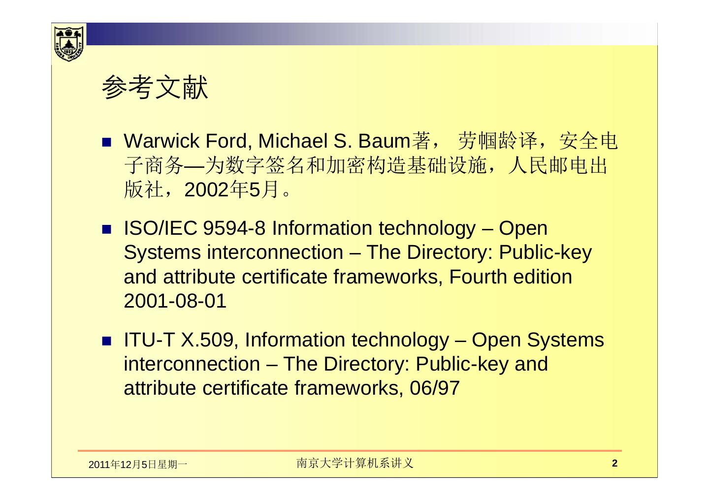 2 . 参考文献 Warwick Ford, Michael S. Baum著, 劳帼龄译,安全电 子商务—为数字签名和加密构造基础设施,人民邮电出 版社,2002年5月。 ISO/IEC 9594-8 Information technology – Open Systems interconnection – The Directory: Public-key and attribute certificate frameworks, Fourth edition 2001-08-01 ITU-T X.509, Information technology – Open Systems interconnection – The Directory: Public-key and attribute certificate frameworks, 06/97 2011年12月5日星期一 南京大学计算机系讲义 2