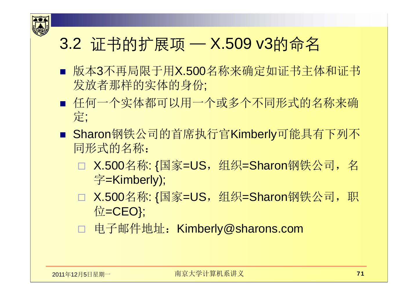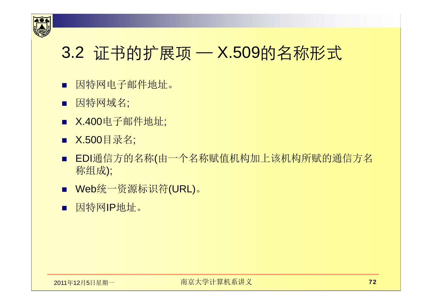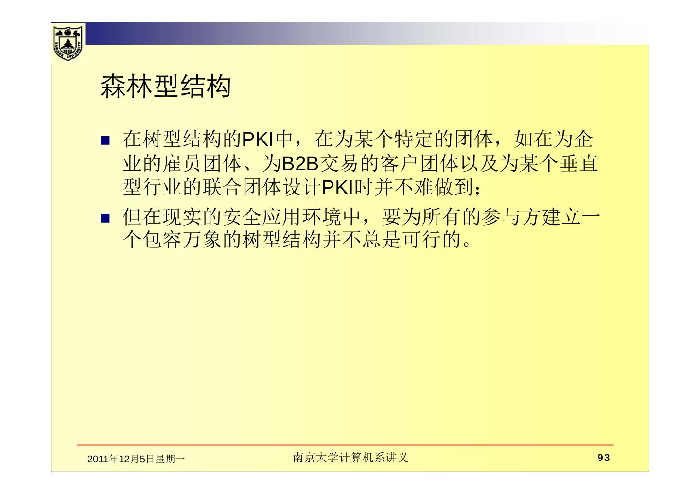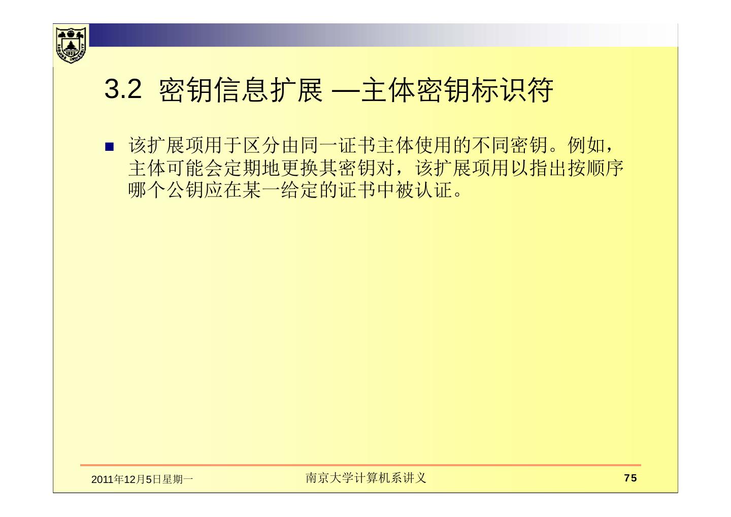 2 . 参考文献 Warwick Ford, Michael S. Baum著, 劳帼龄译,安全电 子商务—为数字签名和加密构造基础设施,人民邮电出 版社,2002年5月。 ISO/IEC 9594-8 Information technology – Open Systems interconnection – The Directory: Public-key and attribute certificate frameworks, Fourth edition 2001-08-01 ITU-T X.509, Information technology – Open Systems interconnection – The Directory: Public-key and attribute certificate frameworks, 06/97 2011年12月5日星期一 南京大学计算机系讲义 2