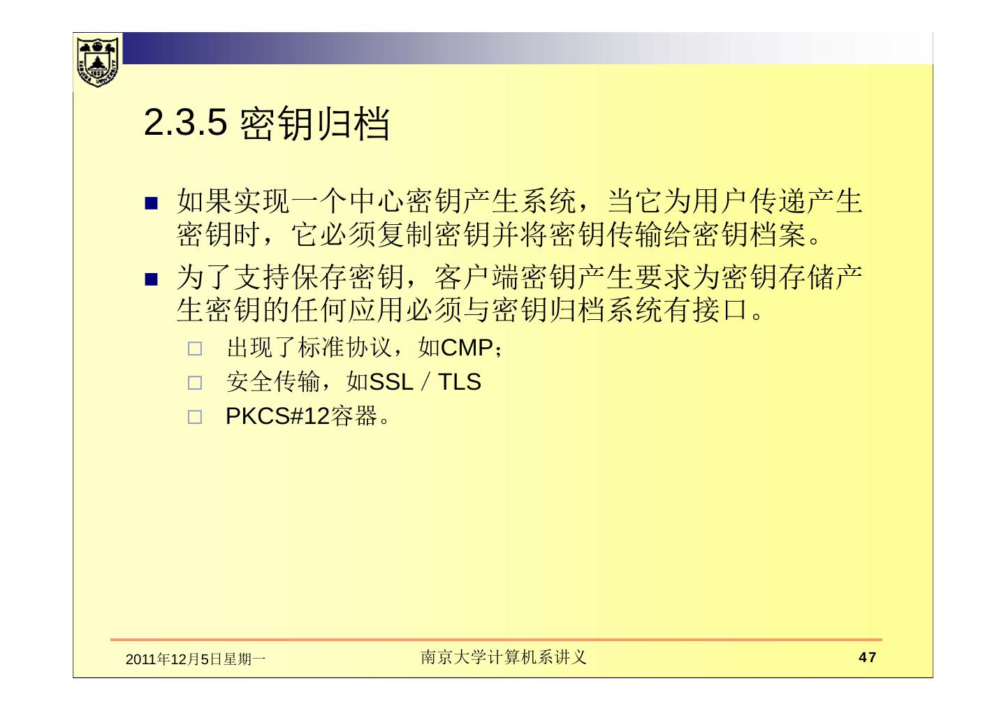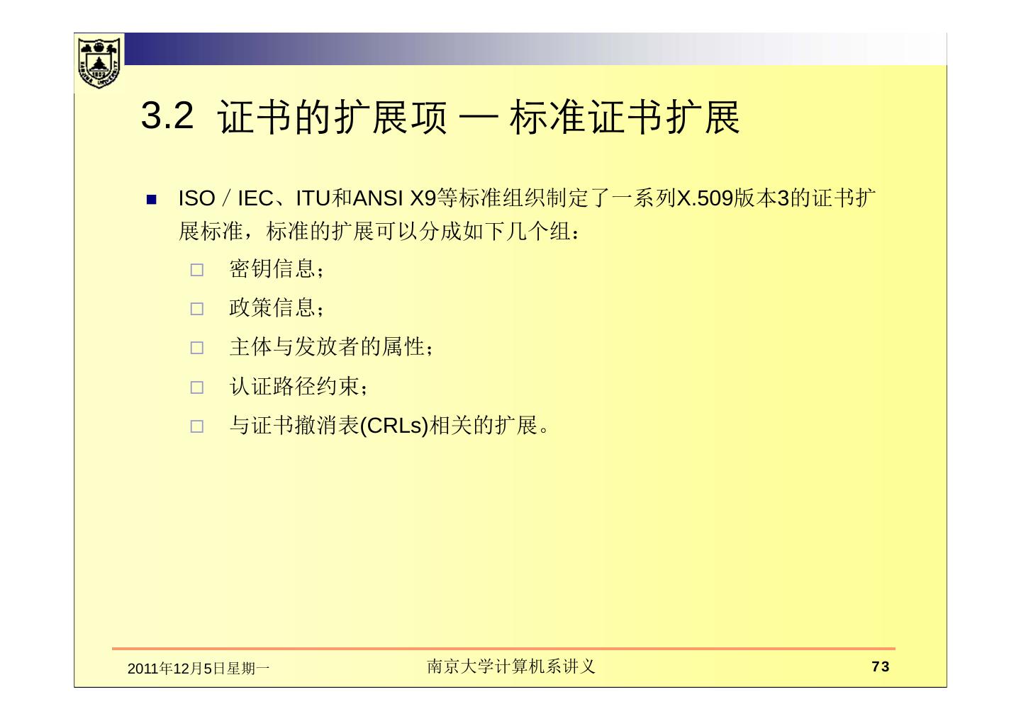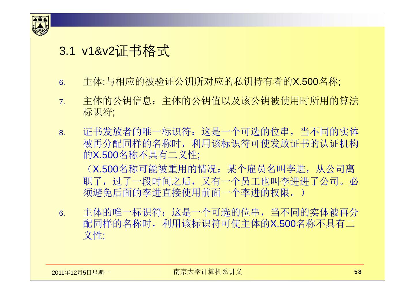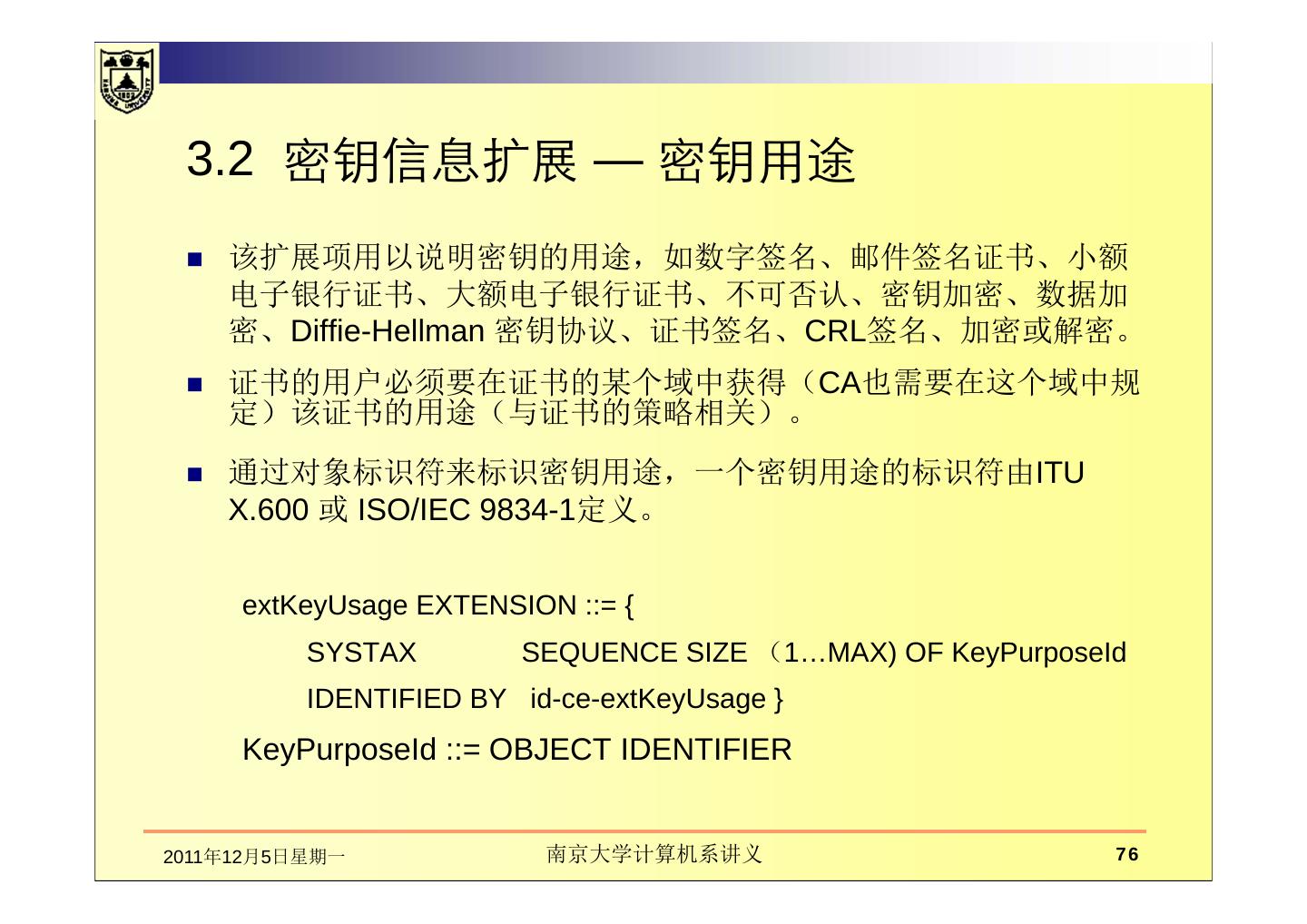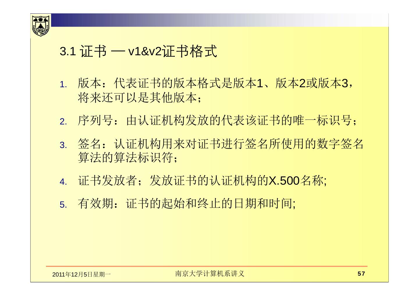 2 . 参考文献 Warwick Ford, Michael S. Baum著, 劳帼龄译,安全电 子商务—为数字签名和加密构造基础设施,人民邮电出 版社,2002年5月。 ISO/IEC 9594-8 Information technology – Open Systems interconnection – The Directory: Public-key and attribute certificate frameworks, Fourth edition 2001-08-01 ITU-T X.509, Information technology – Open Systems interconnection – The Directory: Public-key and attribute certificate frameworks, 06/97 2011年12月5日星期一 南京大学计算机系讲义 2