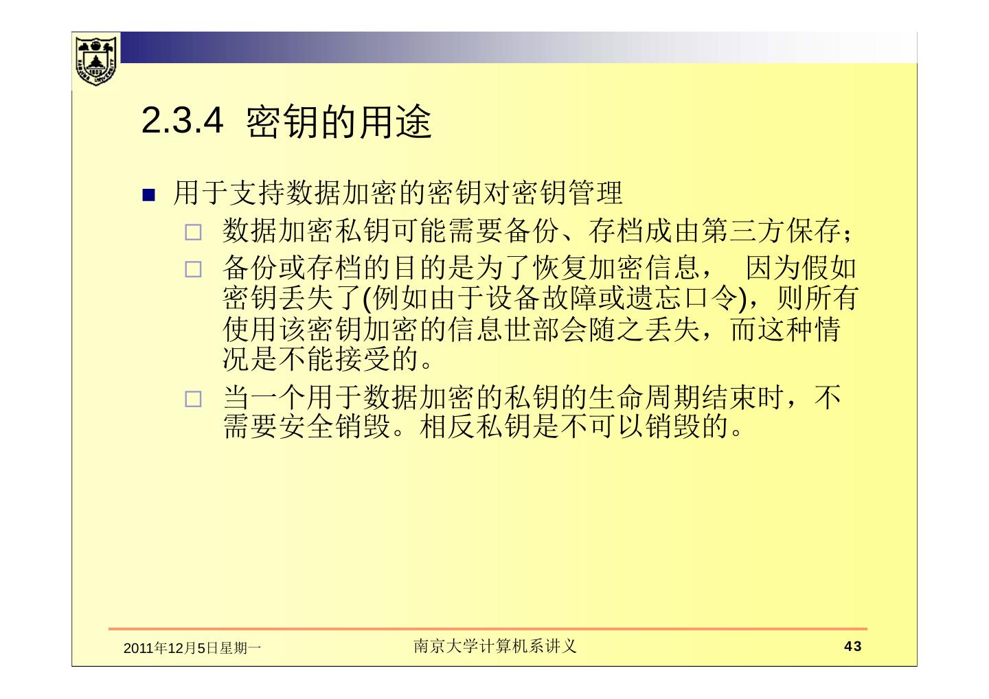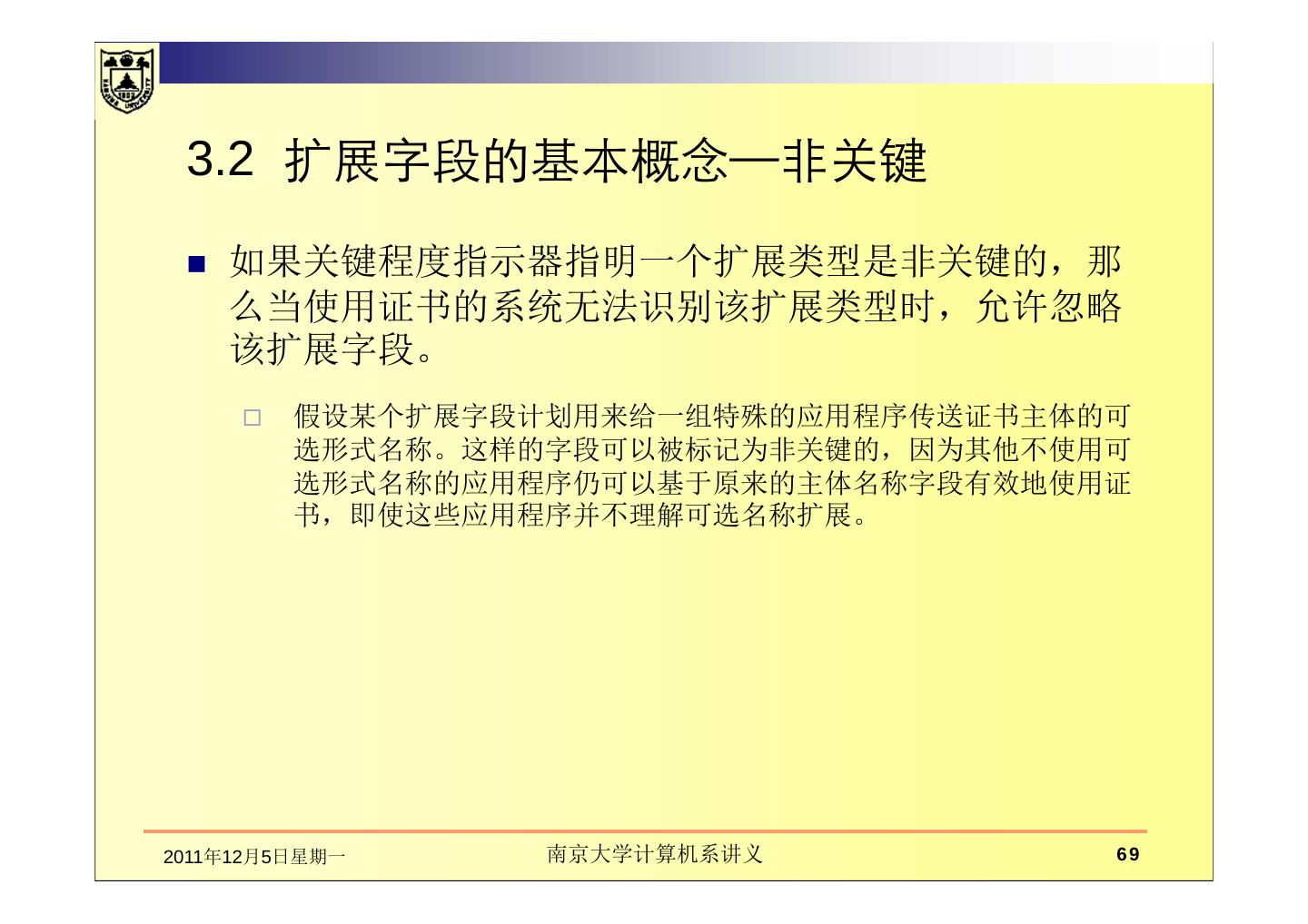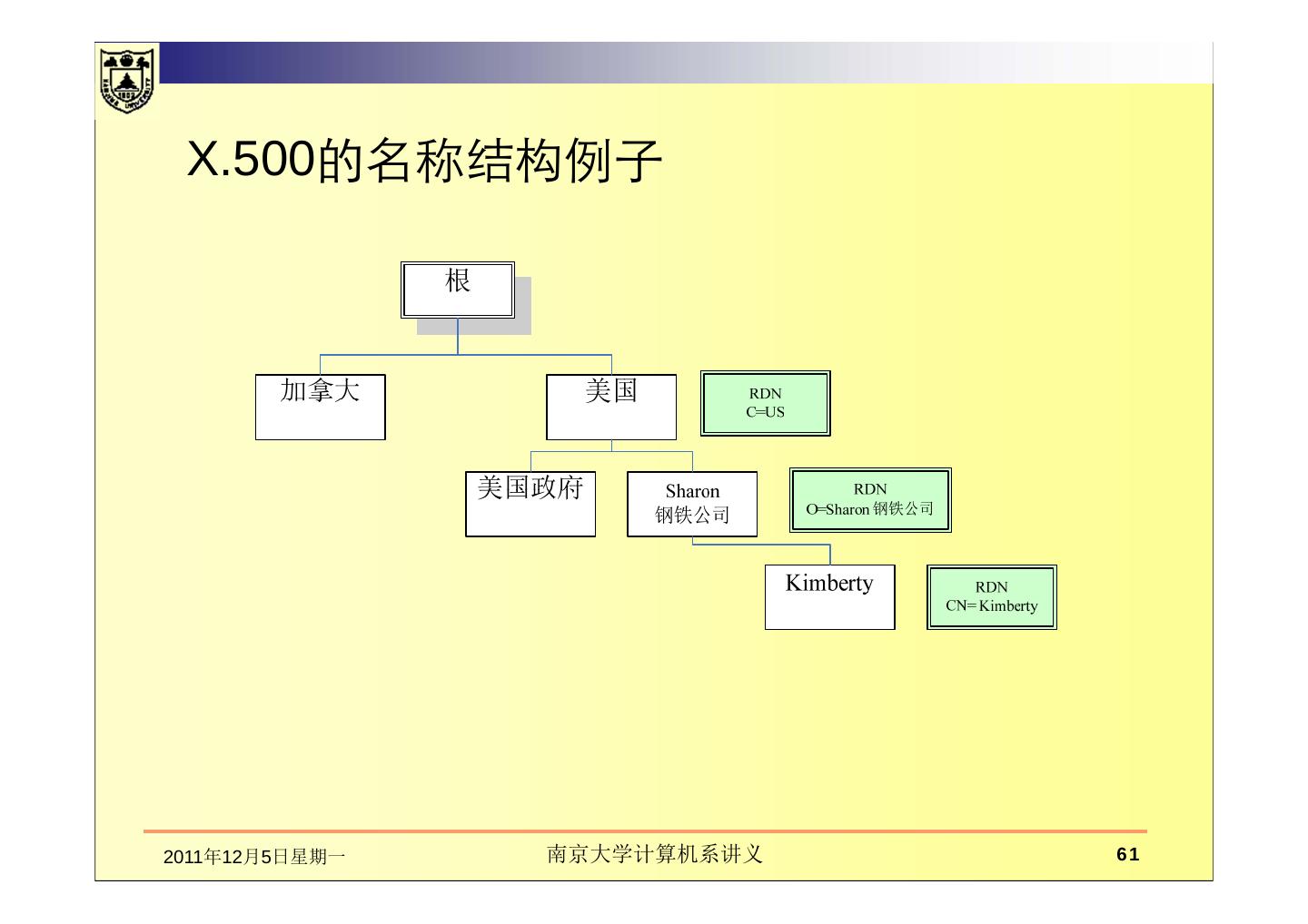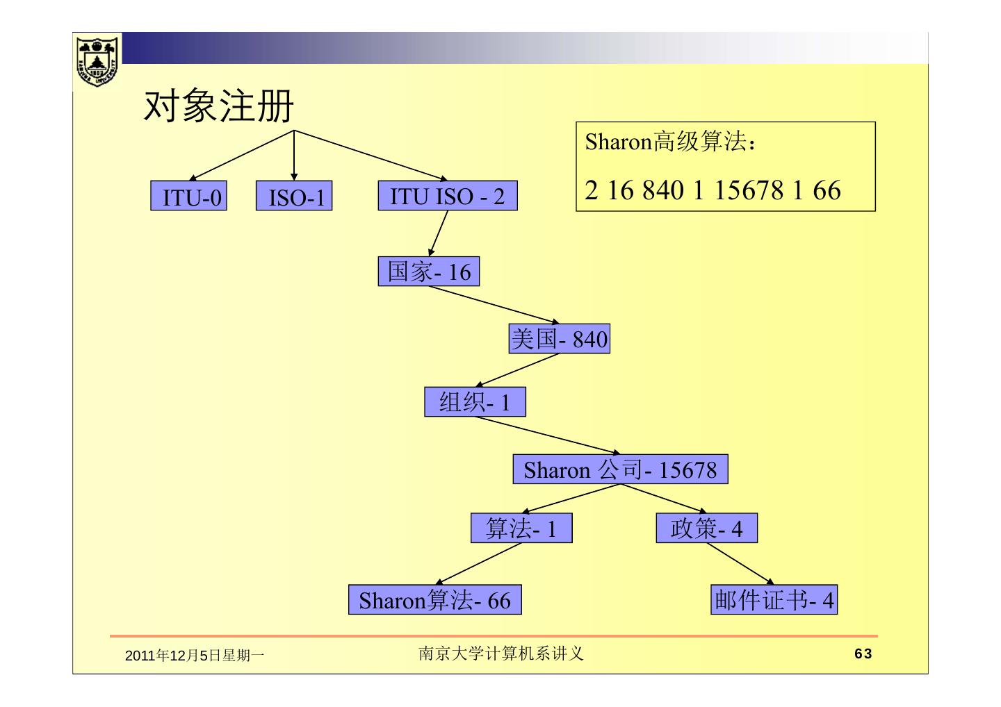 2 . 参考文献 Warwick Ford, Michael S. Baum著, 劳帼龄译,安全电 子商务—为数字签名和加密构造基础设施,人民邮电出 版社,2002年5月。 ISO/IEC 9594-8 Information technology – Open Systems interconnection – The Directory: Public-key and attribute certificate frameworks, Fourth edition 2001-08-01 ITU-T X.509, Information technology – Open Systems interconnection – The Directory: Public-key and attribute certificate frameworks, 06/97 2011年12月5日星期一 南京大学计算机系讲义 2