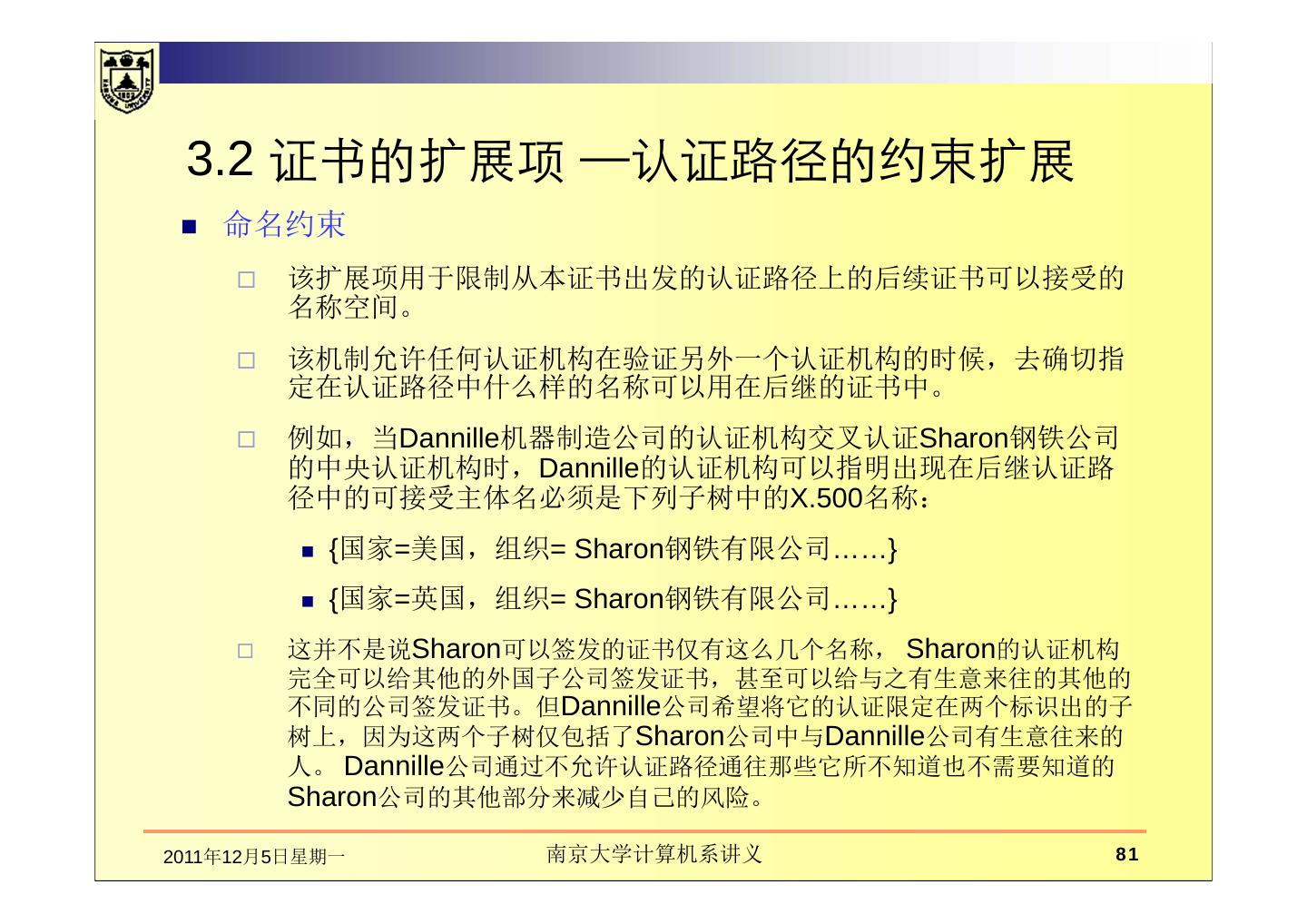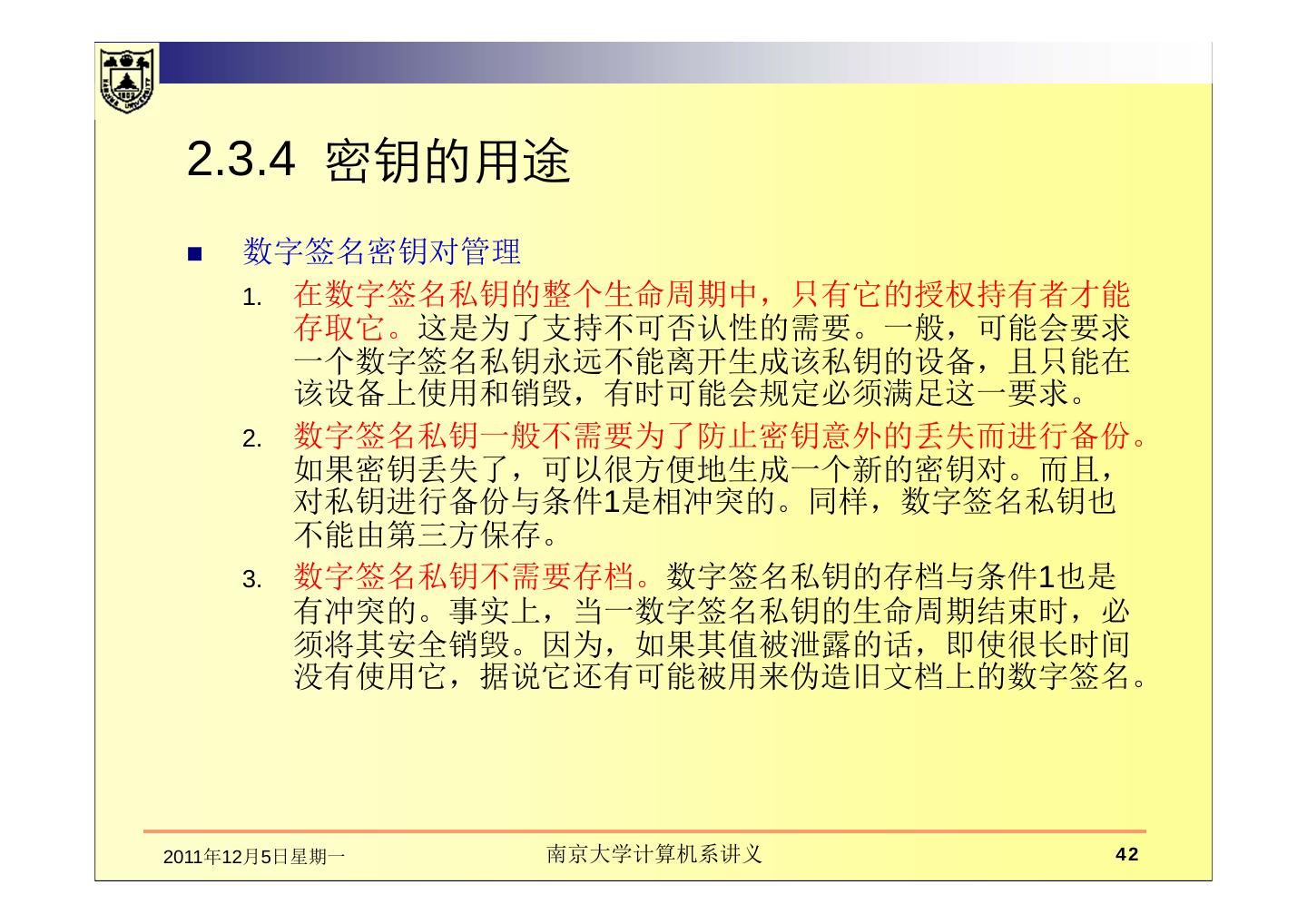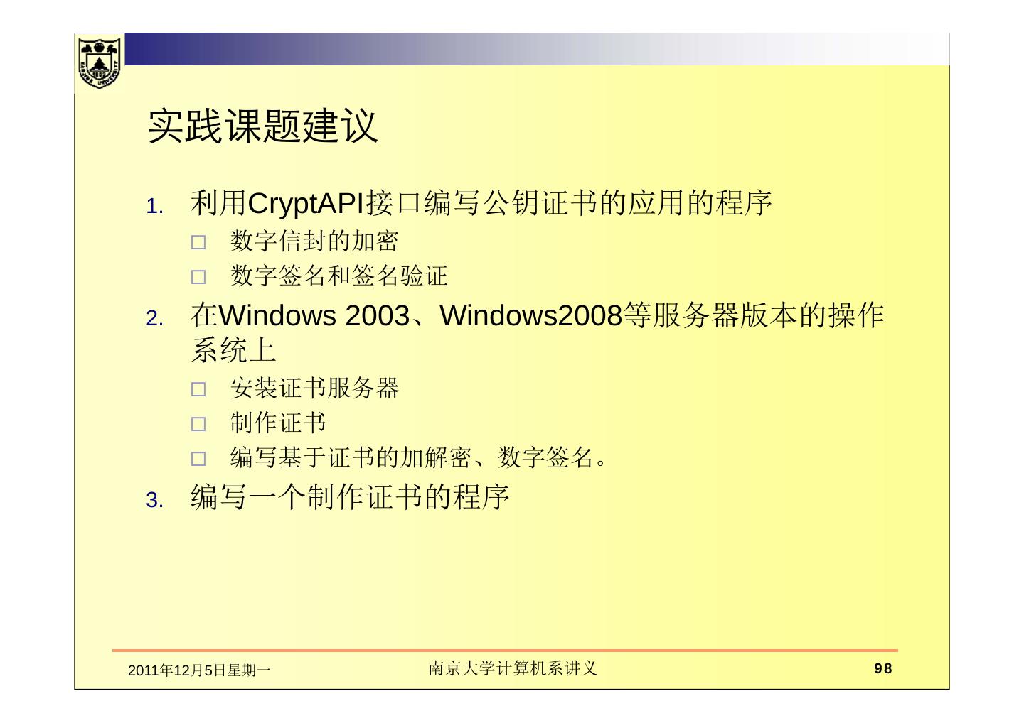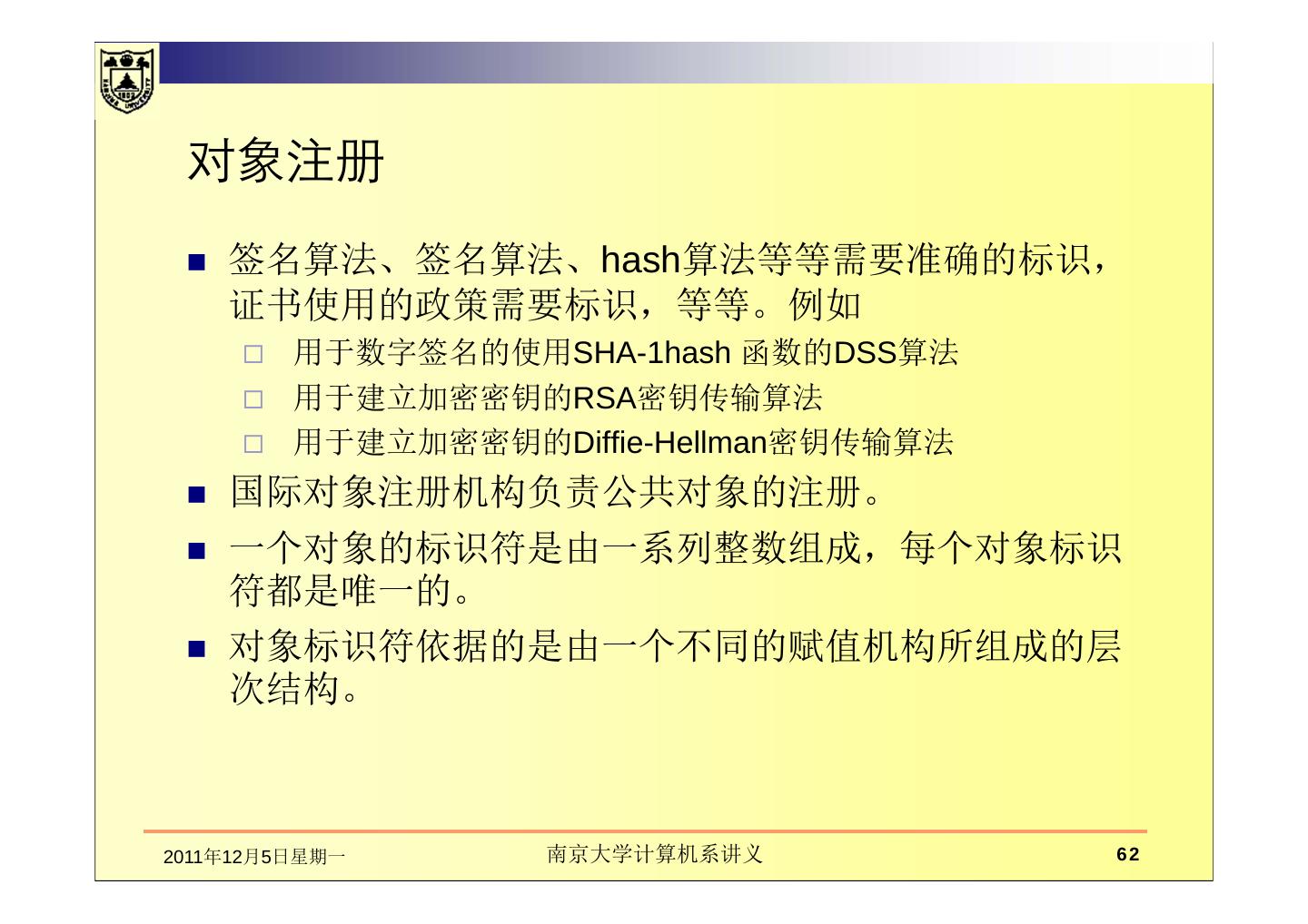 2 . 参考文献 Warwick Ford, Michael S. Baum著, 劳帼龄译,安全电 子商务—为数字签名和加密构造基础设施,人民邮电出 版社,2002年5月。 ISO/IEC 9594-8 Information technology – Open Systems interconnection – The Directory: Public-key and attribute certificate frameworks, Fourth edition 2001-08-01 ITU-T X.509, Information technology – Open Systems interconnection – The Directory: Public-key and attribute certificate frameworks, 06/97 2011年12月5日星期一 南京大学计算机系讲义 2