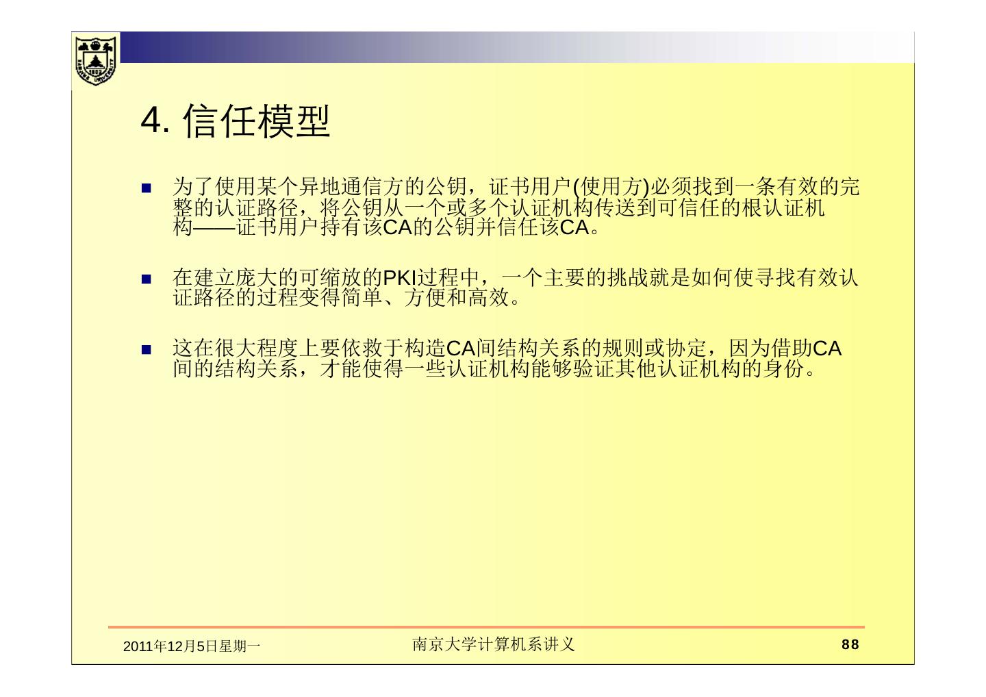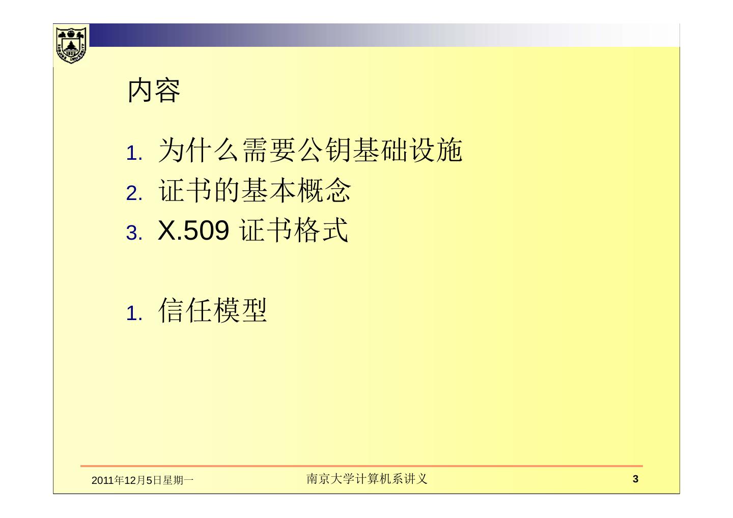3 . 内容 1. 为什么需要公钥基础设施 2. 证书的基本概念 3. X.509 证书格式 1. 信任模型 2011年12月5日星期一 南京大学计算机系讲义 3