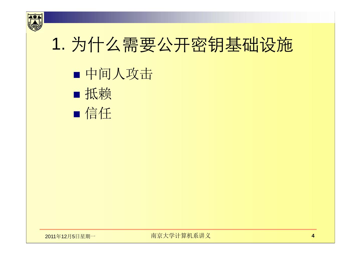 4 . 1. 为什么需要公开密钥基础设施 中间人攻击 抵赖 信任 2011年12月5日星期一 南京大学计算机系讲义 4