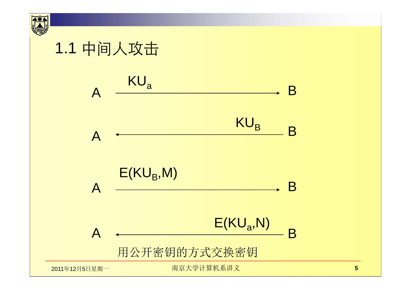 5 .1.1 中间人攻击 KUa A B KUB A B E(KUB,M) A B E(KUa,N) A B 用公开密钥的方式交换密钥 2011年12月5日星期一 南京大学计算机系讲义 5