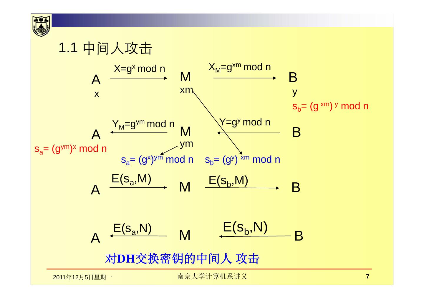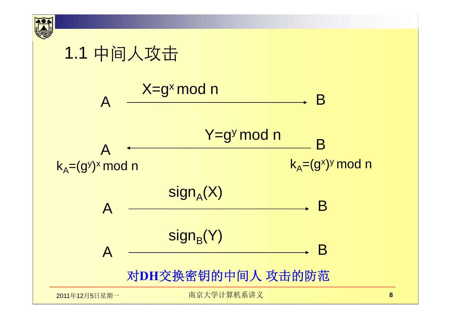 7 . 1.1 中间人攻击 X=gx mod n XM=gxm mod n A M B x xm y sb= (g xm) y mod n YM=gym mod n Y=gy mod n A M B ym sa= (gym)x mod n sa= (gx)ym mod n sb= (gy) xm mod n E(sa,M) E(sb,M) A M B E(sa,N) E(sb,N) A M B 对DH交换密钥的中间人 攻击 2011年12月5日星期一 南京大学计算机系讲义 7
