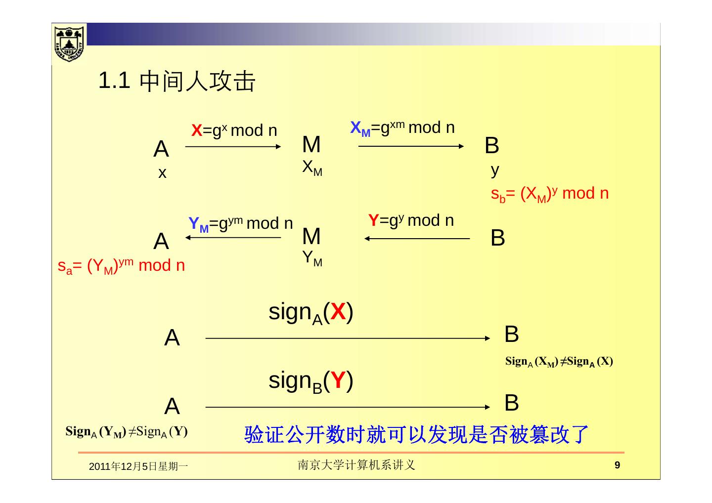 9 . 1.1 中间人攻击 X=gx mod n XM=gxm mod n A M B x XM y sb= (XM)y mod n YM=gym mod n Y=gy mod n A M B YM sa= (YM)ym mod n signA(X) A B SignA (XM) ≠SignA (X) signB(Y) A B SignA (YM) ≠SignA (Y) 验证公开数时就可以发现是否被篡改了 2011年12月5日星期一 南京大学计算机系讲义 9