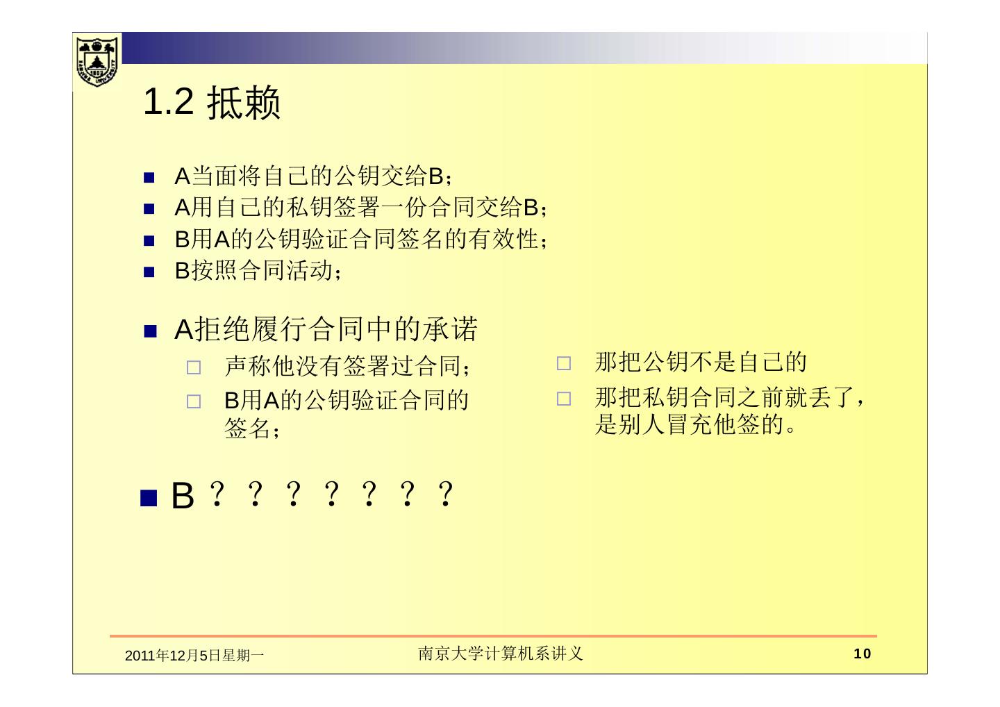 10 . 1.2 抵赖 A当面将自己的公钥交给B; A用自己的私钥签署一份合同交给B; B用A的公钥验证合同签名的有效性; B按照合同活动; A拒绝履行合同中的承诺 声称他没有签署过合同; 那把公钥不是自己的 B用A的公钥验证合同的 那把私钥合同之前就丢了, 签名; 是别人冒充他签的。 B ??????? 2011年12月5日星期一 南京大学计算机系讲义 10