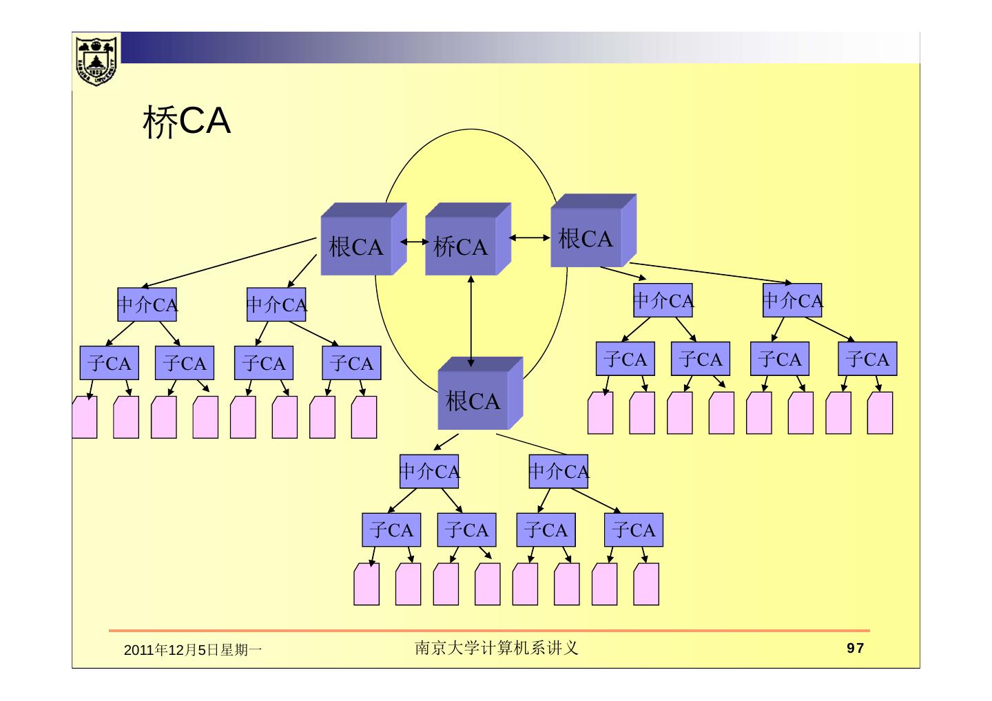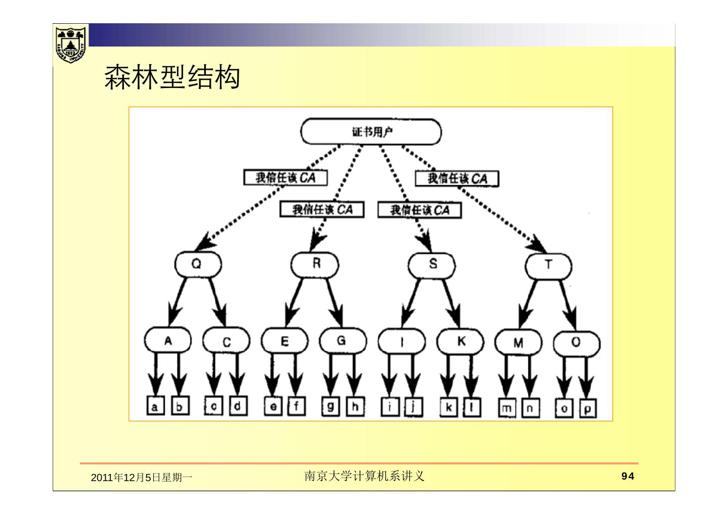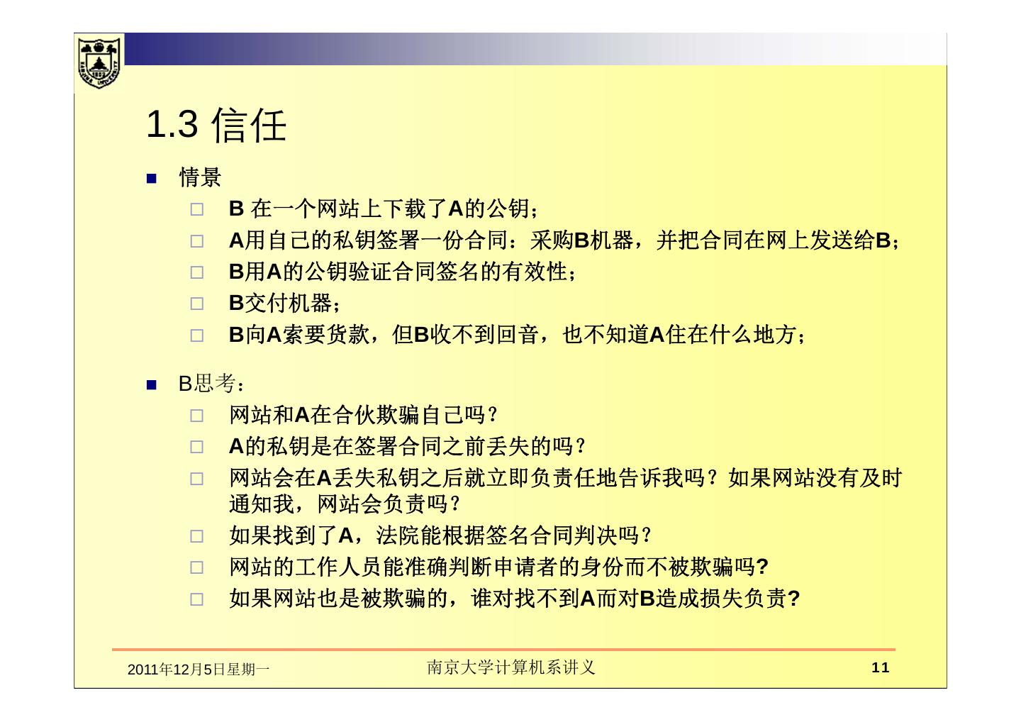 11 . 1.3 信任 情景 B 在一个网站上下载了A的公钥; A用自己的私钥签署一份合同:采购B机器,并把合同在网上发送给B; B用A的公钥验证合同签名的有效性; B交付机器; B向A索要货款,但B收不到回音,也不知道A住在什么地方; B思考: 网站和A在合伙欺骗自己吗? A的私钥是在签署合同之前丢失的吗? 网站会在A丢失私钥之后就立即负责任地告诉我吗?如果网站没有及时 通知我,网站会负责吗? 如果找到了A,法院能根据签名合同判决吗? 网站的工作人员能准确判断申请者的身份而不被欺骗吗? 如果网站也是被欺骗的,谁对找不到A而对B造成损失负责? 2011年12月5日星期一 南京大学计算机系讲义 11